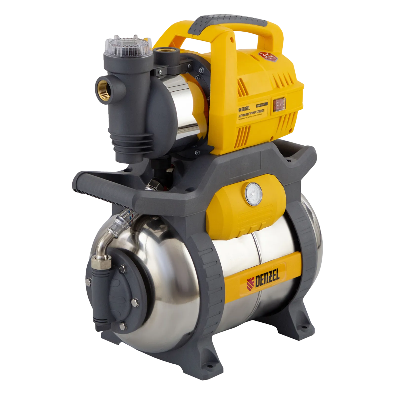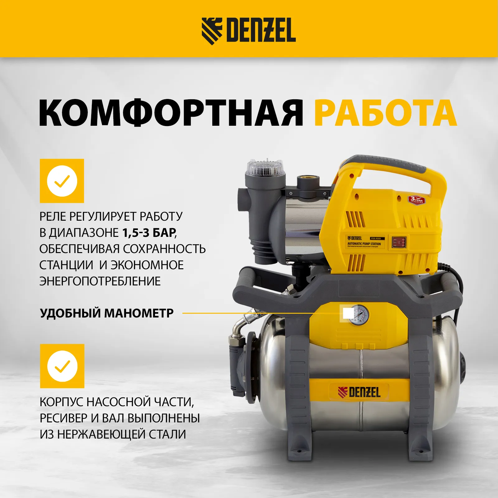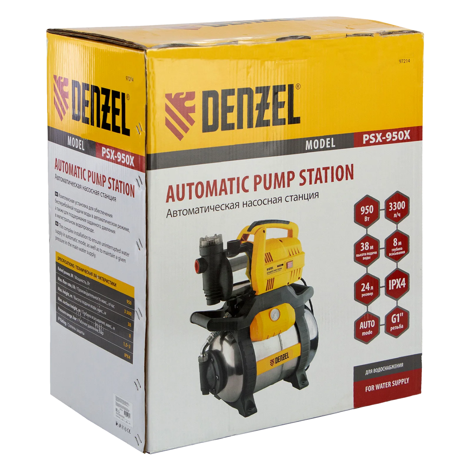 Насосная станция Denzel PSX950X 97214 мощностью 950 Вт и производительностью 3300 л/ч, с ресивером объемом 24 л из «нержавейки», обеспечивает подъем воды на высоту 38 м. Подходит для организации системы водоснабжения в загородном доме. Скорости перекачки до 3300 л/ч достаточно для обеспечения работы нескольких потребителей — в ванной, на кухне и в системе полива. Насосная станция способна выкачивать чистую воду из резервуаров и колодцев глубиной до 8 м. Гидроаккумулятор позволяет снизить частоту включений двигателя, а также обеспечивает запас воды в системе на случай отключения электричества.