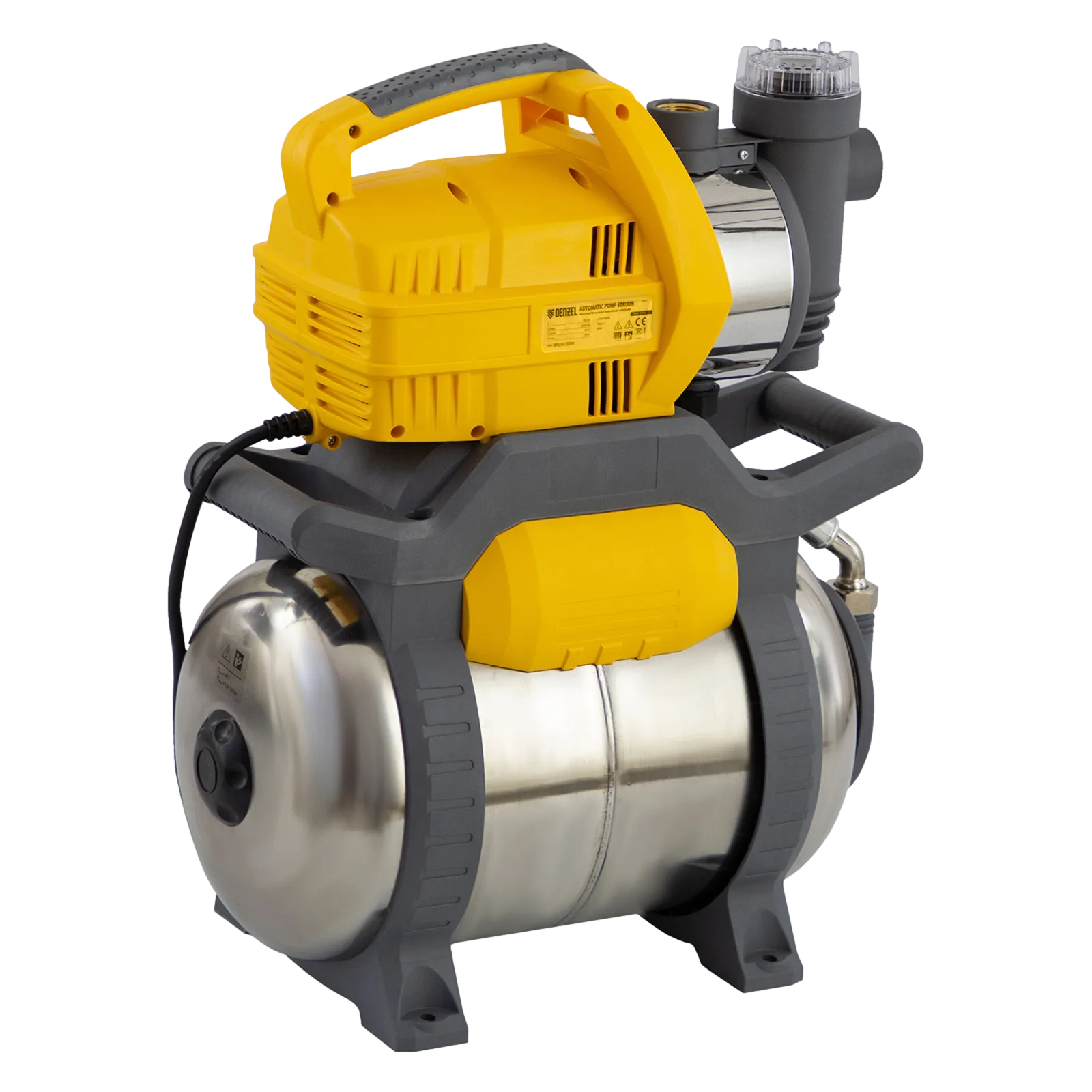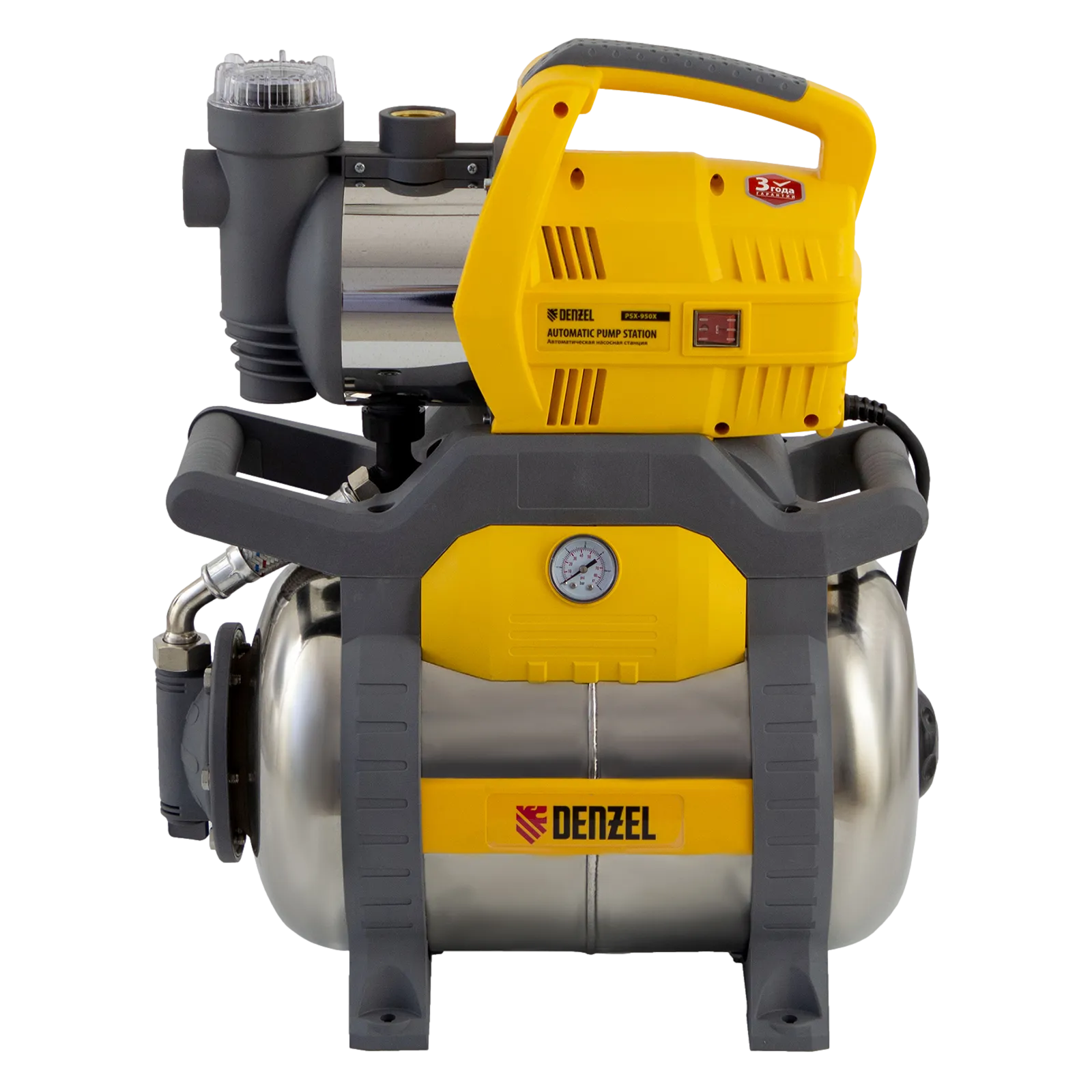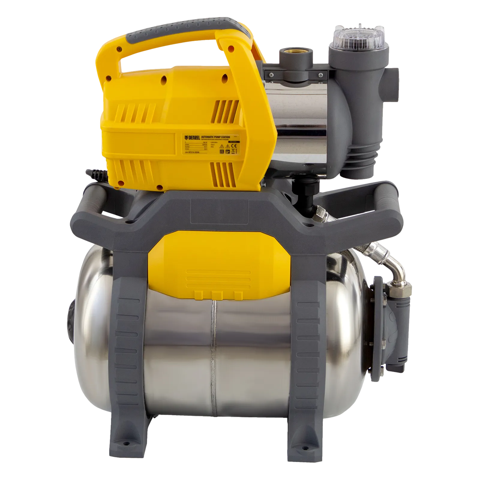 Насосная станция Denzel PSX950X 97214 мощностью 950 Вт и производительностью 3300 л/ч, с ресивером объемом 24 л из «нержавейки», обеспечивает подъем воды на высоту 38 м. Подходит для организации системы водоснабжения в загородном доме. Скорости перекачки до 3300 л/ч достаточно для обеспечения работы нескольких потребителей — в ванной, на кухне и в системе полива. Насосная станция способна выкачивать чистую воду из резервуаров и колодцев глубиной до 8 м. Гидроаккумулятор позволяет снизить частоту включений двигателя, а также обеспечивает запас воды в системе на случай отключения электричества.