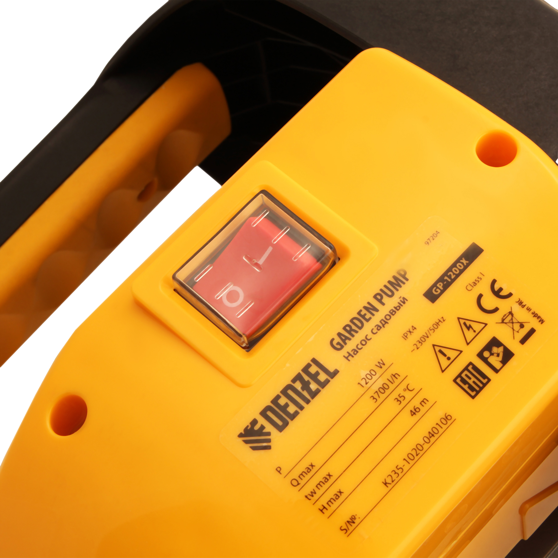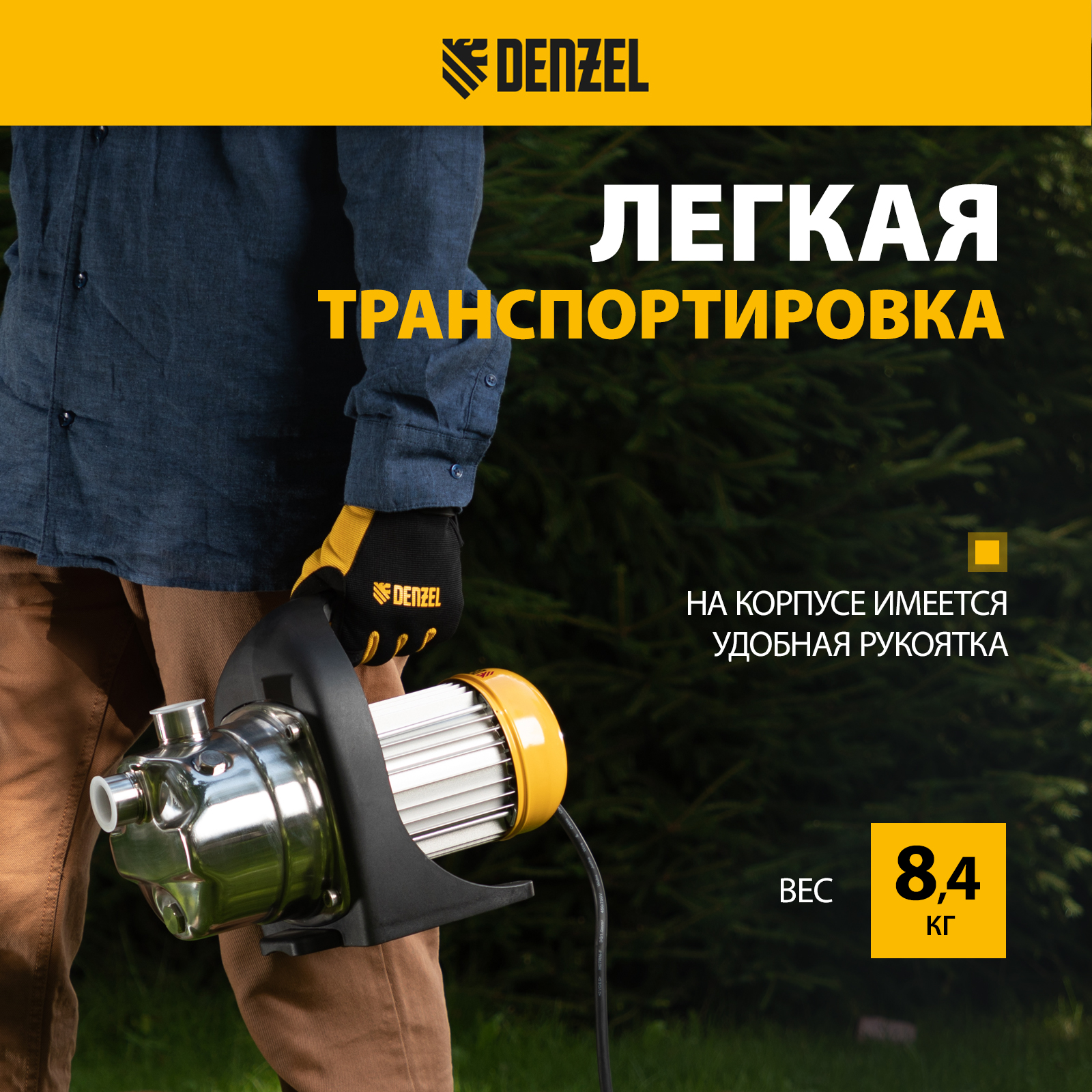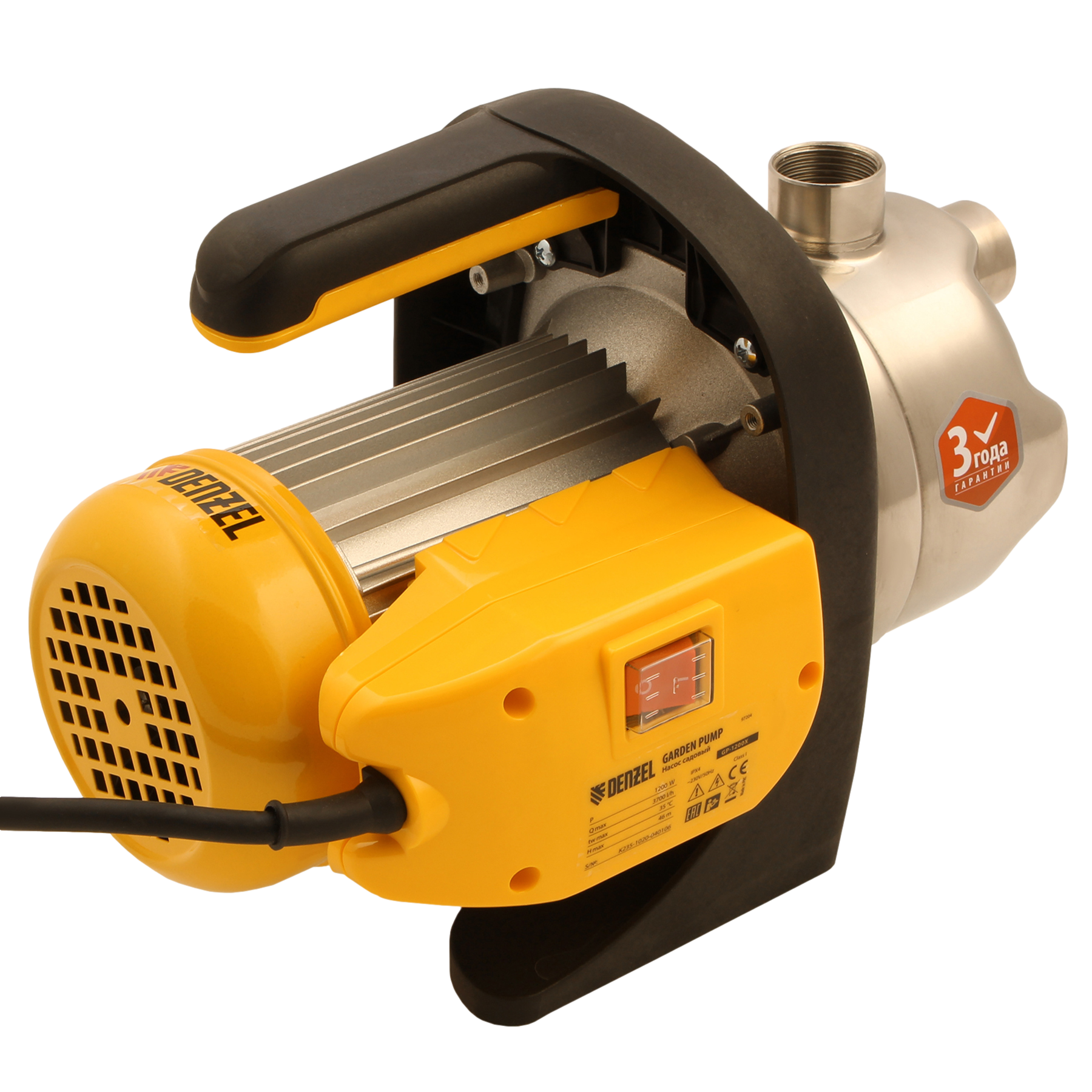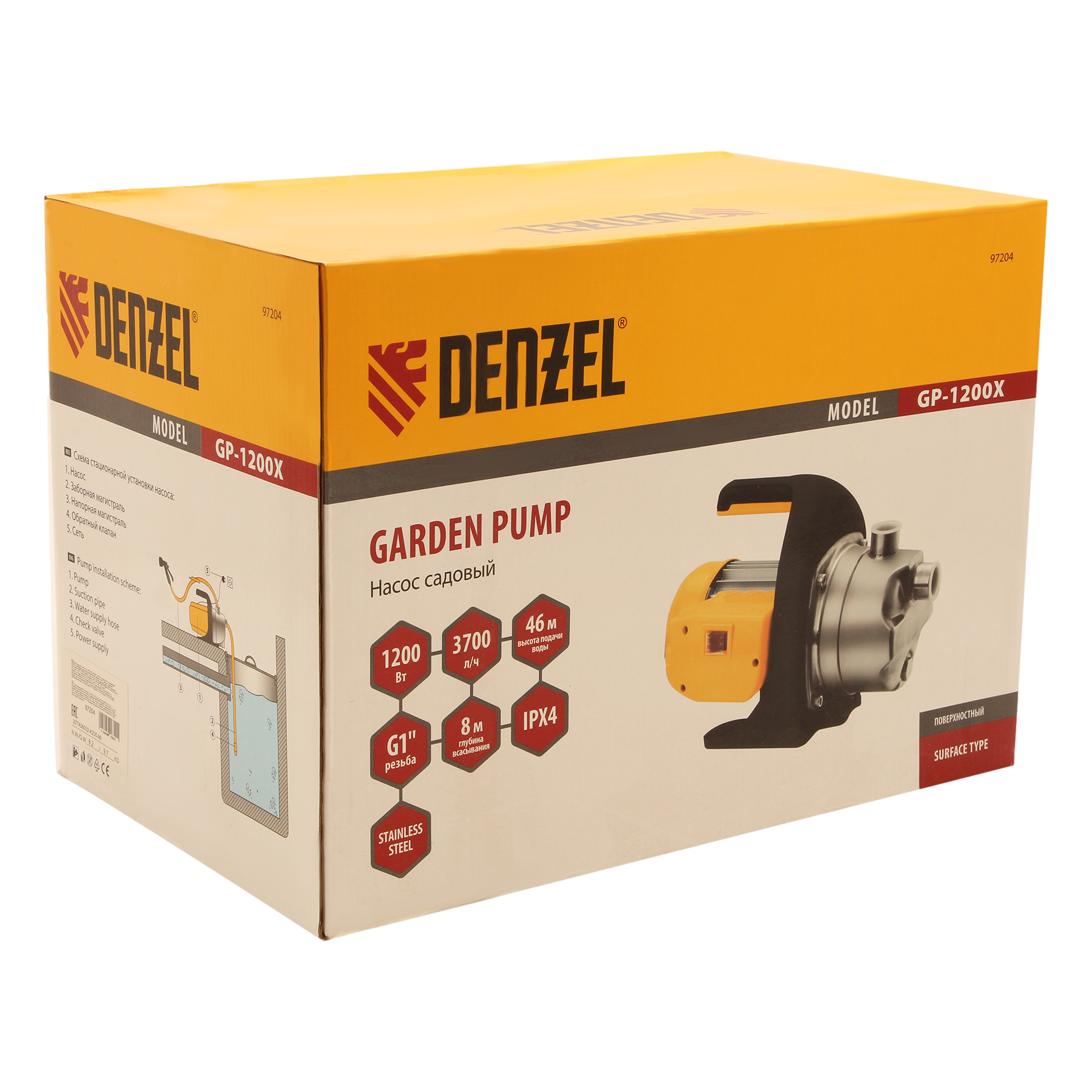 Садовый поверхностный насос Denzel GP1200X 97204 с корпусом насосной части из «нержавейки», мощностью 1200 Вт и производительностью 3700 л/ч, способен забирать чистую воду с глубины до 8 м из колодцев, емкостей и водоемов и подавать ее на высоту до 46 м. Обеспечивает стабильный напор и используется для организации системы полива и водоснабжения на даче. Производительности хватает для одновременного снабжения нескольких водоразборных точек.