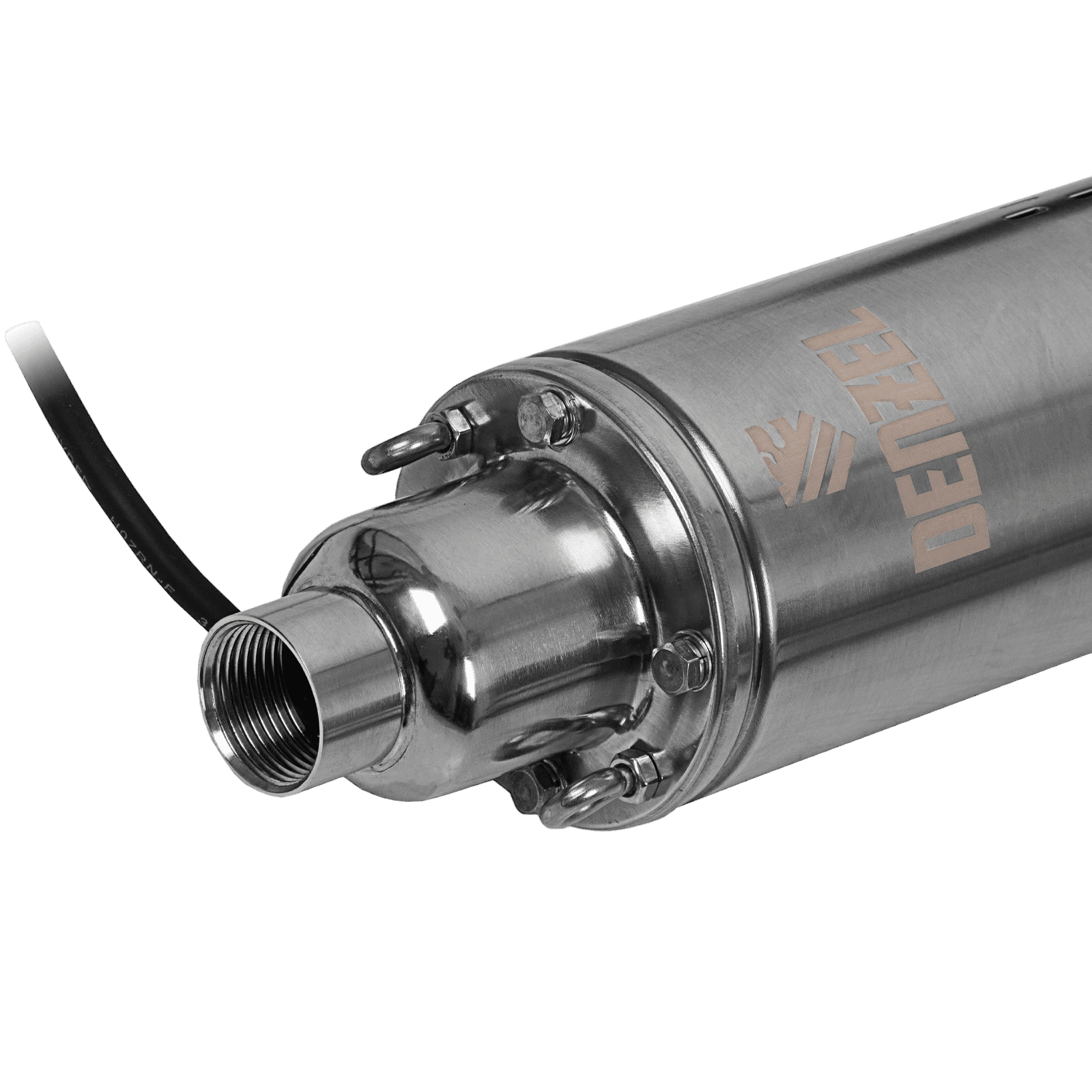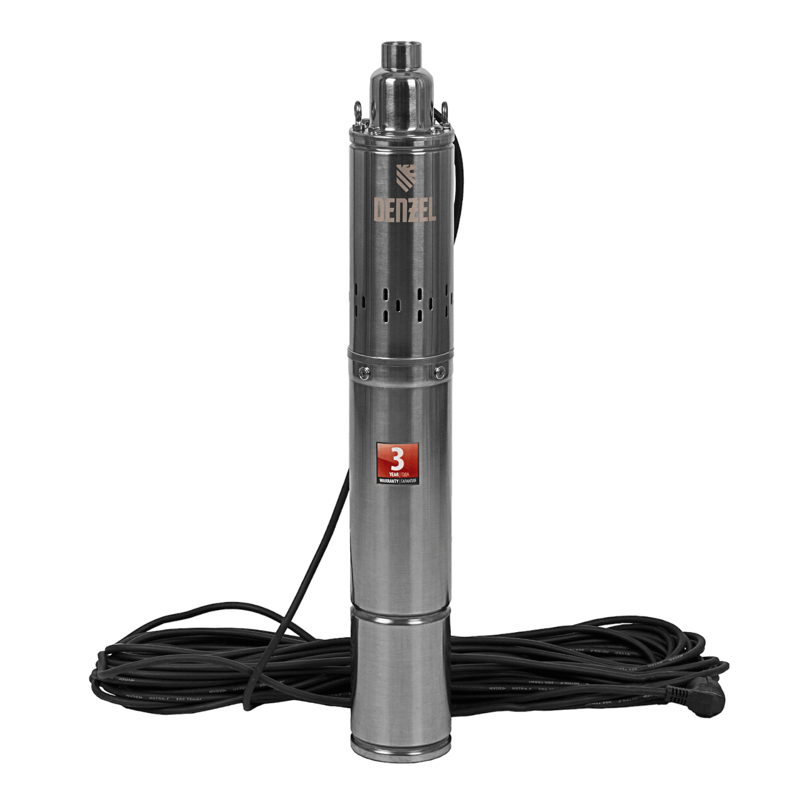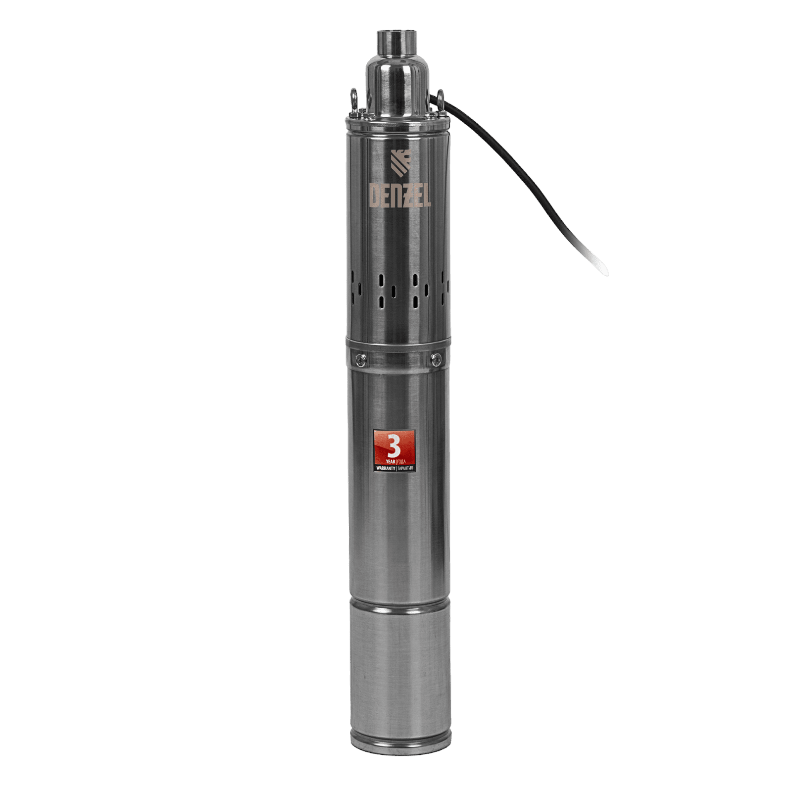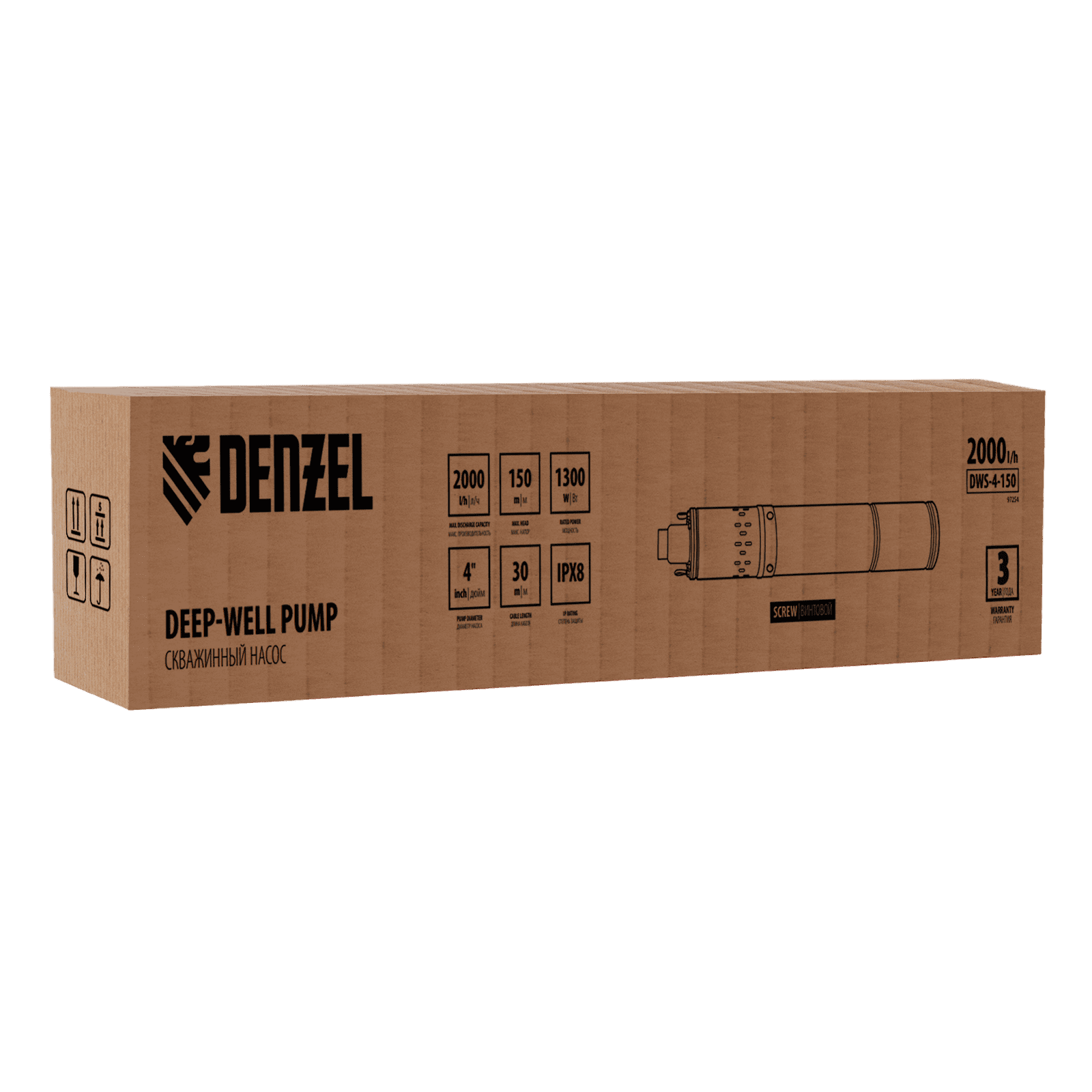 Скважинный насос Denzel DWS-4-150 97254 производительностью 2000 л/ч, диаметром 4″ и мощностью 1300 Вт обеспечивает напор до 150 м. Предназначен для подачи чистой воды из скважин, колодцев, систем водоснабжения, различных накопителей и пресных водоемов с глубины до 27 м (с наращиванием кабеля — до 80 м). Винтовая насосная часть обеспечивает напор, достаточный не только для полива приусадебных участков, но и для организации бытового водоснабжения.