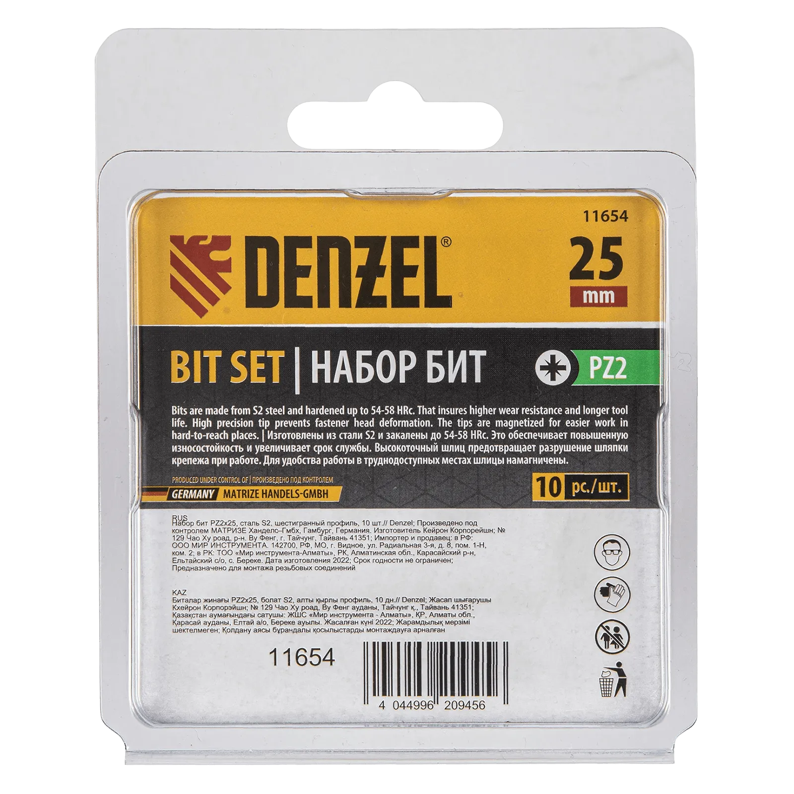 Набор бит PZ2 х 25 мм Denzel 11654 включает в себя 10 насадок из стали S2 с хвостовиком 1/4", рассчитанных на работу с шуруповертом. Оснастка служит для монтажа и демонтажа шурупов, саморезов и других резьбовых соединений. Шлиц PZ имеет 4 дополнительных ребра, за счет чего предотвращается проскальзывание биты в крепеже, повышаются точность и эффективность работ.