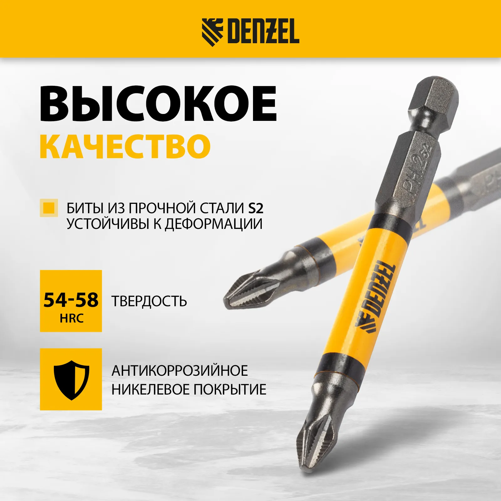 - Устойчивость к деформации при больших нагрузках — биты изготовлены из японской легированной стали S2 повышенной прочности и закалены до твердости 58 HRC.