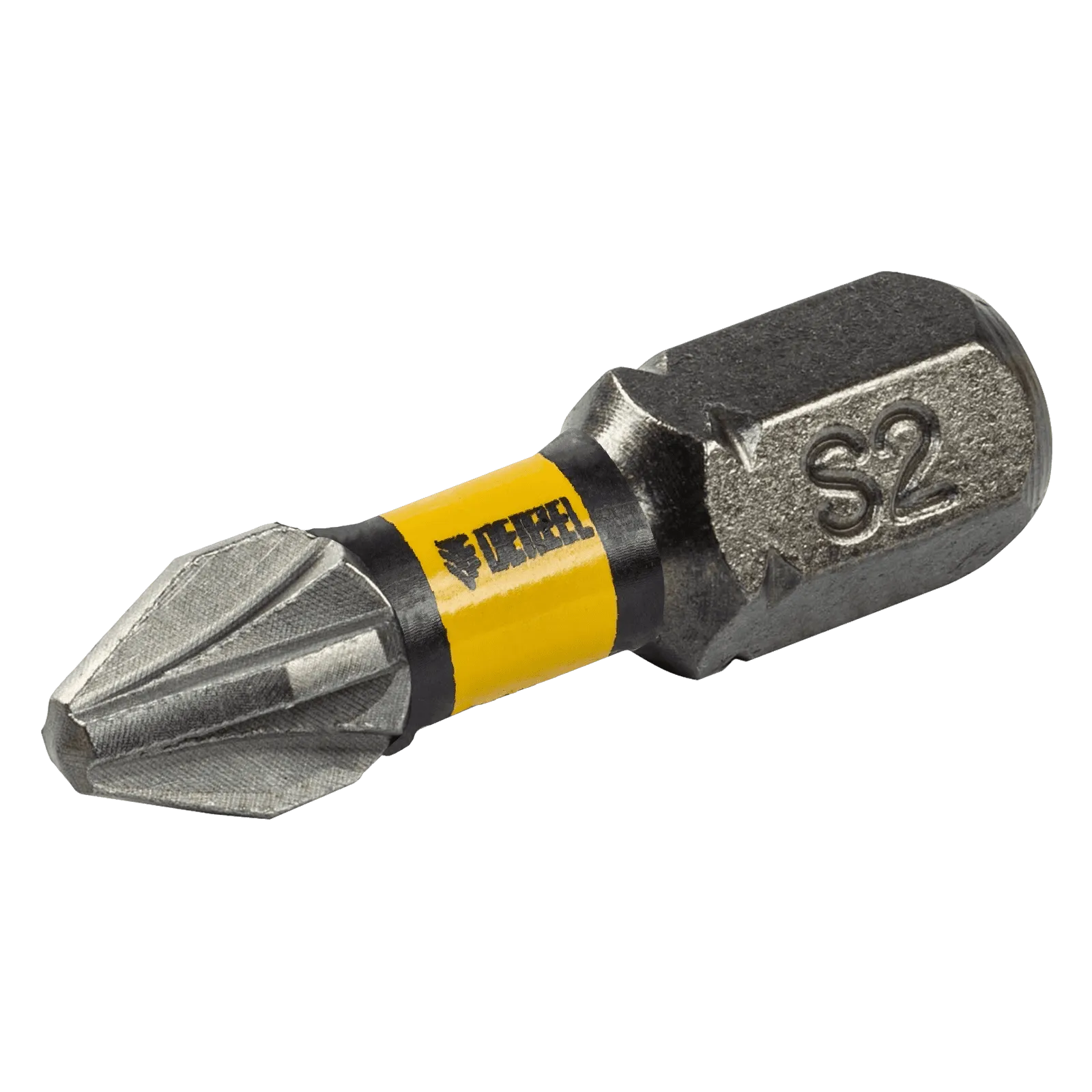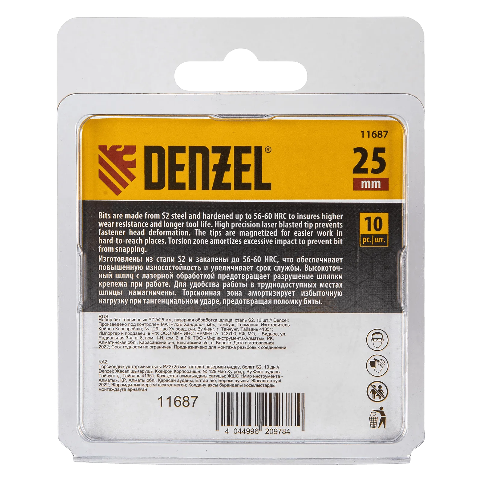 Набор бит торсионных PZ2 x 25 мм Denzel 11687 с лазерной обработкой шлица, из стали S2, 10 шт., предназначен для монтажа и демонтажа резьбовых соединений с помощью ударного шуруповерта. Он незаменим в строительных, слесарных и монтажных работах, в автосервисах, при проведении ремонта в доме.;Торсионная зона способна пружинить, за счет чего она частично амортизирует тангенциальный удар от шуруповерта. Такое решение позволяет равномерно распределить нагрузку по бите, избежать поломки шлица и в разы увеличить объем работы, проделанный одной насадкой.