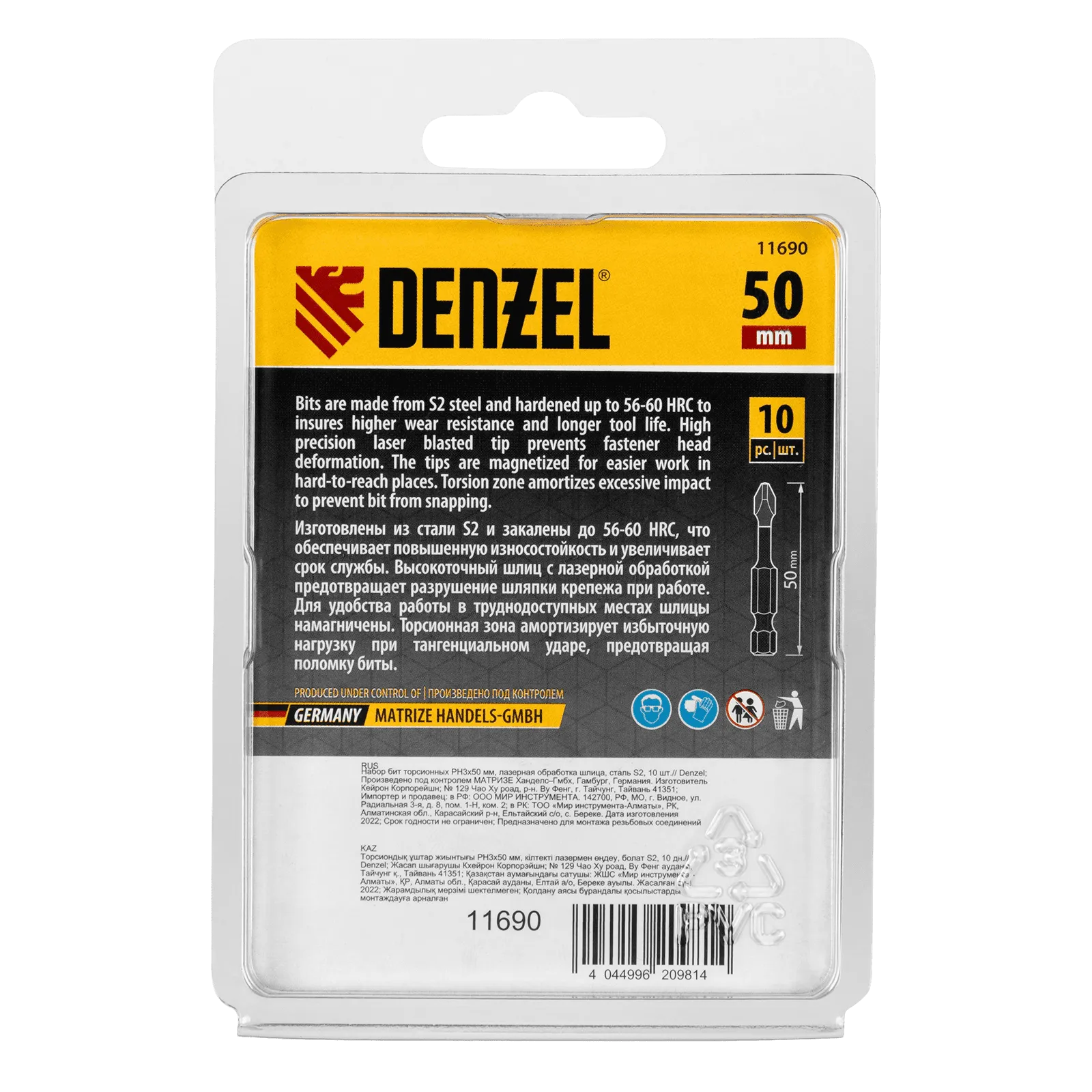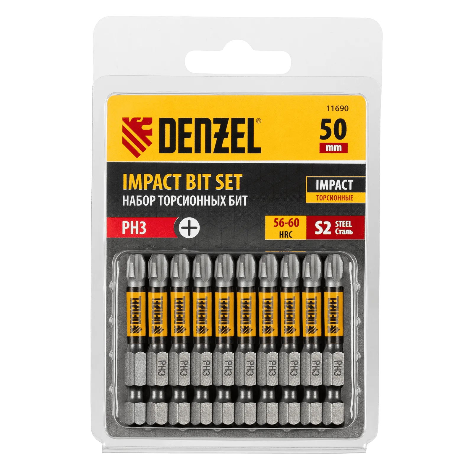 Набор бит торсионных PH3 x 50 мм Denzel 11690 с лазерной обработкой шлица, из стали S2, 10 шт., предназначен для монтажа и демонтажа резьбовых соединений с помощью ударного шуруповерта. Он незаменим в строительных, слесарных и монтажных работах, в автосервисах, при проведении ремонта в доме.;Торсионная зона способна пружинить, за счет чего она частично амортизирует тангенциальный удар от шуруповерта. Такое решение позволяет равномерно распределить нагрузку по бите, избежать поломки шлица и в разы увеличить объем работы, проделанный одной насадкой.