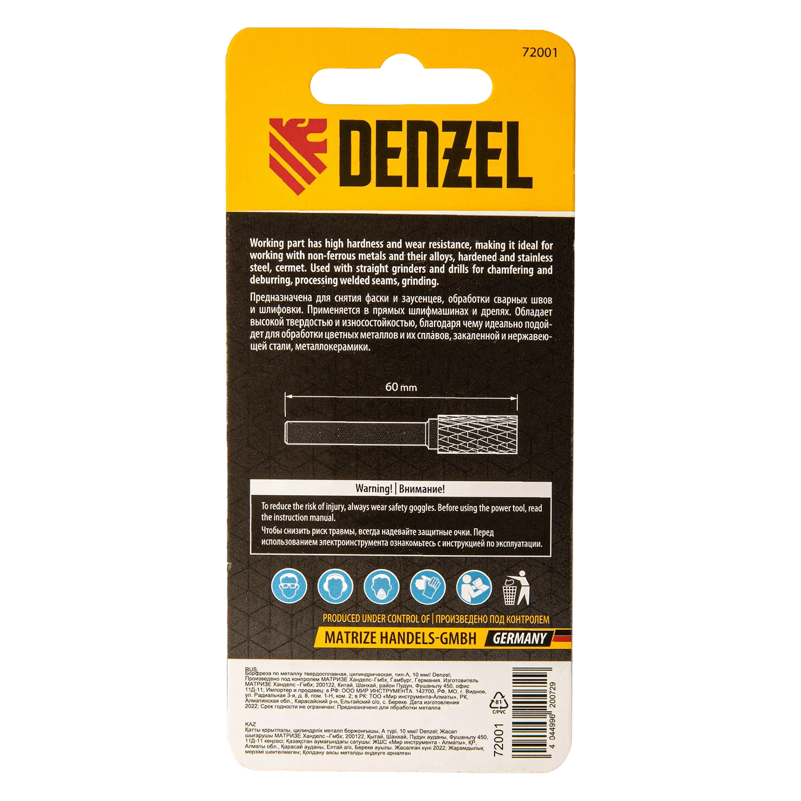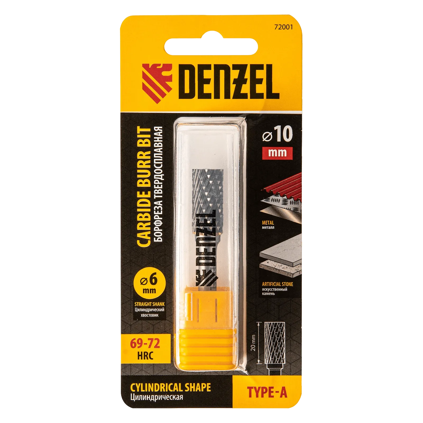 Твердосплавная борфреза Denzel 72001 с цилиндрической рабочей частью (тип A), диаметром 10 мм, используется для работ по металлу (закаленной и нержавеющей стали, латуни, меди, бронзе, чугуну, титану). Подходит также для обработки искусственного камня и металлокерамики. Предназначена для завершающей обработки и подгонки форм и поверхностей: шлифовки, зачистки сварных швов, удаления заусенцев, снятия фасок, разделки кромок. Оснастка устанавливается на прямошлифовальную машину или дрель.