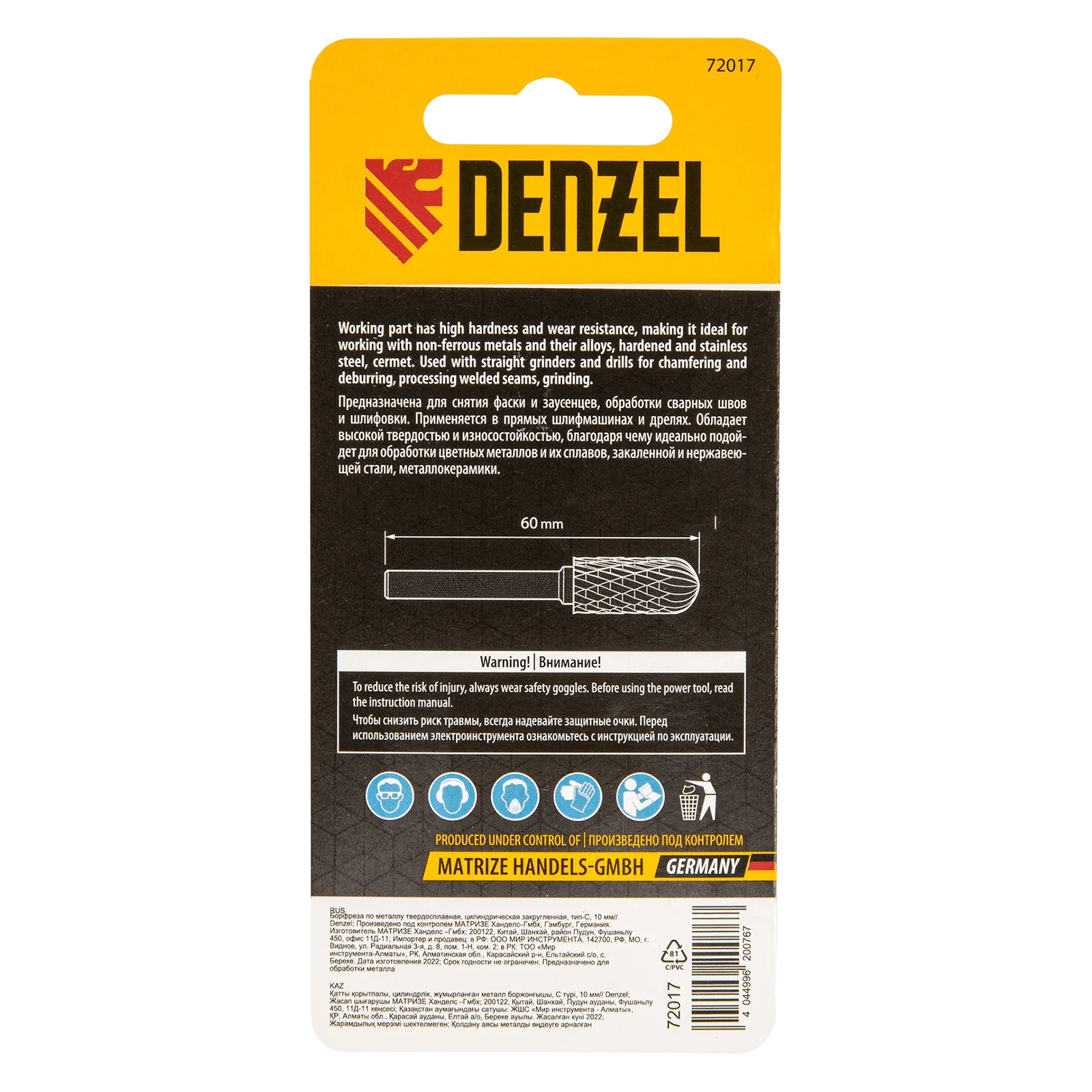 Твердосплавная борфреза Denzel 72017 с цилиндрической закругленной рабочей частью (тип C), диаметром 10 мм, предназначена для шлифовальных работ по металлу: закаленной и нержавеющей стали, латуни, чугуну, бронзе, титану, меди. Также используется для обработки искусственного камня и металлокерамики. Борфреза позволяет зачищать сварные швы, удалять заусенцы и снимать фаски. Форма рабочей части оптимальна для обработки радиусных пазов, поверхностей с плавными изгибами. Также с помощью борфрезы можно быстро и эффективно восстановить гравировку. Оснастка устанавливается на дрель или прямошлифовальную машину.