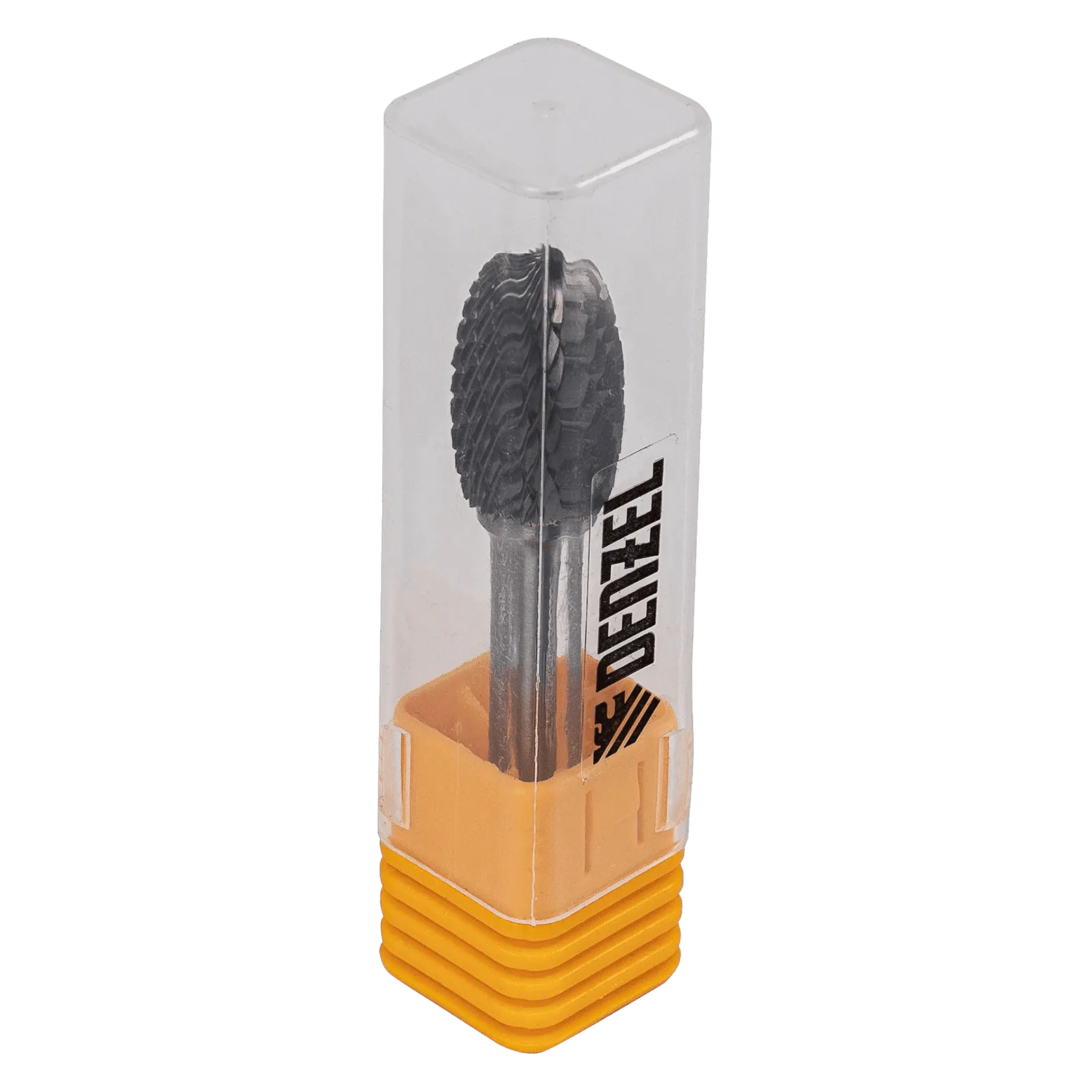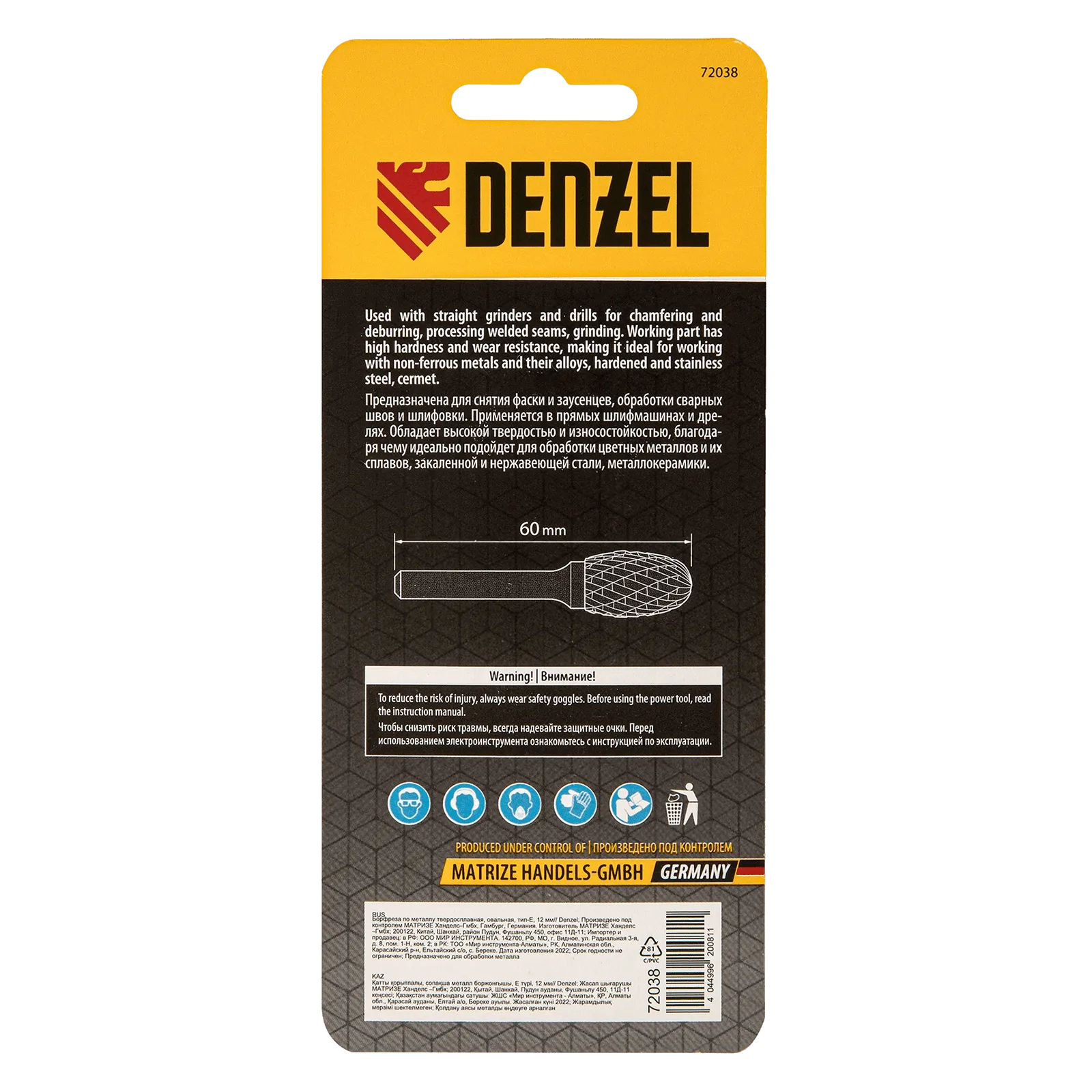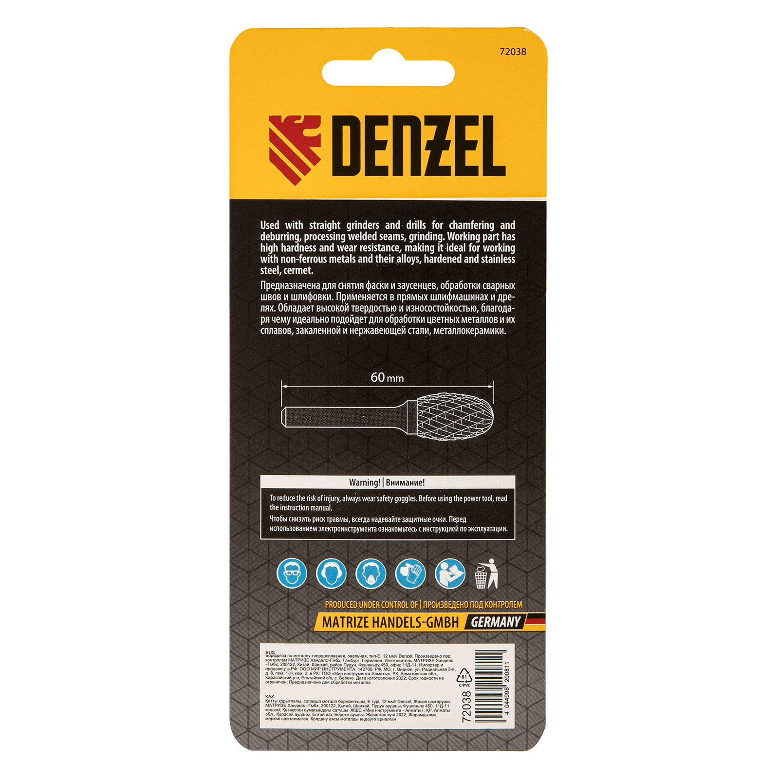 Твердосплавная борфреза по металлу Denzel 72038 с овальной режущей частью (тип E), диаметром 12 мм, предназначена для шлифовки стальных, бронзовых, медных, латунных, чугунных, титановых поверхностей. Также эффективна для обработки искусственного камня и металлокерамики. Овальная рабочая часть позволяет зачищать сварные швы, удалять заусенцы, снимать фаски, обрабатывать закругленные углы. С помощью борфрезы можно восстановить утратившую первоначальный вид гравировку. Режущая оснастка устанавливается на дрель или прямошлифовальную машину.