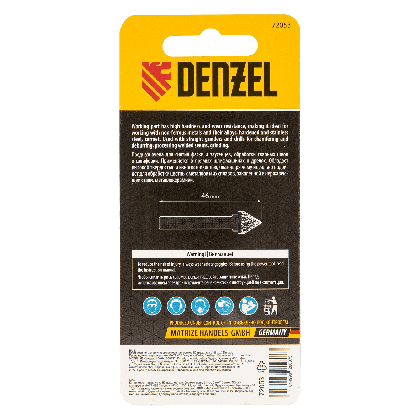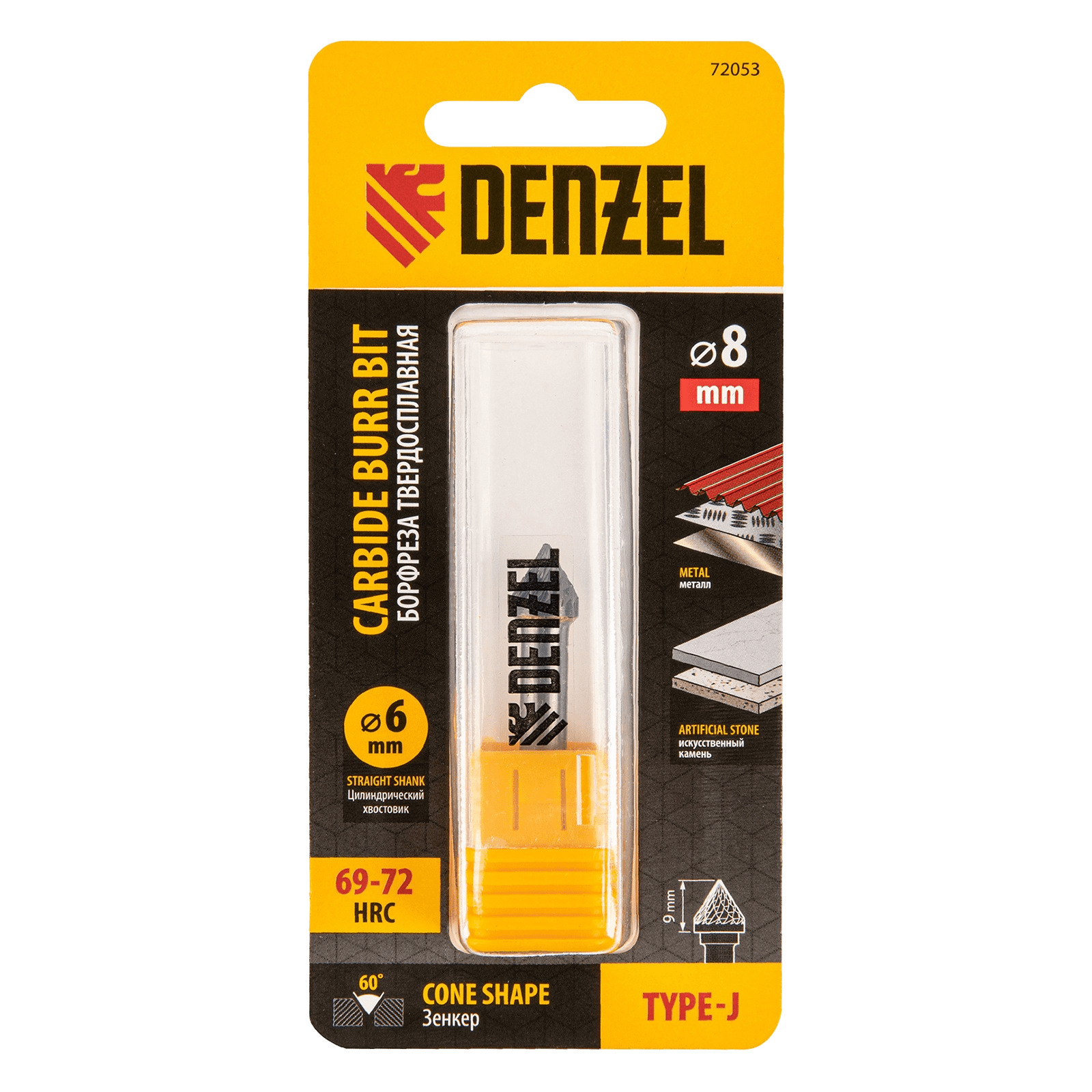 Твердосплавная борфреза по металлу Denzel 72053 с рабочей частью-зенкером с вершиной 60° (тип J), диаметром 8 мм, устанавливается на дрель или прямошлифовальную машину. Используется для обработки закаленной и нержавеющей стали, латуни, бронзы, меди, чугуна, титана, а также металлокерамики и искусственного камня. Оптимальна для снятия фасок и заусенцев, обработки кромок, угловых пазов, краев отверстий.