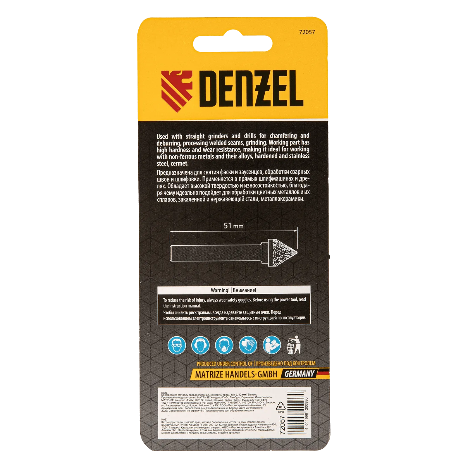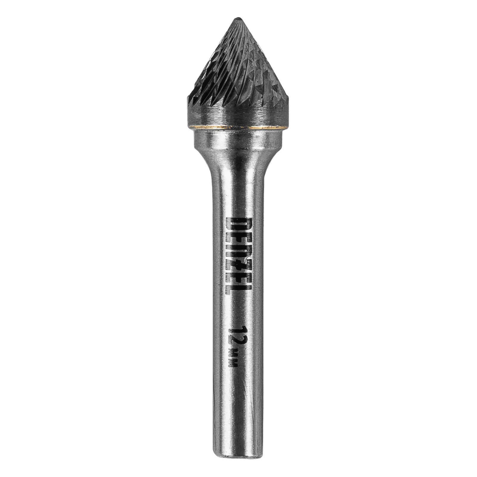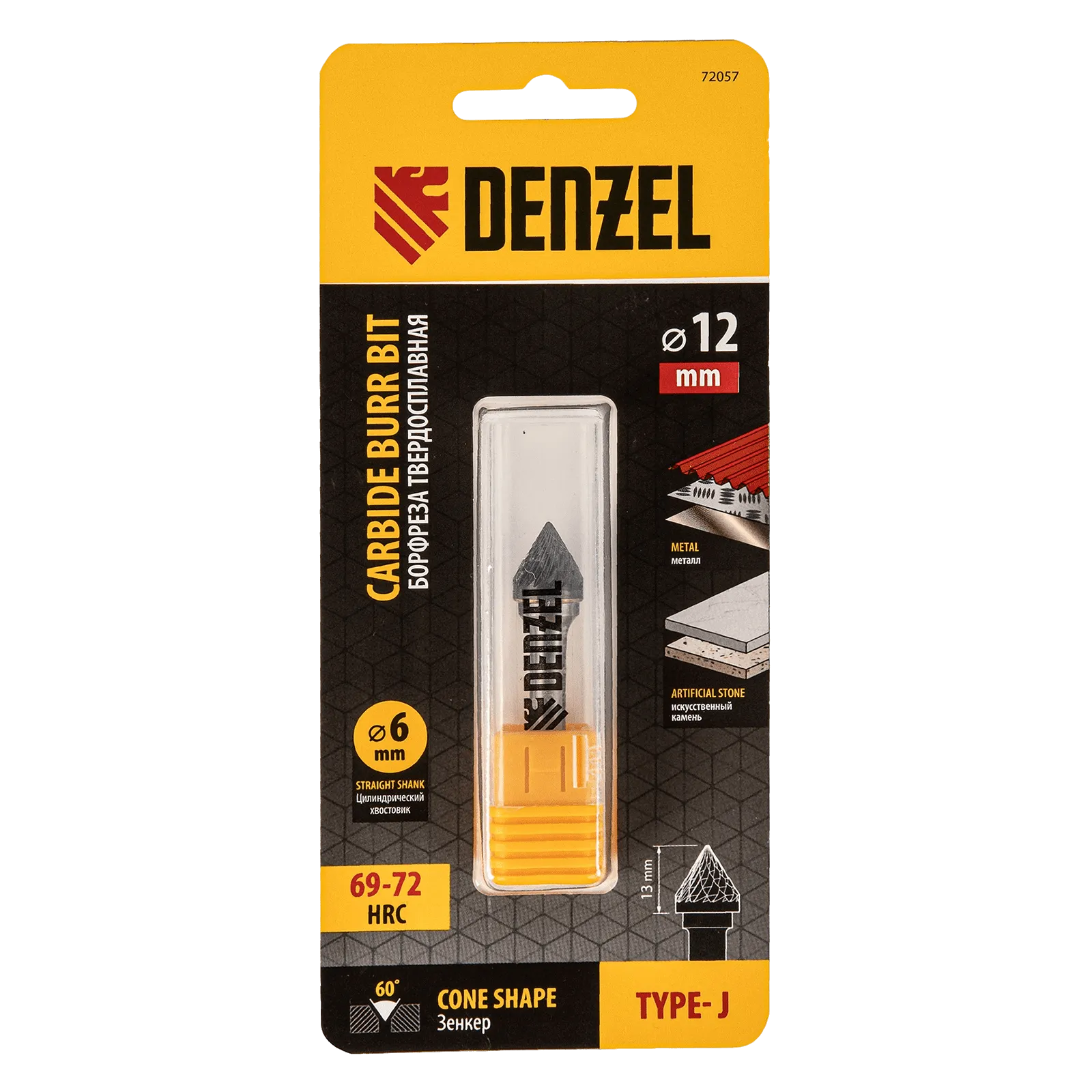 Твердосплавная борфреза по металлу Denzel 72057 с рабочей частью-зенкером с вершиной 60° (тип J), диаметром 12 мм, устанавливается на дрель или прямошлифовальную машину. Используется для обработки закаленной и нержавеющей стали, латуни, бронзы, меди, чугуна, титана, а также металлокерамики и искусственного камня. Оптимальна для снятия фасок и заусенцев, обработки кромок, угловых пазов, краев отверстий.