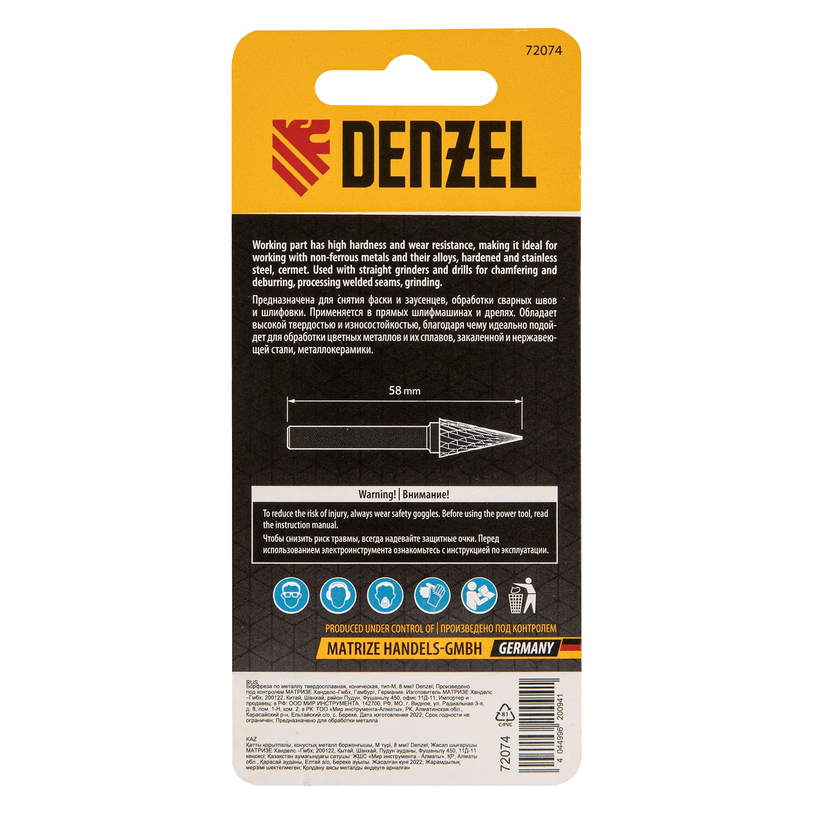 Твердосплавная борфреза по металлу Denzel 72074 с конической рабочей частью (тип M), диаметром 8 мм, — оснастка для дрели и прямошлифовальной машины. Позволяет снимать фаски и удалять заусенцы, идеальна для обработки поверхностей сложной формы, конических отверстий и пазов, а также выполнения точных работ. Подходит для шлифовки деталей из закаленной и нержавеющей стали, чугуна, бронзы, меди, латуни, титана, а также металлокерамики и искусственного камня.