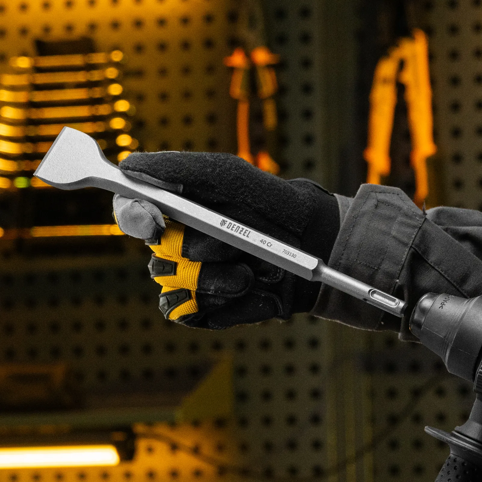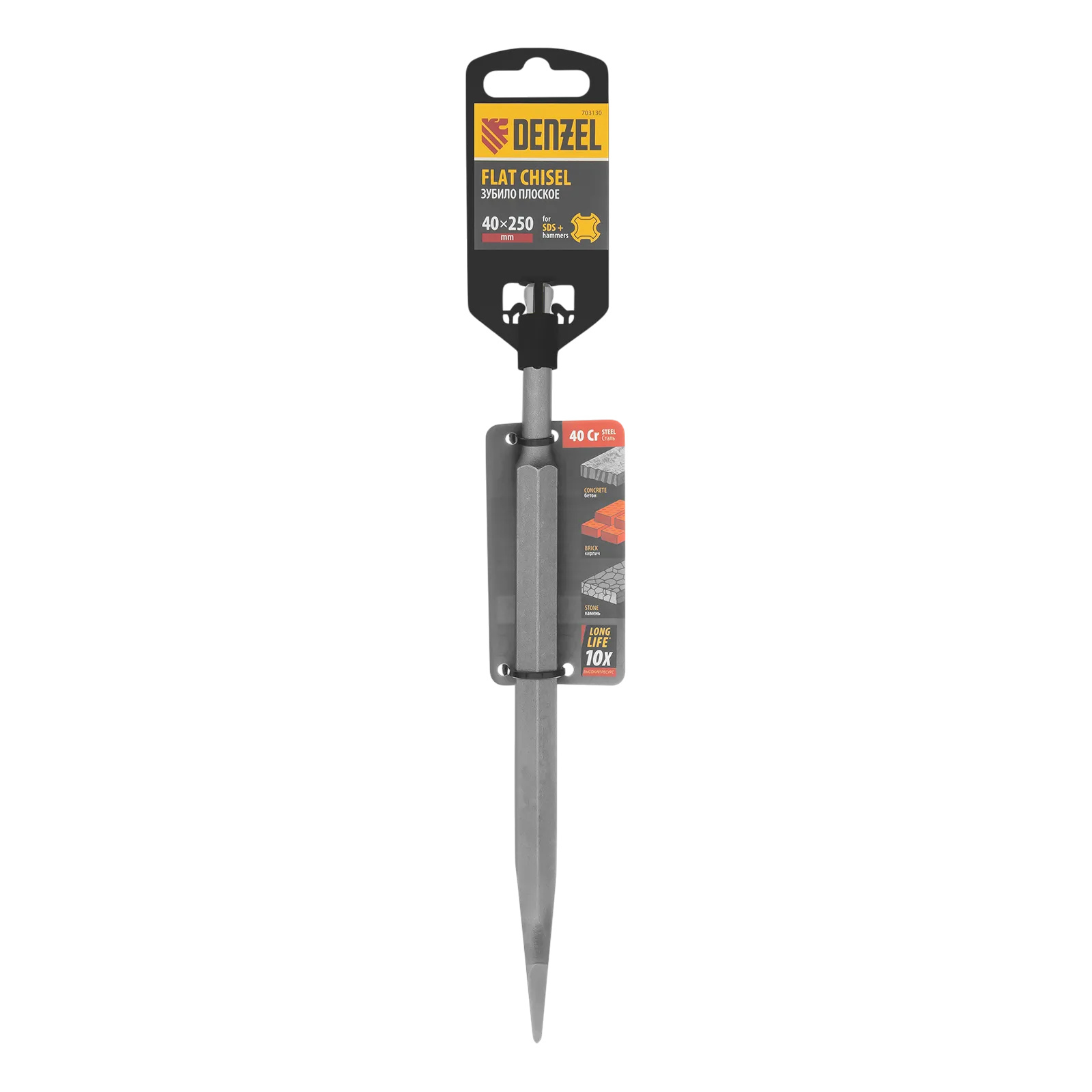 Зубило Denzel 703130 размером 14 x 40 x 250 мм, из стали 40Cr, с хвостовиком SDS-plus — оснастка для перфоратора. Предназначено для выполнения ударных, демонтажных работ с твердыми материалами, такими как камень, бетон, кирпич. Пригодится на строительной площадке.