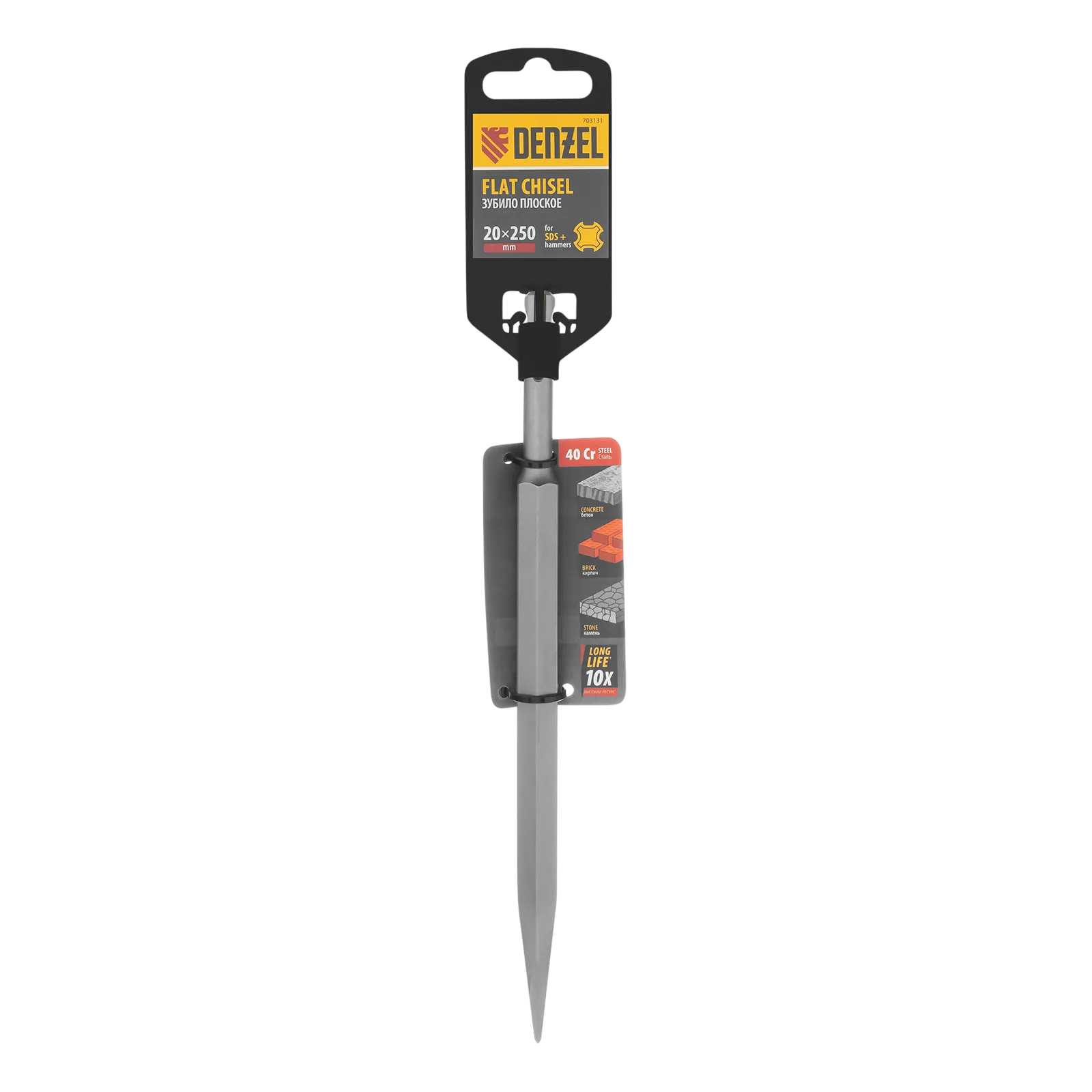 Зубило Denzel 703131 размером 14 x 20 x 250 мм, из стали 40Cr, с хвостовиком SDS-plus — оснастка для перфоратора. Предназначено для выполнения ударных, демонтажных работ с твердыми материалами, такими как камень, бетон, кирпич. Пригодится на строительной площадке.