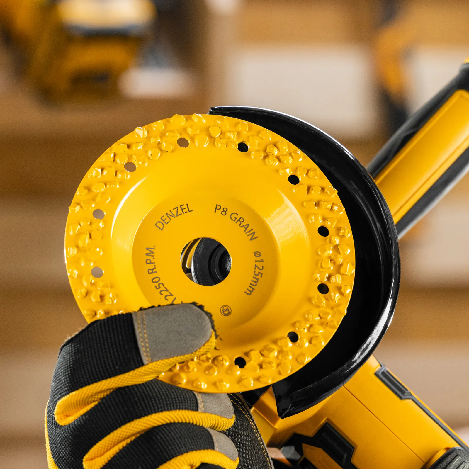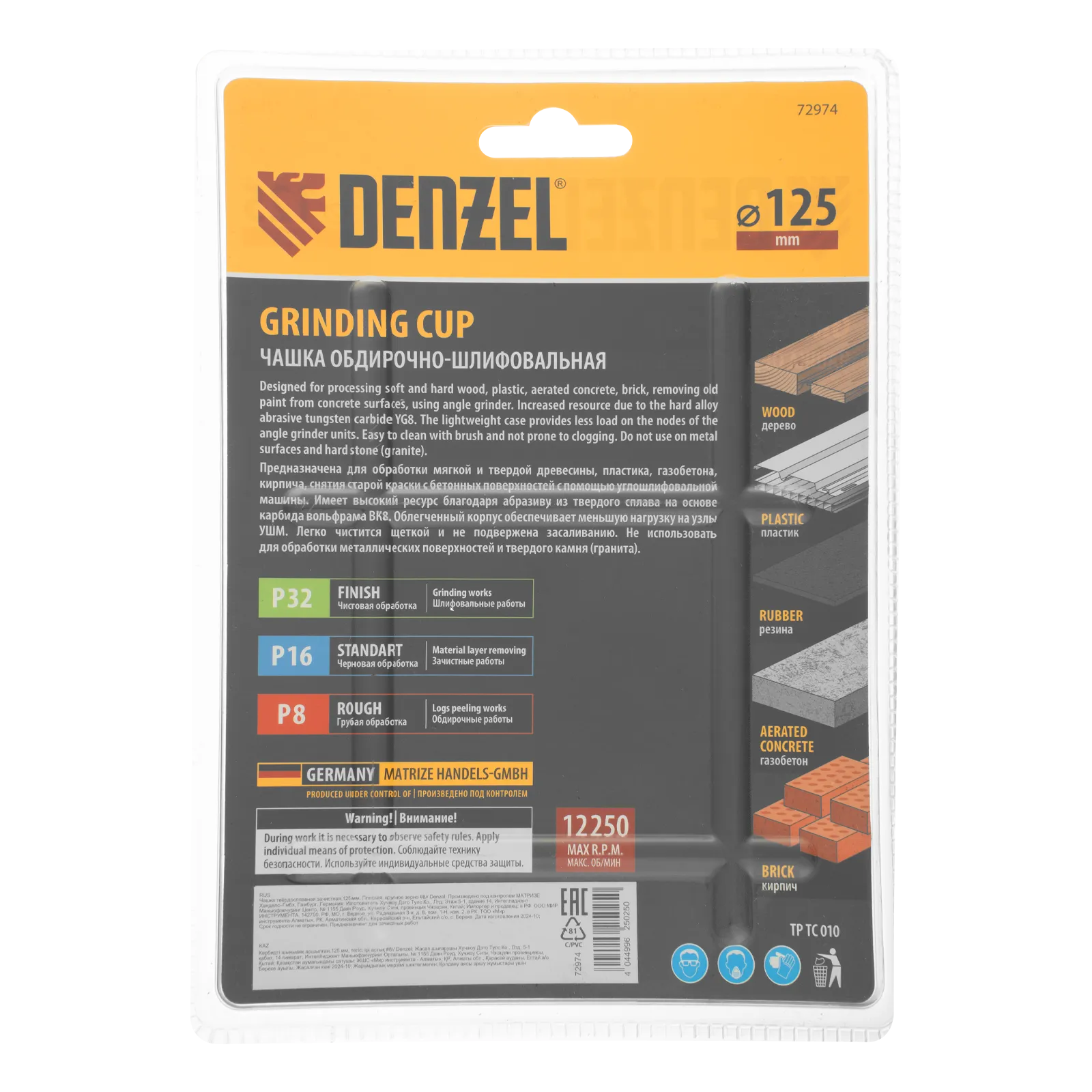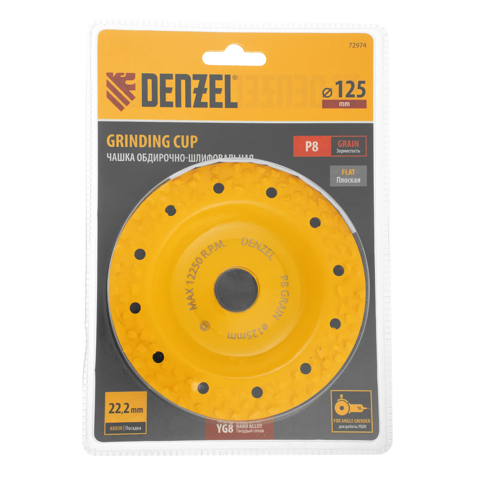 Твердосплавная зачистная чашка Denzel 72974 плоской формы, диаметром 125 мм, с крупным абразивным зерном P8, — оснастка для углошлифовальной машины, предназначенная для проведения обдирочных работ. Оптимальна для грубой обработки твердой и мягкой древесины, пластика, резины, газобетона, кирпича. Позволяет быстро и эффективно выровнять поверхность, удалить старое лакокрасочное покрытие, остатки клея, цемента и т.д. Не подходит для шлифования металла и твердого камня (гранита)! Благодаря облегченному корпусу чашки нагрузка на УШМ снижена, что продлевает срок службы инструмента.