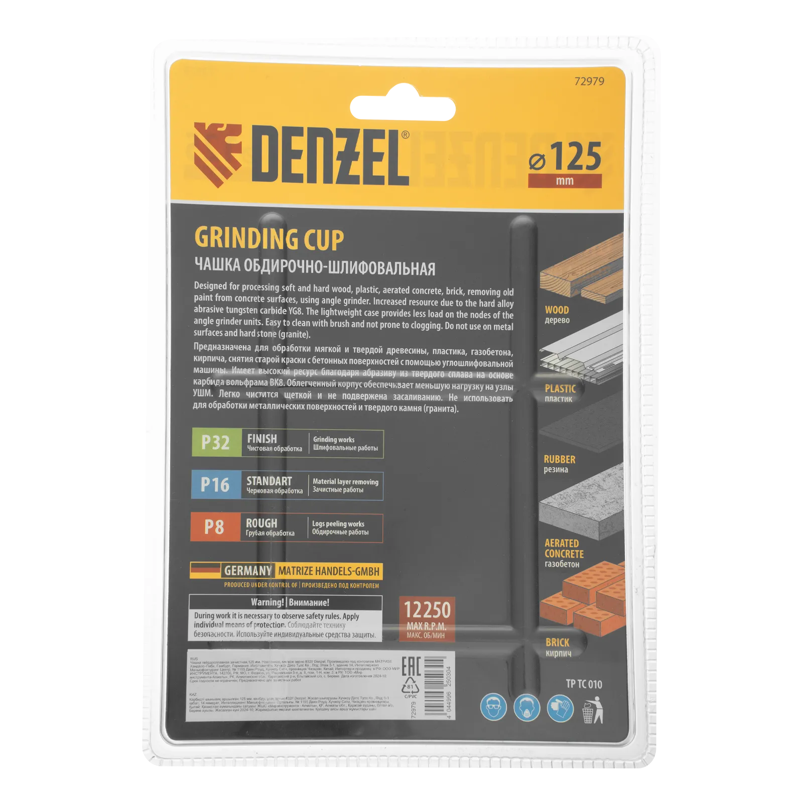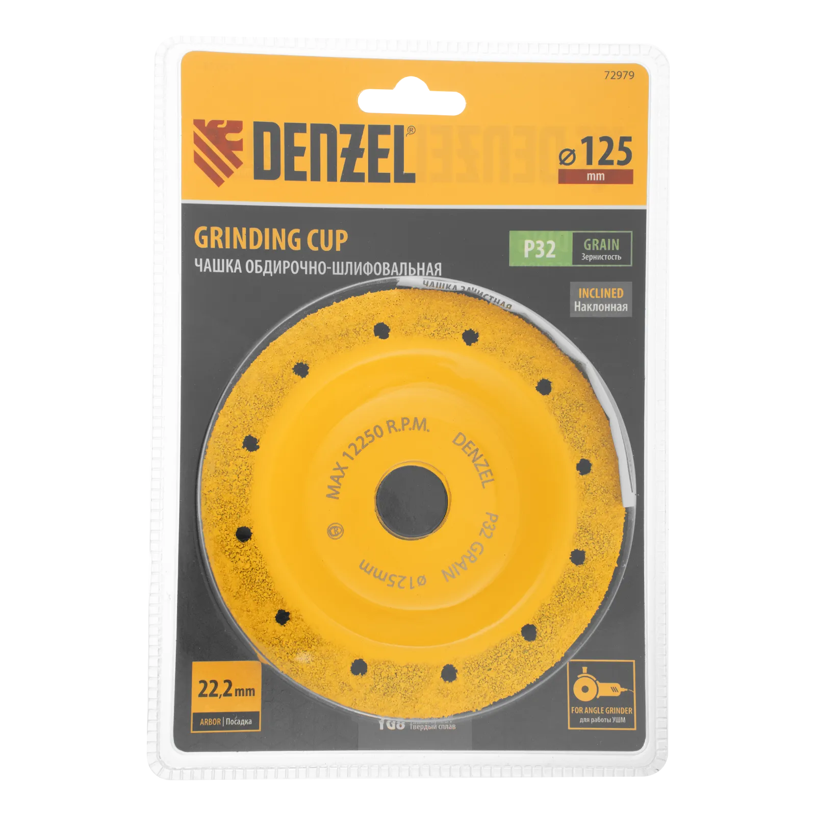 Твердосплавная зачистная чашка Denzel 72979 диаметром 125 мм, с наклонной рабочей частью и мелким зерном P32, используется для проведения шлифовальных работ при помощи углошлифовальной машины (УШМ). Мелкозернистый абразив оптимален для чистовой обработки твердой и мягкой древесины, кирпича, пластика, резины, газобетона. С помощью чашки можно устранить мелкие неровности, остатки старого покрытия, подготовить поверхности к дальнейшей отделке. Режущие частицы из твердого сплава ВК8 не образуют абразивную пыль, что снижает вредное воздействие на здоровье пользователя. Оснастка пригодится при проведении строительных, ремонтных и отделочных работ.