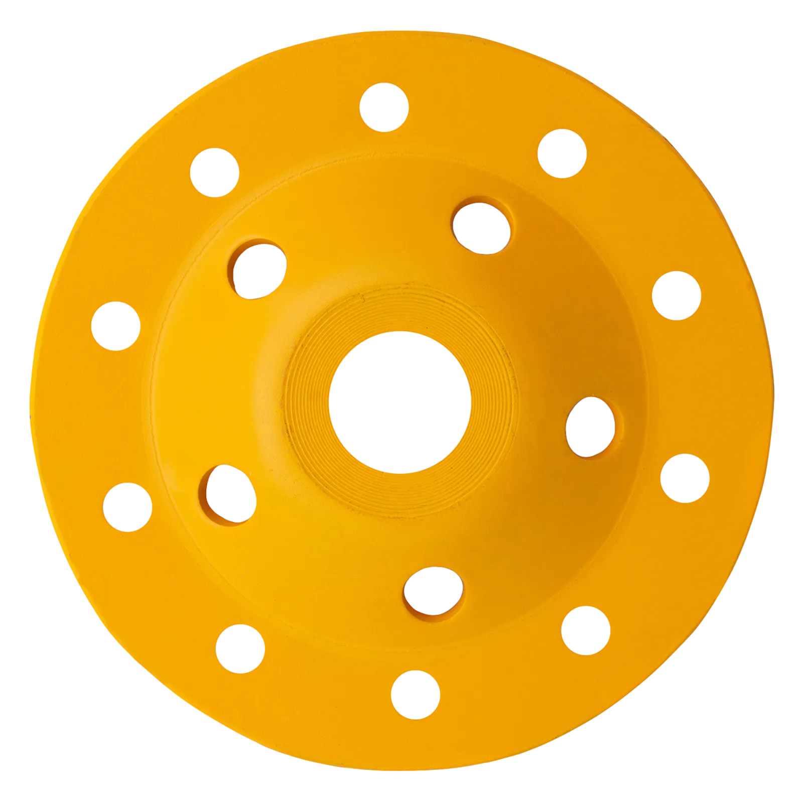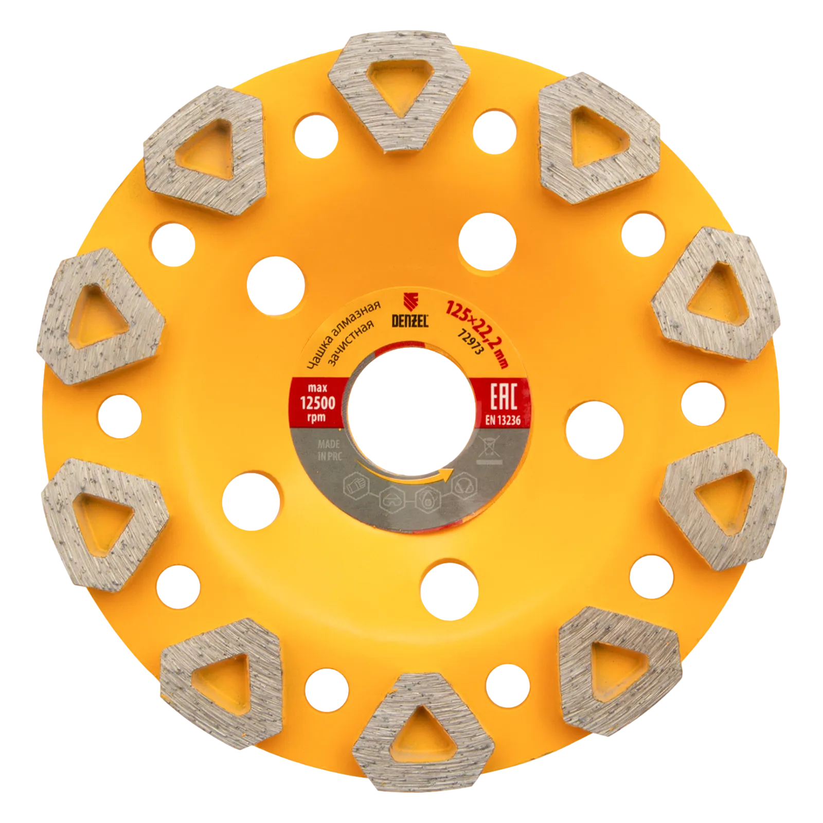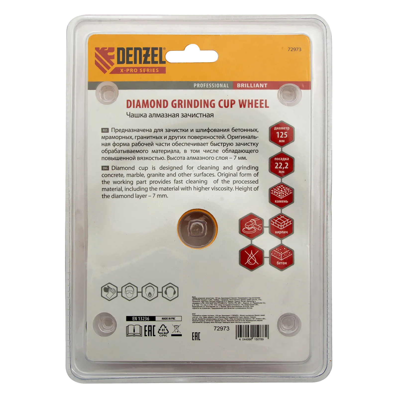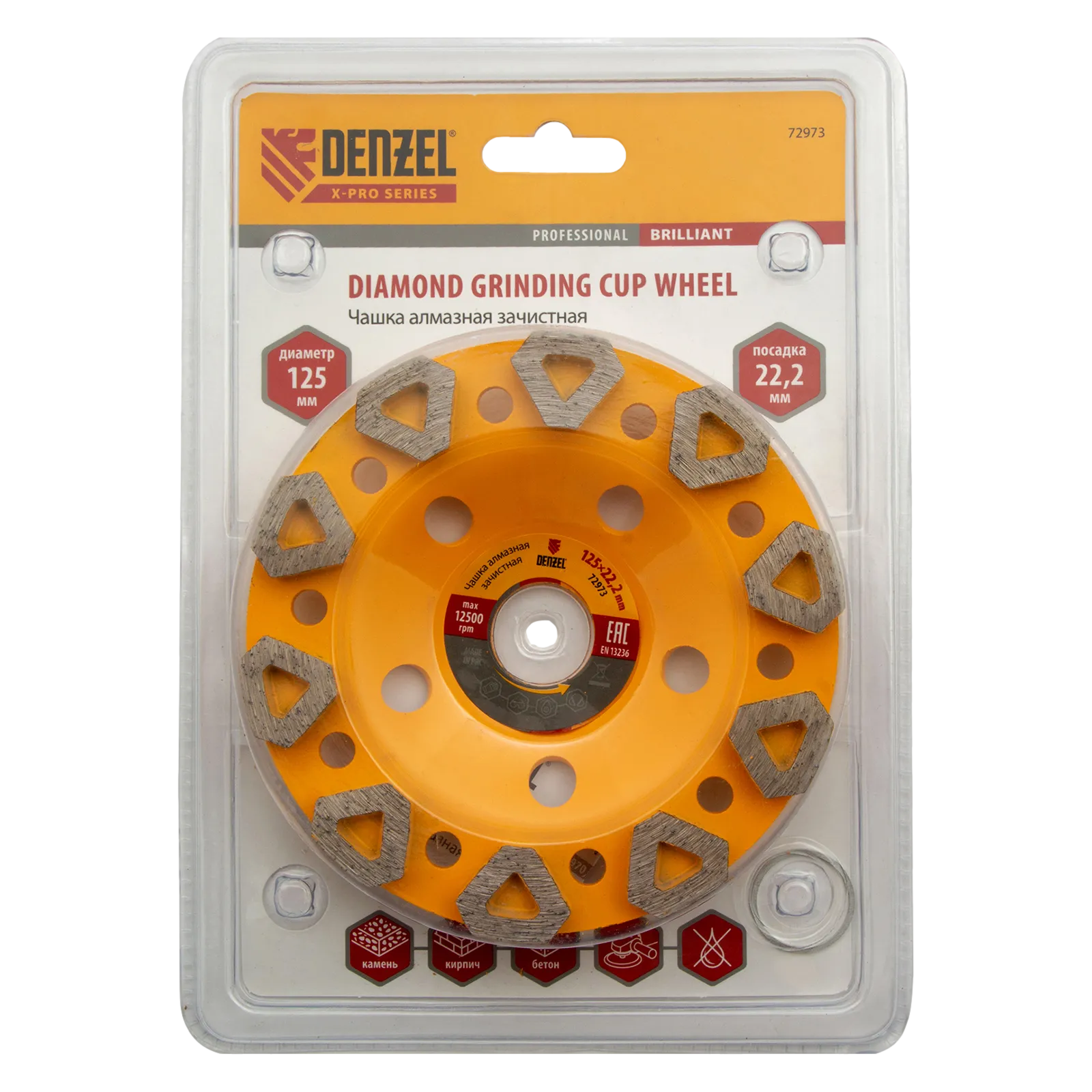 Алмазная зачистная чашка Denzel «Бриллиант» 72973 с посадочным отверстием 22,2 мм устанавливается на углошлифовальные машины, работающие с оснастками диаметром 125 мм. Ее используют для обработки бетонных, каменных, гранитных, мраморных поверхностей и кирпичных кладок. Рабочий слой с высокой концентрацией алмазов и сбалансированной связкой устраняет неровности, зачищает швы, выравнивает стыки, удаляет наплывы (в несколько этапов), а также придает обрабатываемому материалу гладкость. Насадка рекомендована для профессионального применения.
