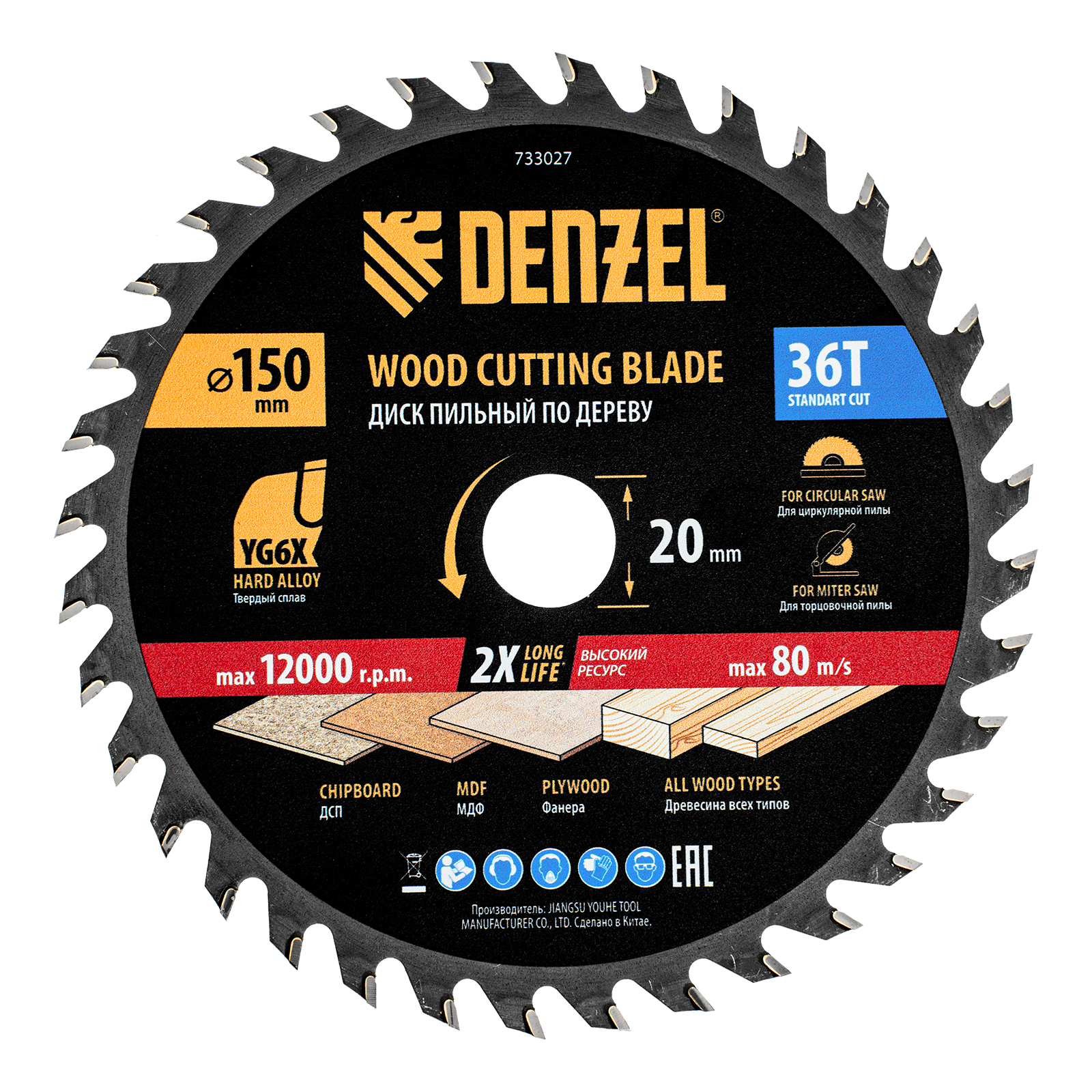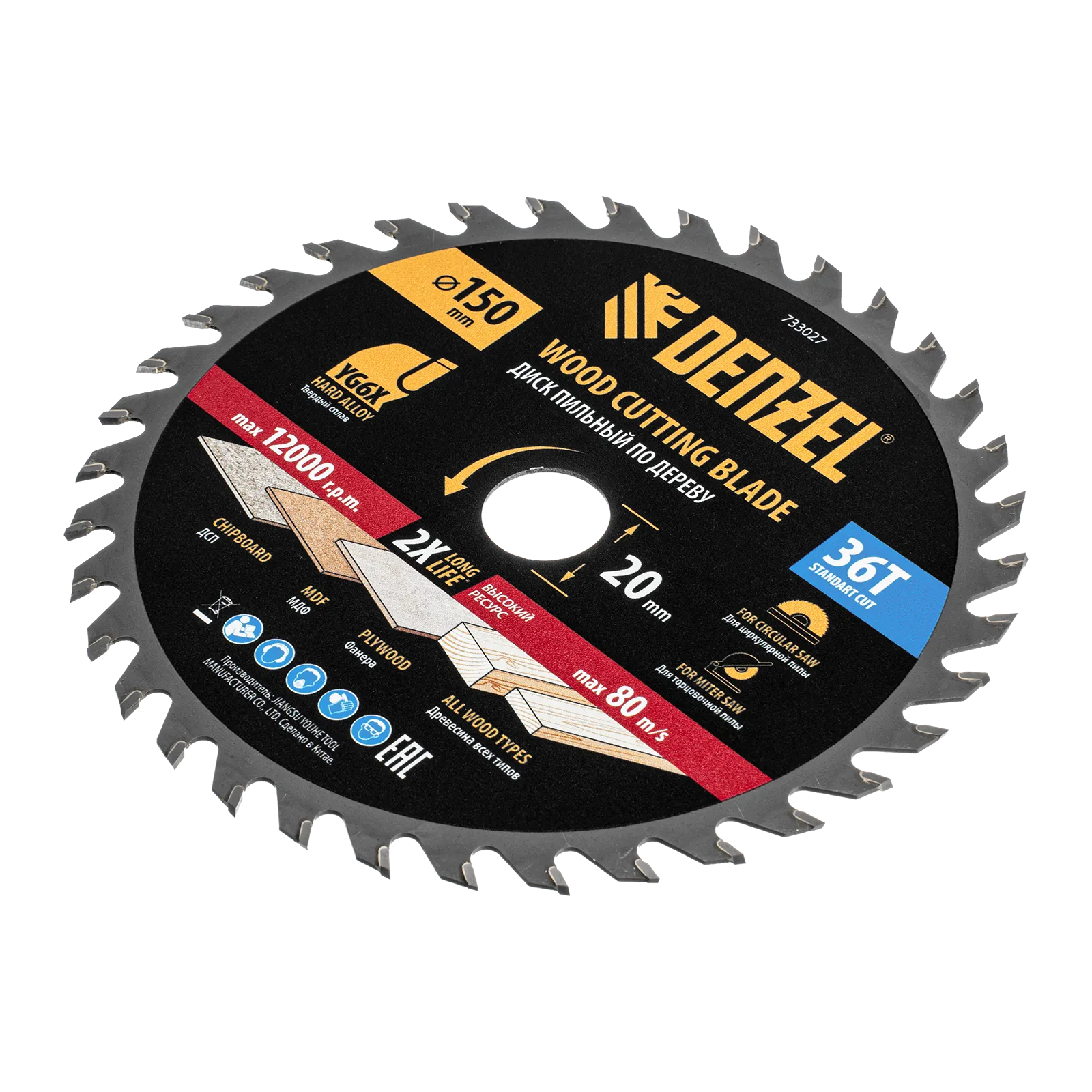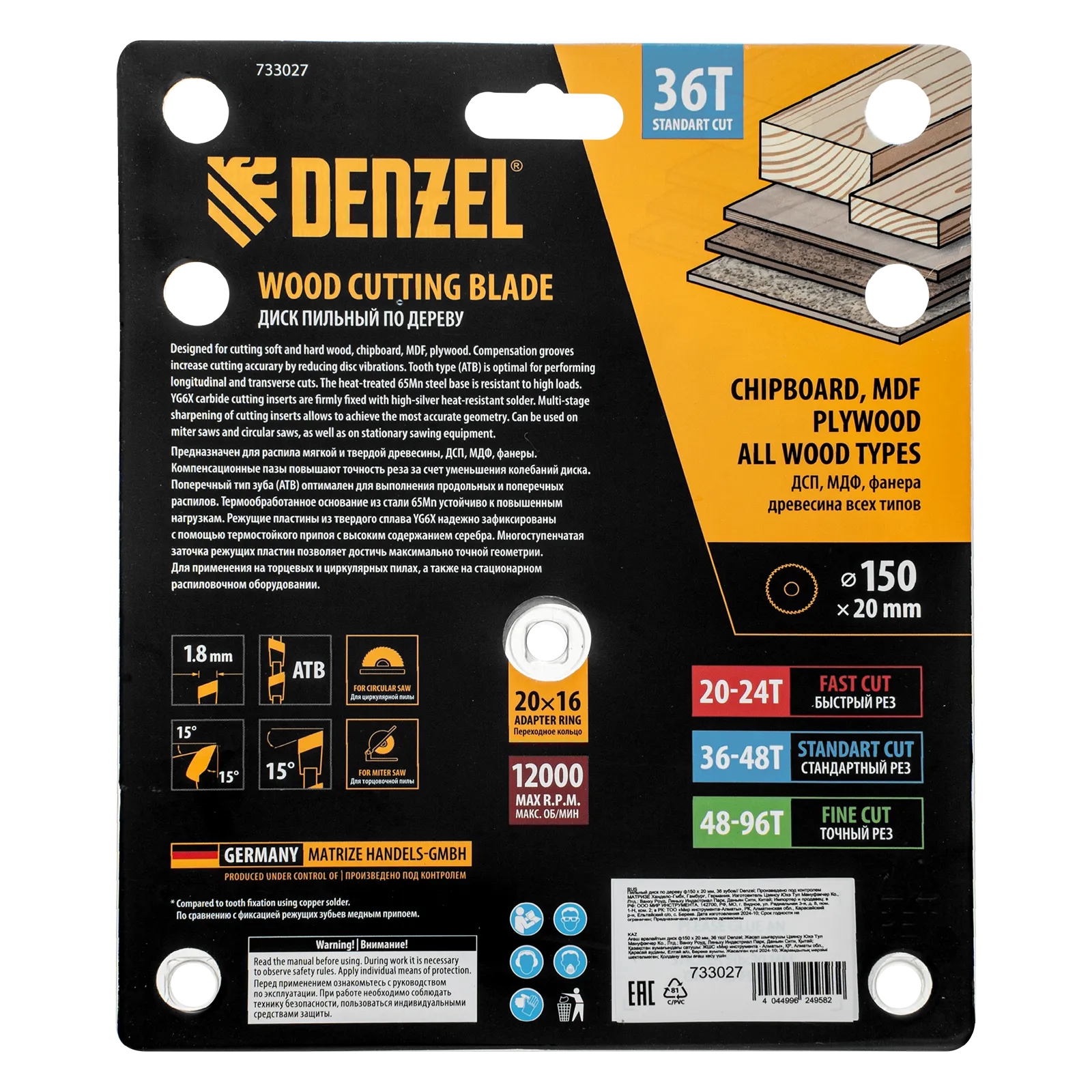 Пильный диск Denzel 733027 диаметром 150 x 20 мм, с 36 зубьями, предназначен для продольного и поперечного распила твердой и мягкой древесины, фанеры, МДФ, ДСП. 36 зубьев типа ATB с режущими пластинами оптимальной геометрии обеспечивают качественный рез. Тип реза — стандартный. Режущие пластины из твердого сплава YG6X сохраняют рабочие свойства при интенсивном использовании. Диск устанавливается на циркулярную, торцовочную пилу или на распиловочный станок. В комплект поставки входит переходное кольцо с 20 на 16 мм, что позволяет изменить посадочный размер и расширяет возможности использования диска.