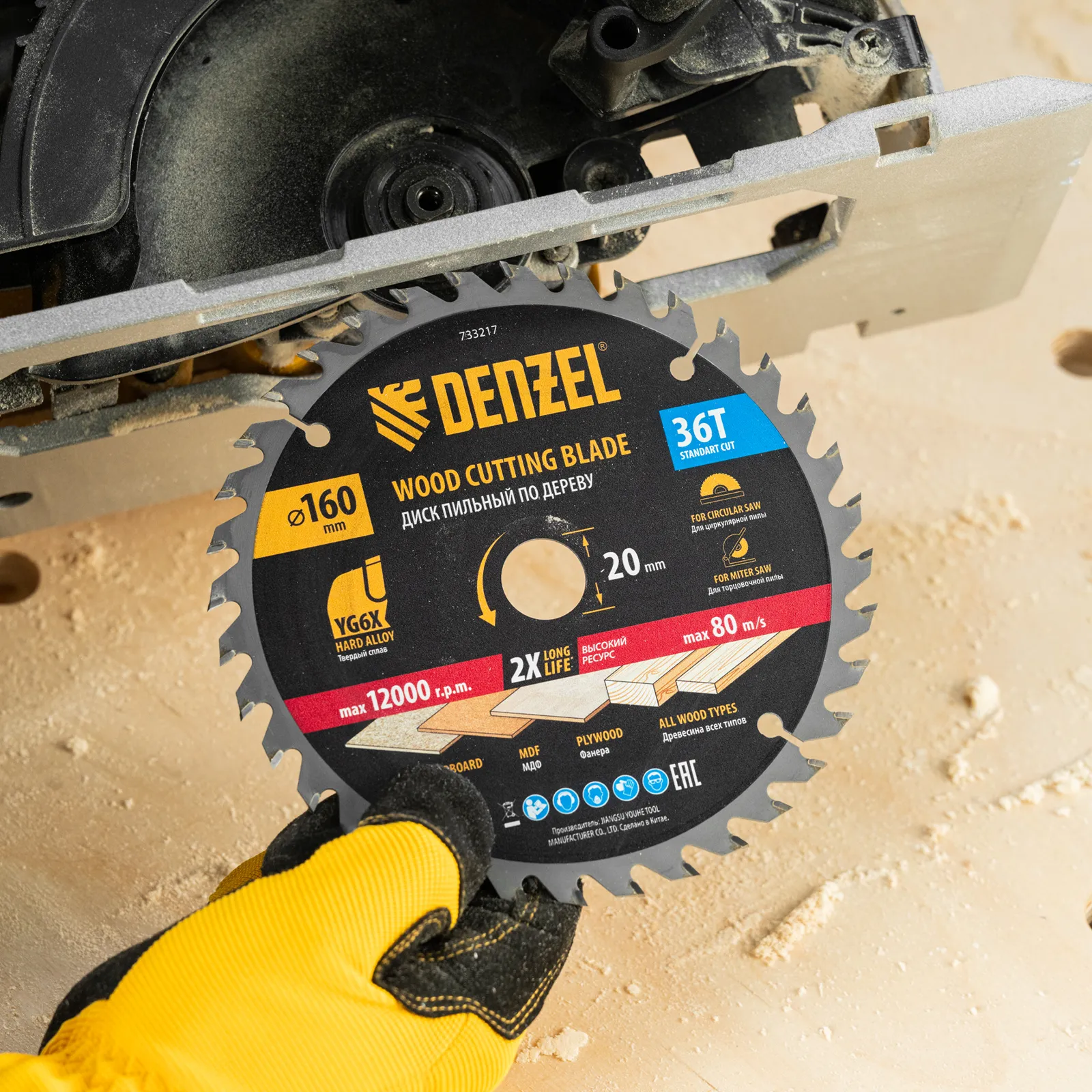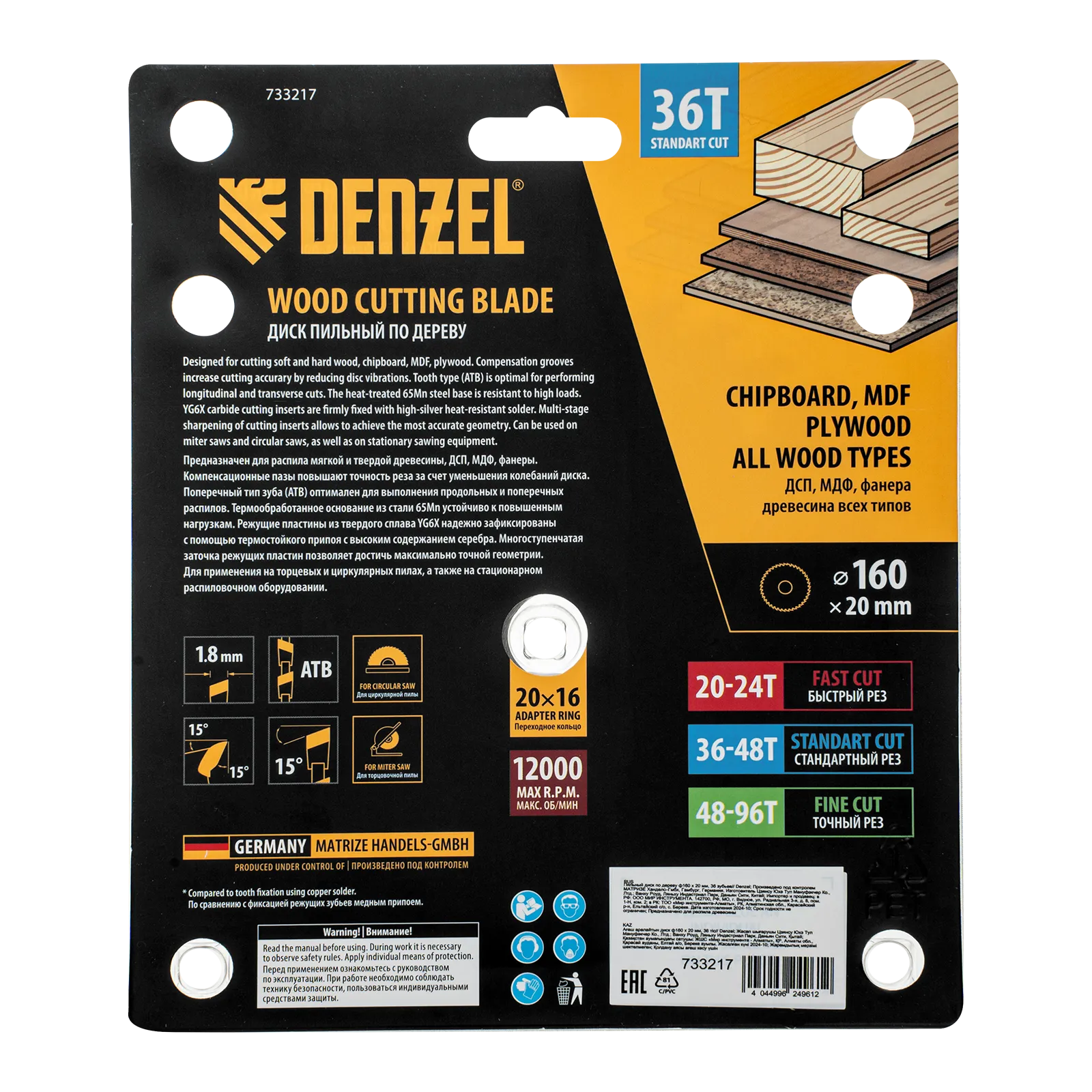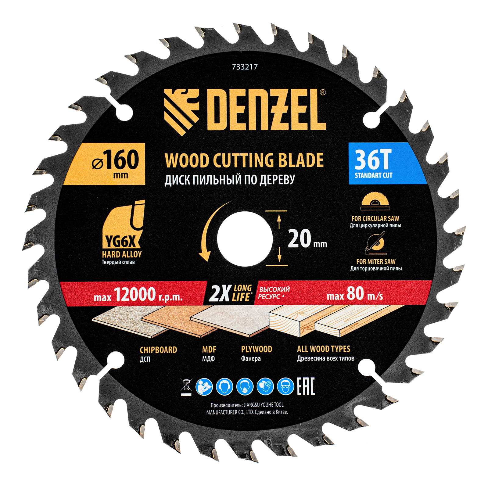 Пильный диск Denzel 733217 диаметром 160 x 20 мм, с 36 зубьями, предназначен для продольного и поперечного распила твердой и мягкой древесины, фанеры, МДФ, ДСП. 36 зубьев типа ATB с режущими пластинами оптимальной геометрии обеспечивают качественный рез. Тип реза — стандартный. Режущие пластины из твердого сплава YG6X сохраняют рабочие свойства при интенсивном использовании. Диск устанавливается на циркулярную, торцовочную пилу или на распиловочный станок. В комплект поставки входит переходное кольцо с 20 на 16 мм, что позволяет изменить посадочный размер и расширяет возможности использования диска.
