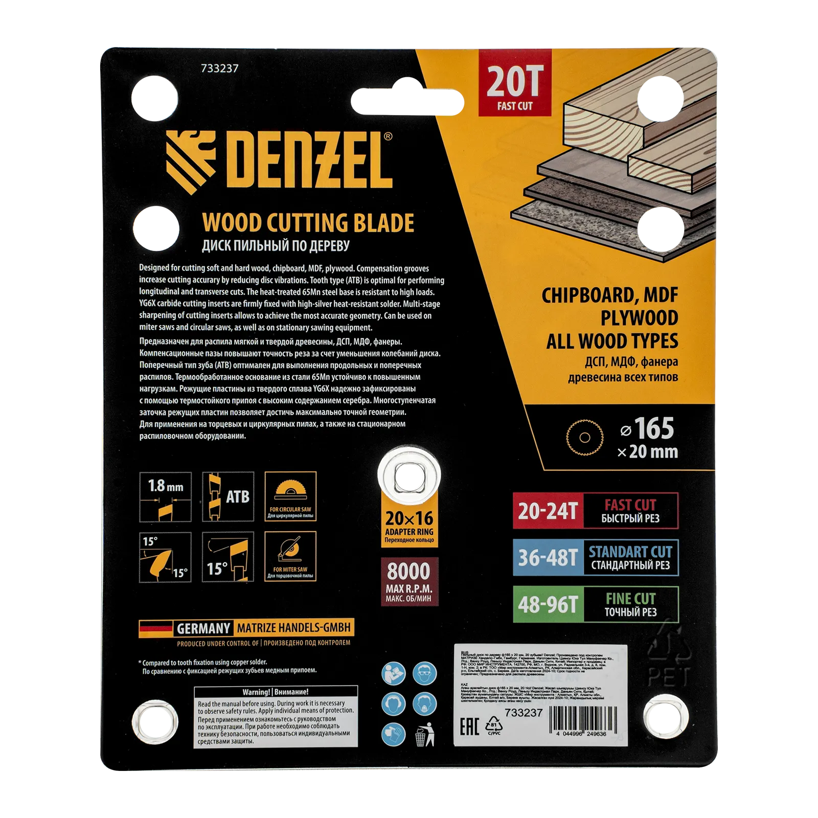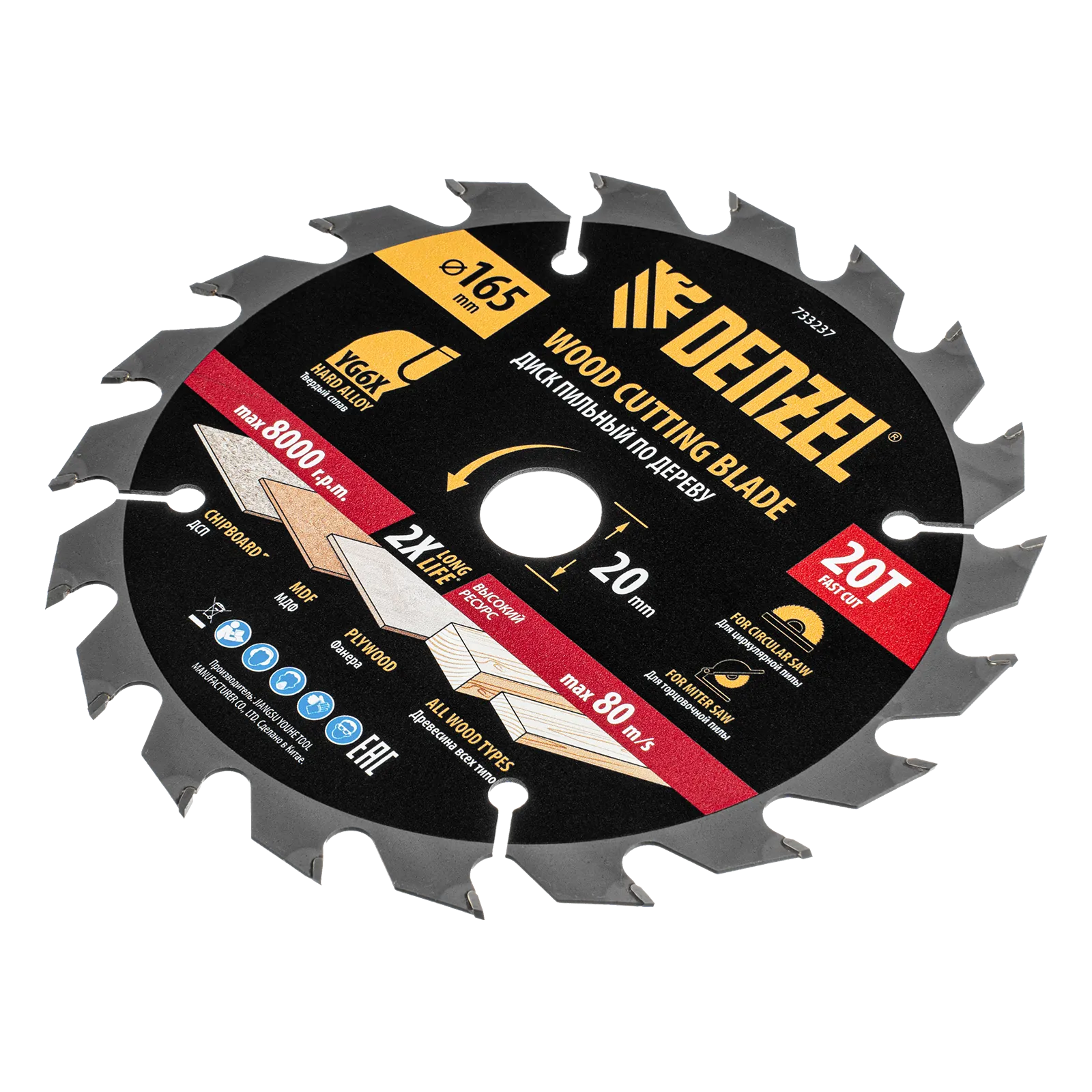 Пильный диск Denzel 733237 диаметром 165 x 20 мм, с 20 зубьями, предназначен для продольного и поперечного распила твердой и мягкой древесины, фанеры, МДФ, ДСП. 20 зубьев типа ATB с режущими пластинами оптимальной геометрии обеспечивают быстрый рез. Режущие пластины из твердого сплава YG6X сохраняют рабочие свойства при интенсивном использовании. Диск устанавливается на циркулярную, торцовочную пилу или на распиловочный станок. В комплект поставки входит переходное кольцо с 20 на 16 мм, что позволяет изменить посадочный размер и расширяет возможности использования диска.