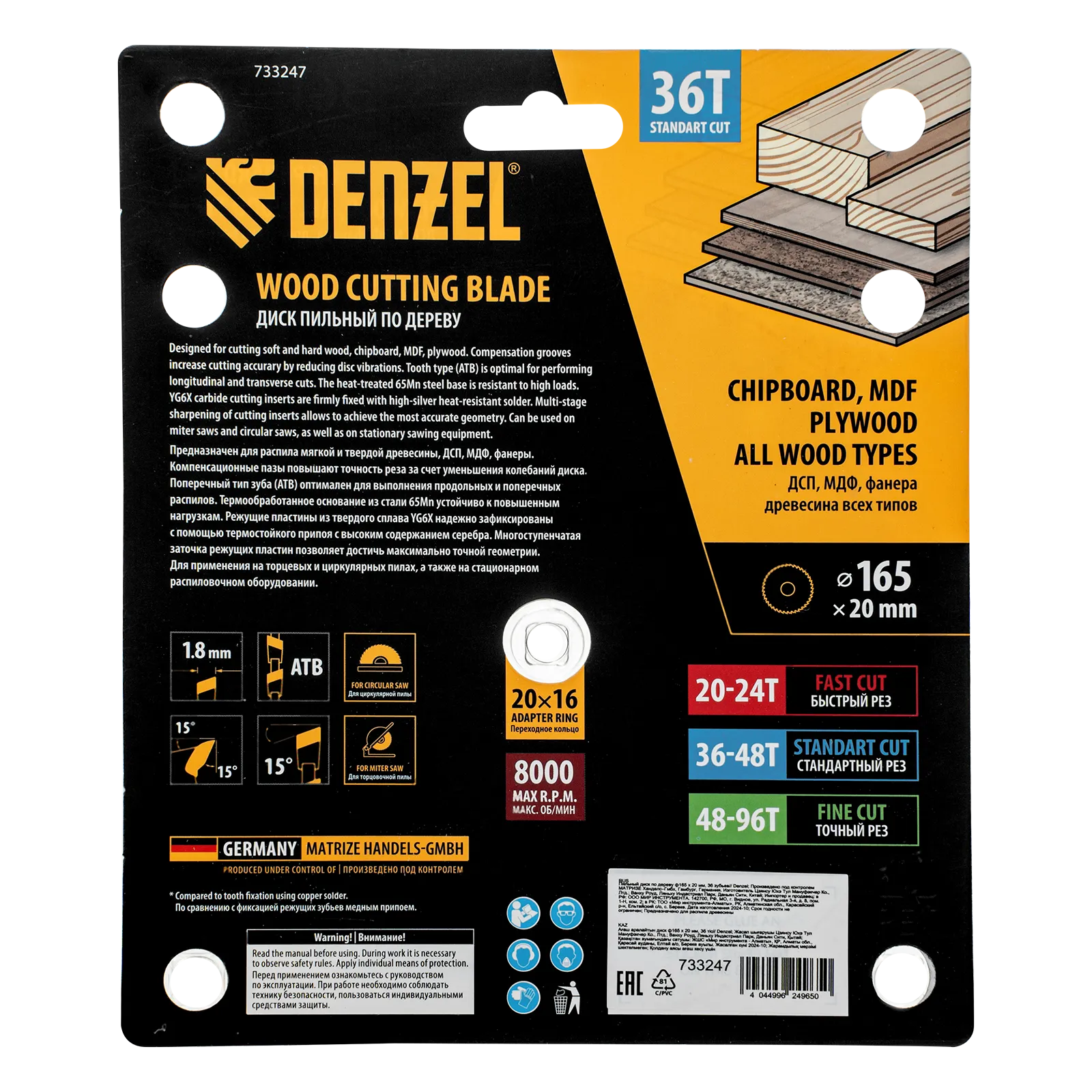 Пильный диск Denzel 733247 диаметром 165 x 20 мм, с 36 зубьями, предназначен для продольного и поперечного распила твердой и мягкой древесины, фанеры, МДФ, ДСП. 36 зубьев типа ATB с режущими пластинами оптимальной геометрии обеспечивают качественный рез. Тип реза — стандартный. Режущие пластины из твердого сплава YG6X сохраняют рабочие свойства при интенсивном использовании. Диск устанавливается на циркулярную, торцовочную пилу или на распиловочный станок. В комплект поставки входит переходное кольцо с 20 на 16 мм, что позволяет изменить посадочный размер и расширяет возможности использования диска.