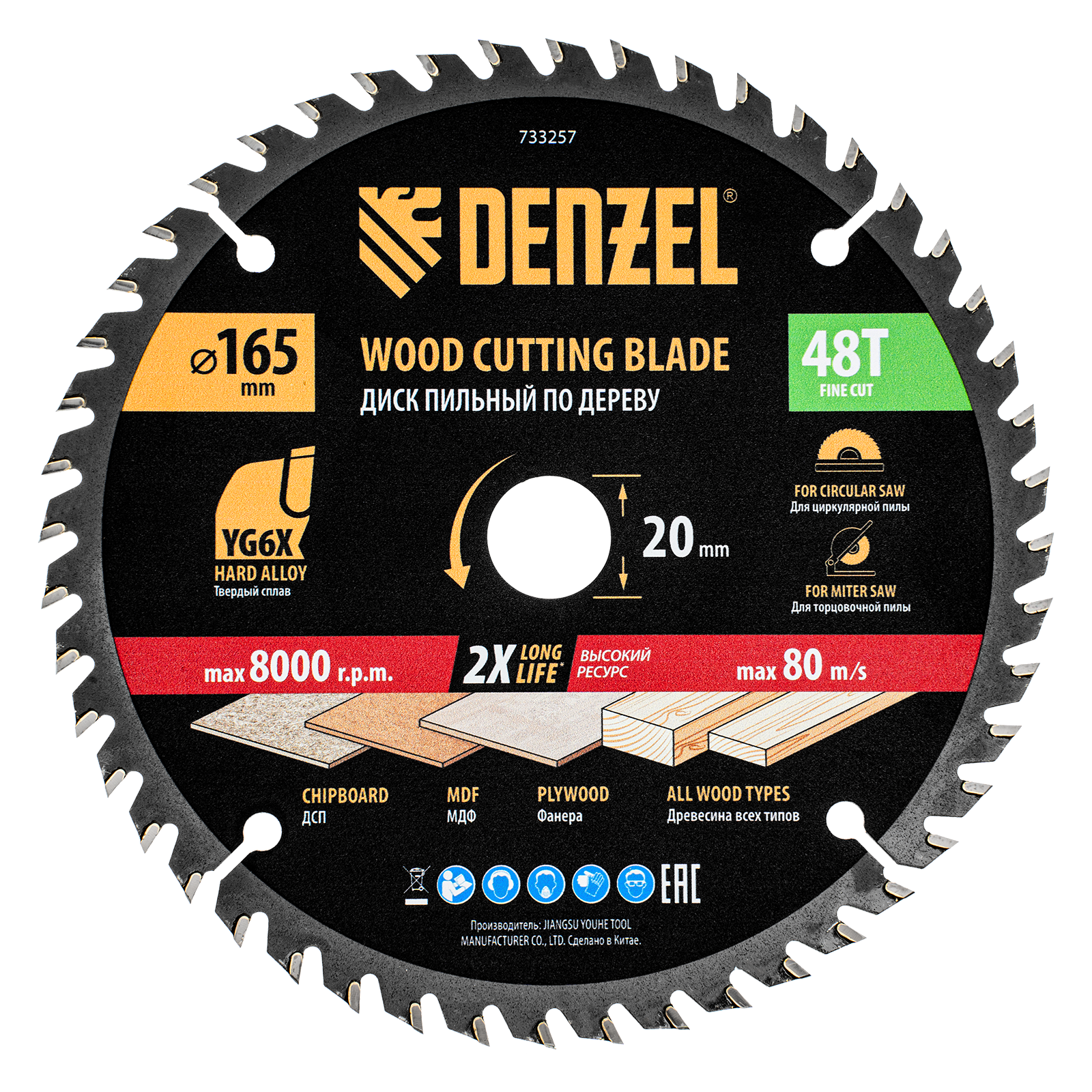 Пильный диск Denzel 733257 диаметром 165 x 20 мм, с 48 зубьями, предназначен для продольного и поперечного распила твердой и мягкой древесины, фанеры, МДФ, ДСП. 48 зубьев типа ATB с режущими пластинами оптимальной геометрии обеспечивают качественный рез. Тип реза — стандартный. Режущие пластины из твердого сплава YG6X сохраняют рабочие свойства при интенсивном использовании. Диск устанавливается на циркулярную, торцовочную пилу или на распиловочный станок. В комплект поставки входит переходное кольцо с 20 на 16 мм, что позволяет изменить посадочный размер и расширяет возможности использования диска.