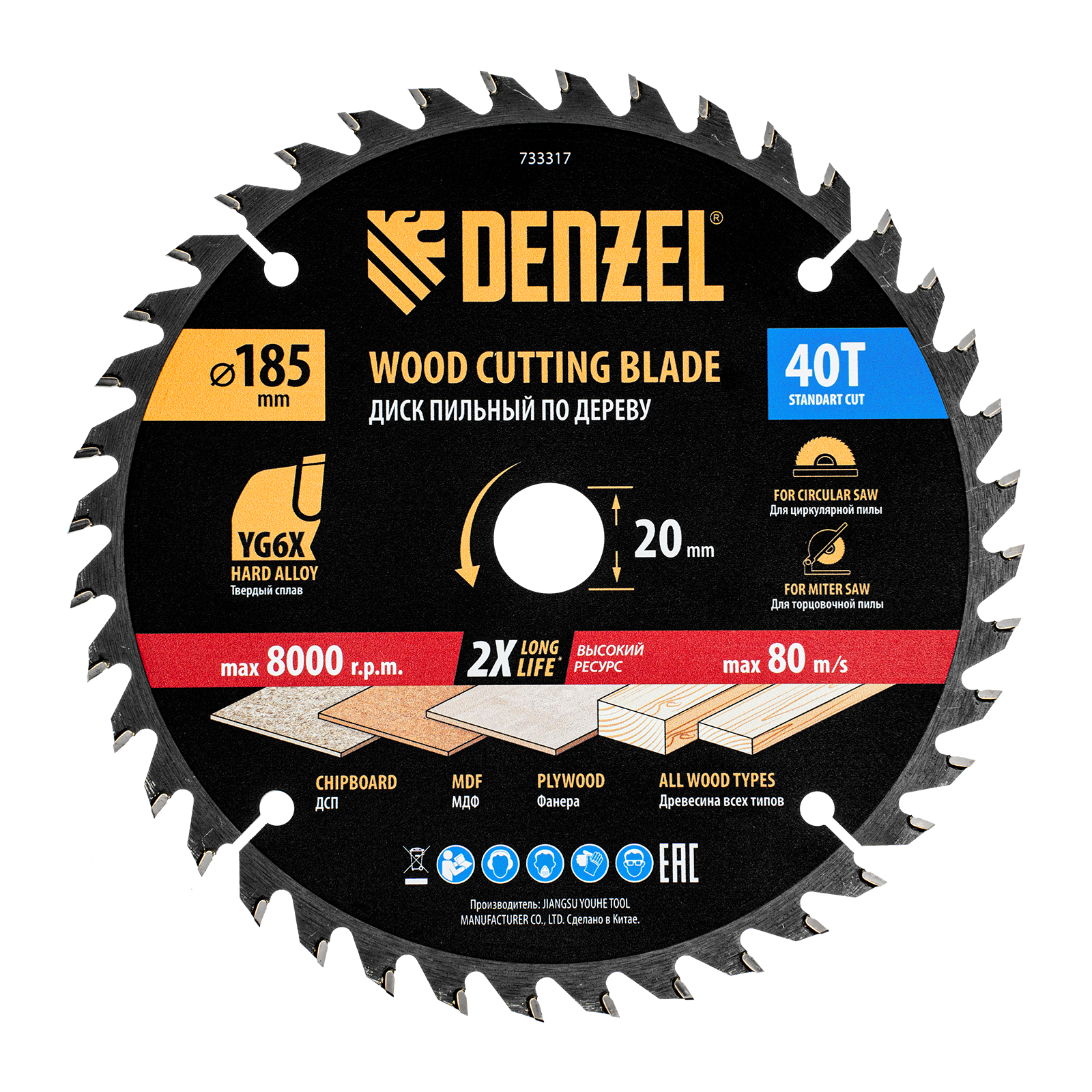 Пильный диск Denzel 733317 диаметром 185 x 20 мм, с 40 зубьями, предназначен для продольного и поперечного распила твердой и мягкой древесины, фанеры, МДФ, ДСП. 40 зубьев типа ATB с режущими пластинами оптимальной геометрии обеспечивают качественный рез. Тип реза — стандартный. Режущие пластины из твердого сплава YG6X сохраняют рабочие свойства при интенсивном использовании. Диск устанавливается на циркулярную, торцовочную пилу или на распиловочный станок. В комплект поставки входит переходное кольцо с 20 на 16 мм, что позволяет изменить посадочный размер и расширяет возможности использования диска.