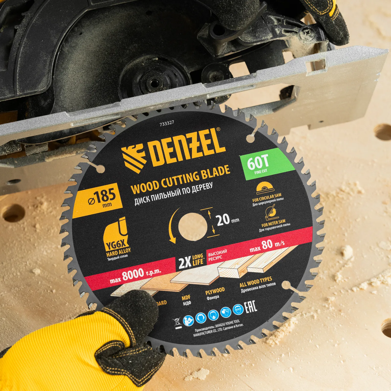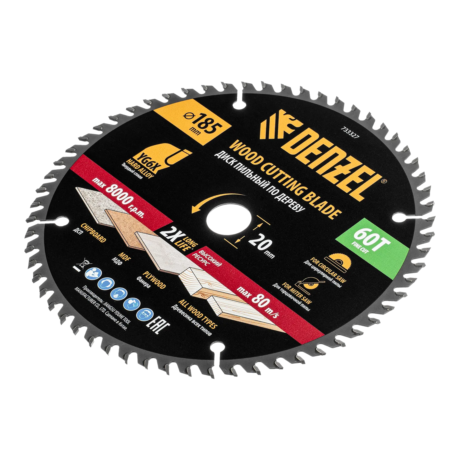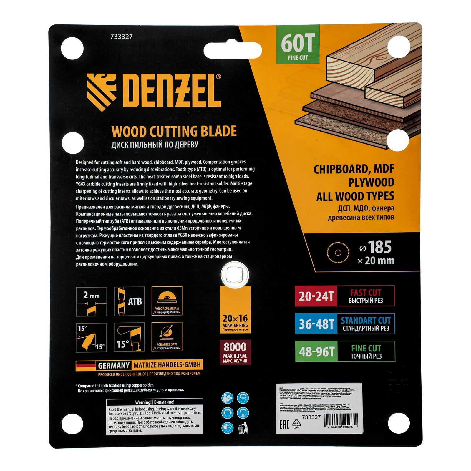 Пильный диск Denzel 733327 диаметром 185 x 20 мм, с 60 зубьями, предназначен для точного продольного и поперечного распила твердой и мягкой древесины, фанеры, МДФ, ДСП. 60 зубьев типа ATB с режущими пластинами оптимальной геометрии обеспечивают чистый рез. Режущие пластины из твердого сплава YG6X сохраняют рабочие свойства при интенсивном использовании. Диск устанавливается на циркулярную, торцовочную пилу или на распиловочный станок. В комплект поставки входит переходное кольцо с 20 на 16 мм, что позволяет изменить посадочный размер и расширяет возможности использования диска.
