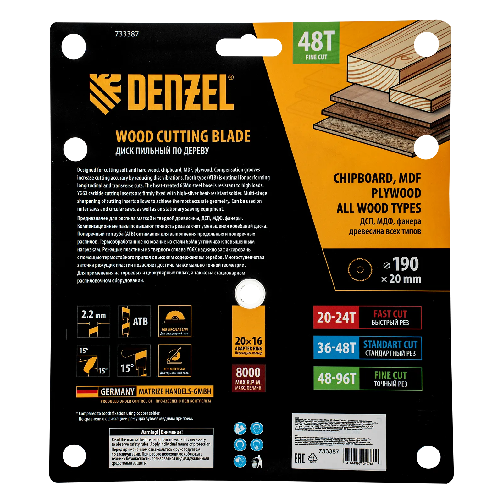 Пильный диск Denzel 733387 диаметром 190 x 20 мм, с 48 зубьями, предназначен для продольного и поперечного распила твердой и мягкой древесины, фанеры, МДФ, ДСП. 48 зубьев типа ATB с режущими пластинами оптимальной геометрии обеспечивают качественный рез. Тип реза — стандартный. Режущие пластины из твердого сплава YG6X сохраняют рабочие свойства при интенсивном использовании. Диск устанавливается на циркулярную, торцовочную пилу или на распиловочный станок. В комплект поставки входит переходное кольцо с 20 на 16 мм, что позволяет изменить посадочный размер и расширяет возможности использования диска.