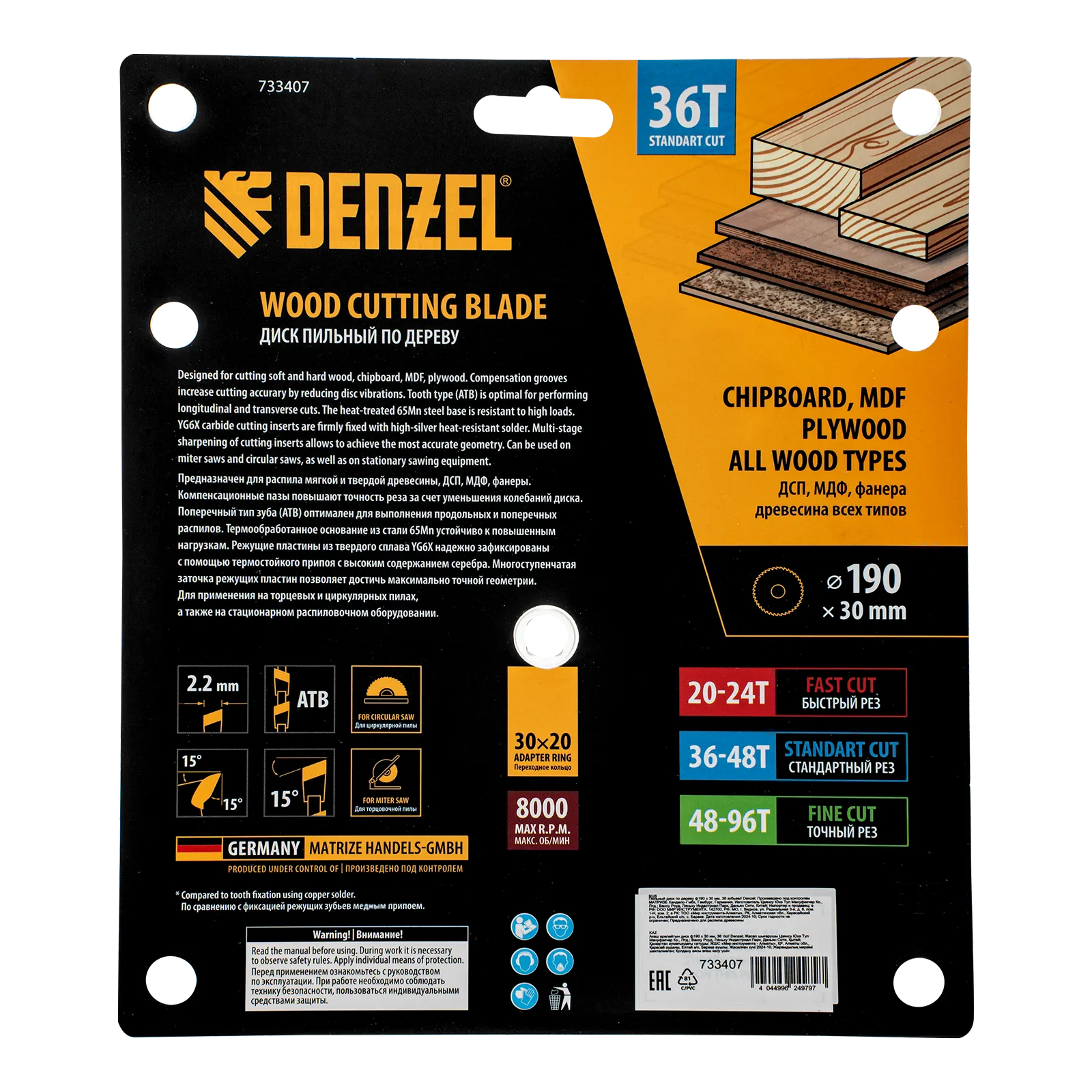 Пильный диск Denzel 733407 диаметром 190 x 30 мм, с 36 зубьями, предназначен для продольного и поперечного распила твердой и мягкой древесины, фанеры, МДФ, ДСП. 36 зубьев типа ATB с режущими пластинами оптимальной геометрии обеспечивают качественный рез. Тип реза — стандартный. Режущие пластины из твердого сплава YG6X сохраняют рабочие свойства при интенсивном использовании. Диск устанавливается на циркулярную, торцовочную пилу или на распиловочный станок. В комплект поставки входит переходное кольцо с 30 на 20 мм, что позволяет изменить посадочный размер и расширяет возможности использования диска.