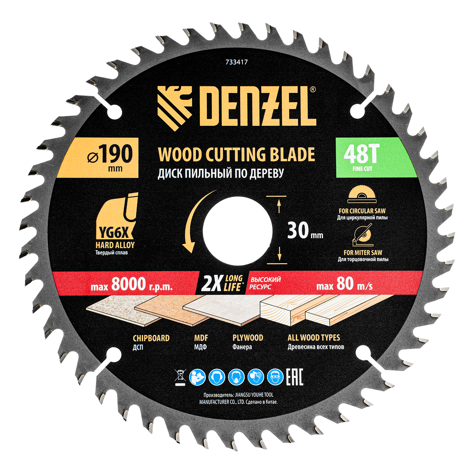 Пильный диск Denzel 733417 диаметром 190 x 30 мм, с 48 зубьями, предназначен для продольного и поперечного распила твердой и мягкой древесины, фанеры, МДФ, ДСП. 48 зубьев типа ATB с режущими пластинами оптимальной геометрии обеспечивают качественный рез. Тип реза — стандартный. Режущие пластины из твердого сплава YG6X сохраняют рабочие свойства при интенсивном использовании. Диск устанавливается на циркулярную, торцовочную пилу или на распиловочный станок. В комплект поставки входит переходное кольцо с 30 на 20 мм, что позволяет изменить посадочный размер и расширяет возможности использования диска.