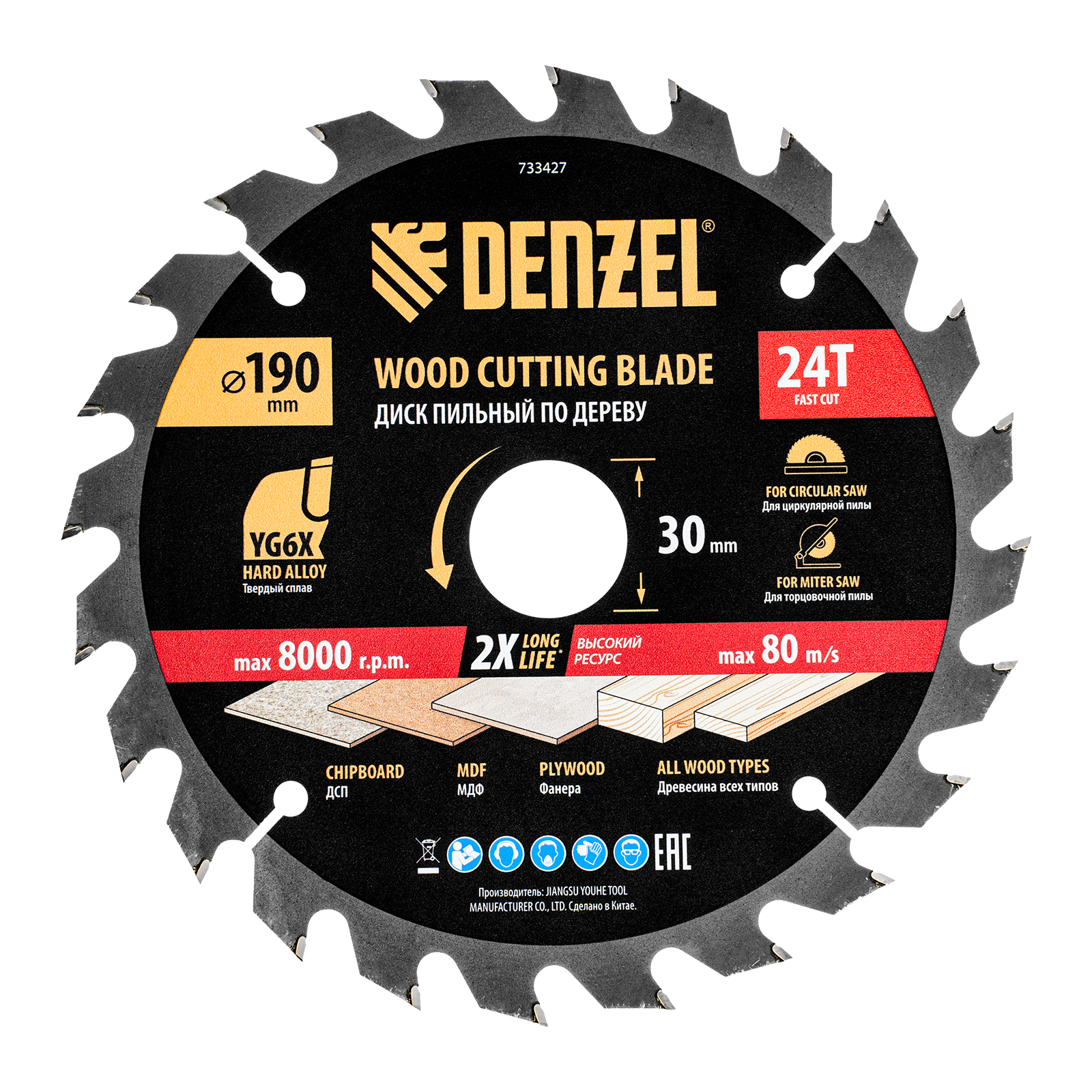 Тонкий пильный диск Denzel 733427 диаметром 190 x 30 мм, с 24 зубьями, устанавливается на циркулярную, торцовочную пилу или распиловочный станок и предназначен для выполнения работ по дереву. Подходит для быстрого реза древесины любого типа, а также фанеры, ДСП, МДФ. Крупные зубья типа ATB обеспечивают высокую скорость как продольного, так и поперечного распила. Толщина диска уменьшена, что повышает производительность и снижает нагрузку на инструмент. На зубья напаяны твердосплавные пластины, длительное время сохраняющие режущую способность. Пластины из твердого сплава YG6X прошли многоступенчатую заточку, что позволило достичь оптимальной геометрии и максимальной эффективности распиловки.