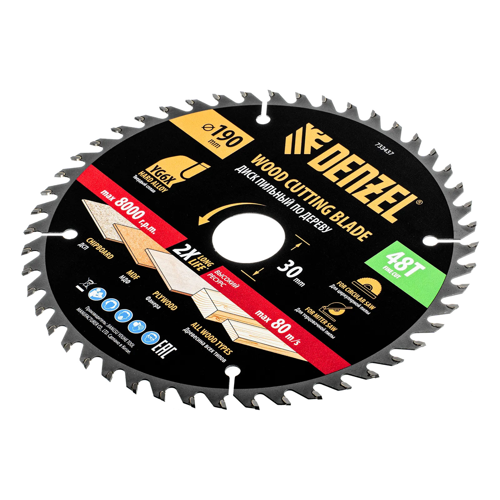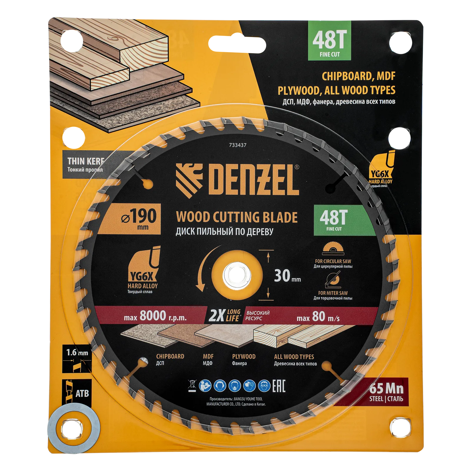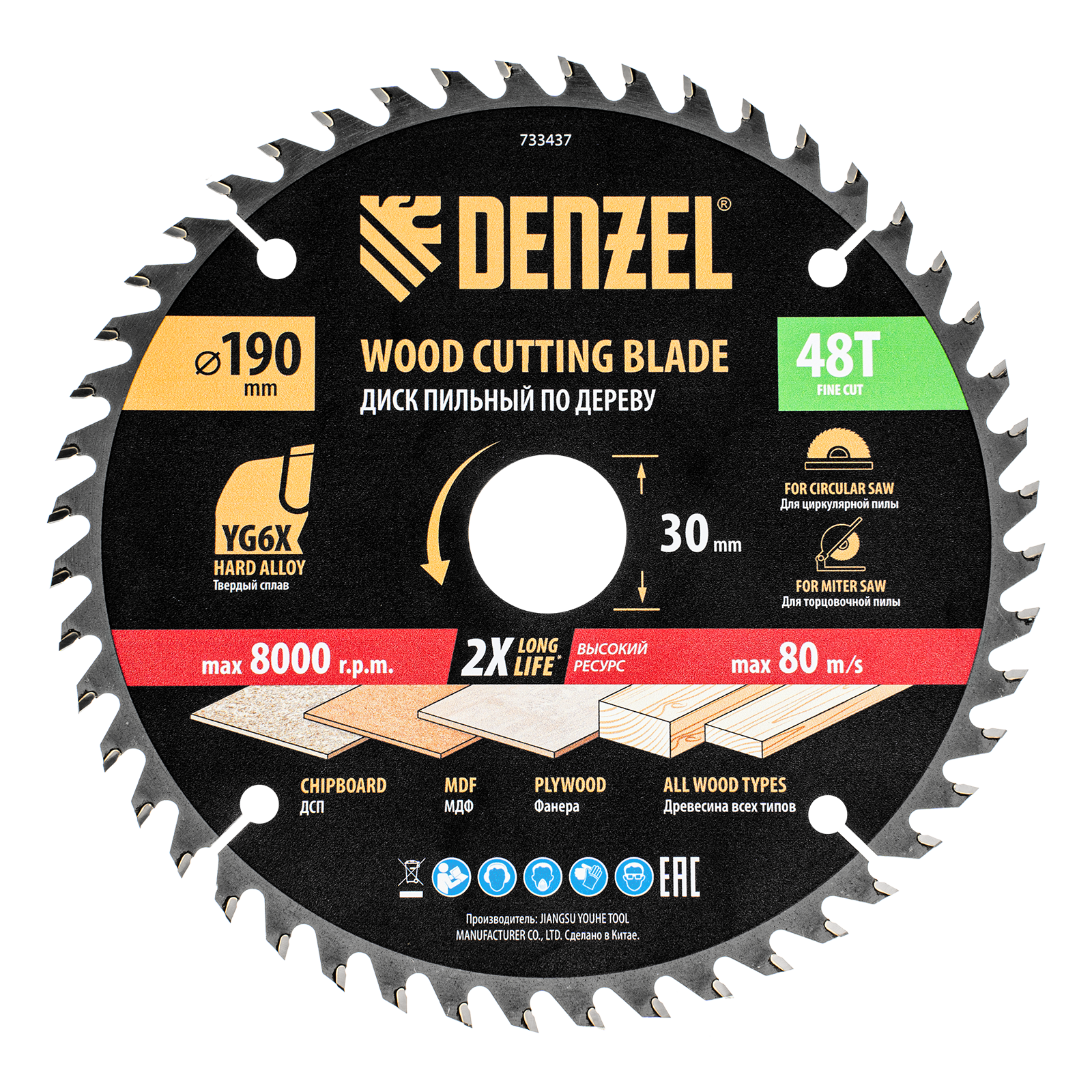 Тонкий пильный диск Denzel 733437 диаметром 190 x 30 мм, с 48 зубьями, устанавливается на циркулярную, торцовочную пилу или распиловочный станок и предназначен для выполнения работ по дереву. Подходит для распиливания древесины любого типа, а также фанеры, ДСП, МДФ. Зубья типа ATB обеспечивают высокое качество и скорость как продольного, так и поперечного распила. Тип реза — стандартный. Толщина диска уменьшена, что повышает производительность и снижает нагрузку на инструмент. На зубья напаяны твердосплавные пластины, длительное время сохраняющие режущую способность. Пластины из твердого сплава YG6X прошли многоступенчатую заточку, что позволило достичь оптимальной геометрии и максимальной эффективности распиловки.