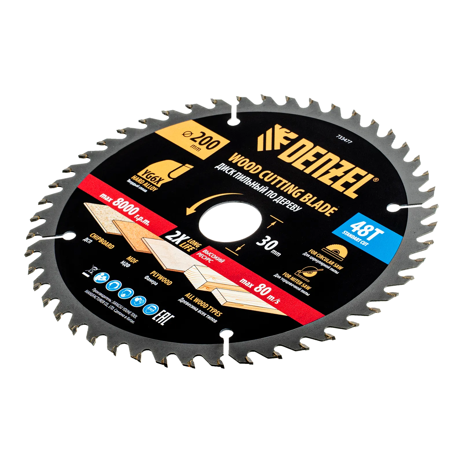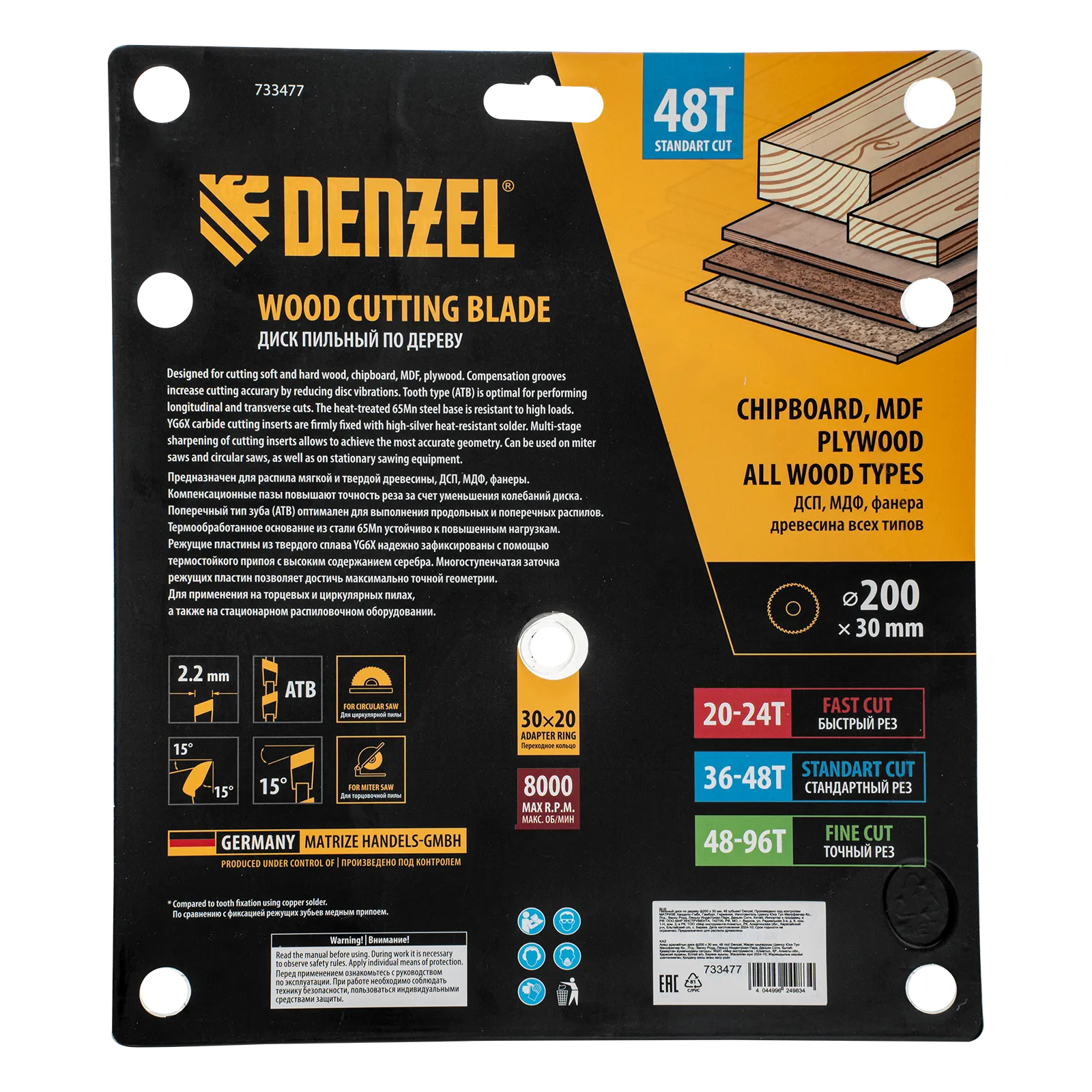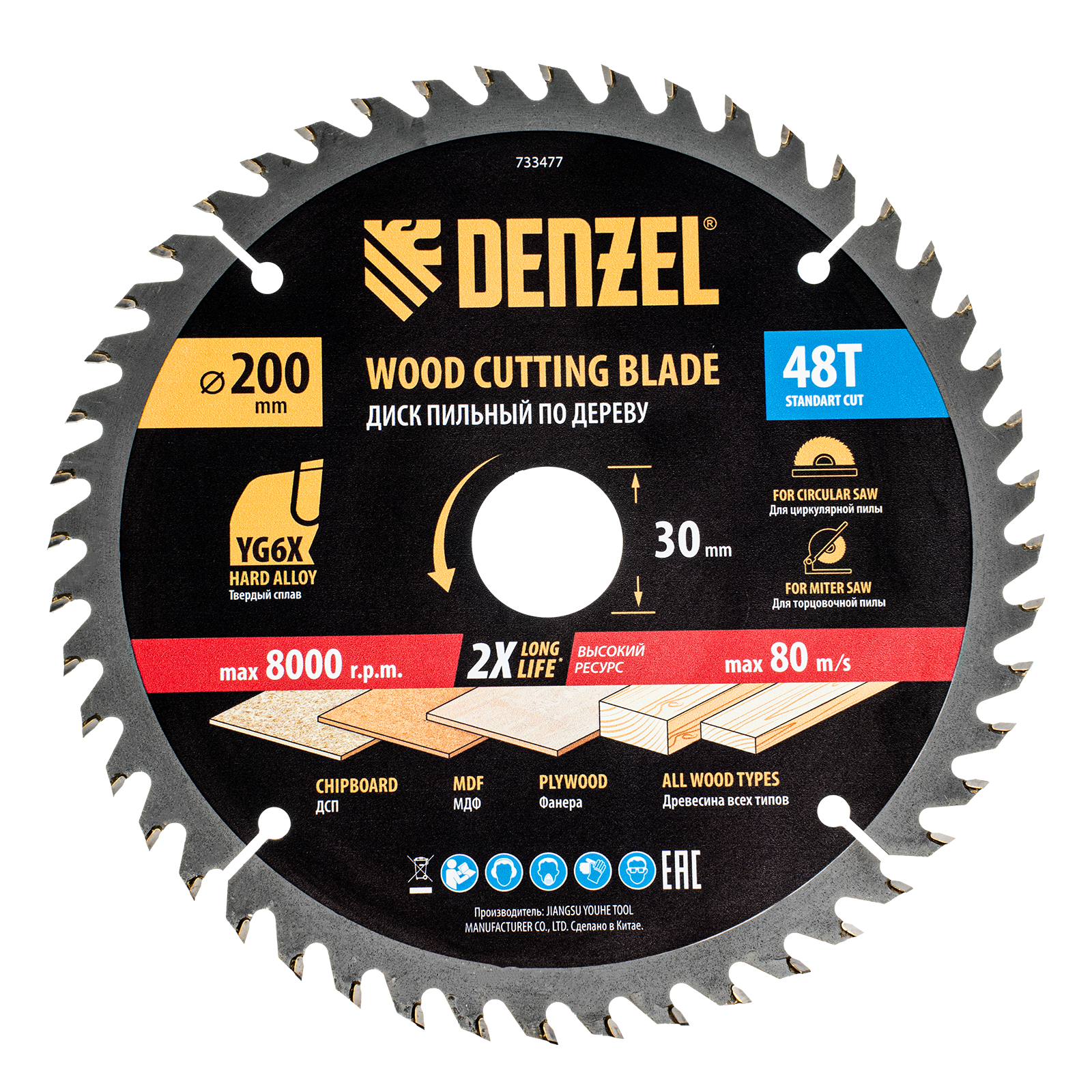 Пильный диск Denzel 733477 диаметром 200 x 30 мм, с 48 зубьями, предназначен для продольного и поперечного распила твердой и мягкой древесины, фанеры, МДФ, ДСП. 48 зубьев типа ATB с режущими пластинами оптимальной геометрии обеспечивают качественный рез. Тип реза — стандартный. Режущие пластины из твердого сплава YG6X сохраняют рабочие свойства при интенсивном использовании. Диск устанавливается на циркулярную, торцовочную пилу или на распиловочный станок. В комплект поставки входит переходное кольцо с 30 на 20 мм, что позволяет изменить посадочный размер и расширяет возможности использования диска.