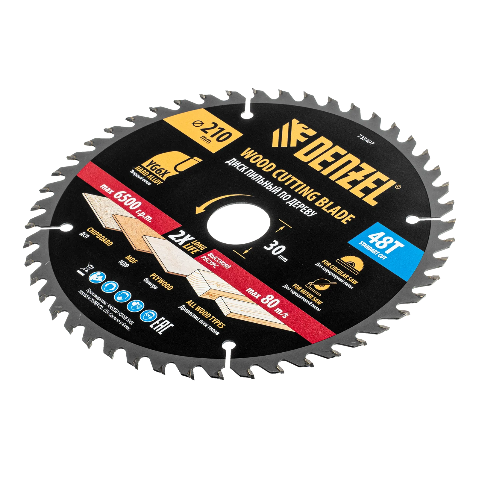 Пильный диск Denzel 733497 диаметром 210 x 30 мм, с 48 зубьями, предназначен для продольного и поперечного распила твердой и мягкой древесины, фанеры, МДФ, ДСП. 48 зубьев типа ATB с режущими пластинами оптимальной геометрии обеспечивают качественный рез. Тип реза — стандартный. Режущие пластины из твердого сплава YG6X сохраняют рабочие свойства при интенсивном использовании. Диск устанавливается на циркулярную, торцовочную пилу или на распиловочный станок. В комплект поставки входит переходное кольцо с 30 на 20 мм, что позволяет изменить посадочный размер и расширяет возможности использования диска.
