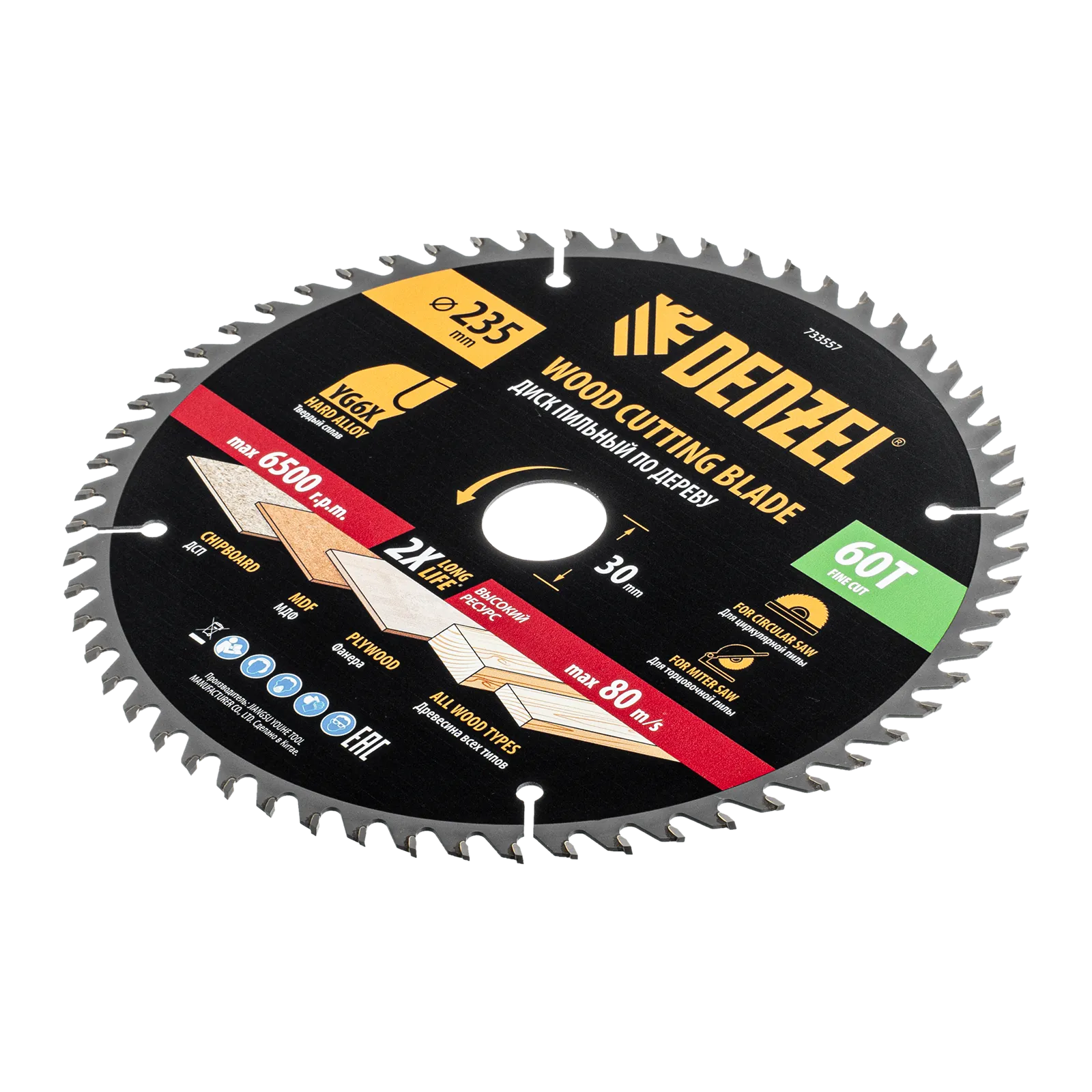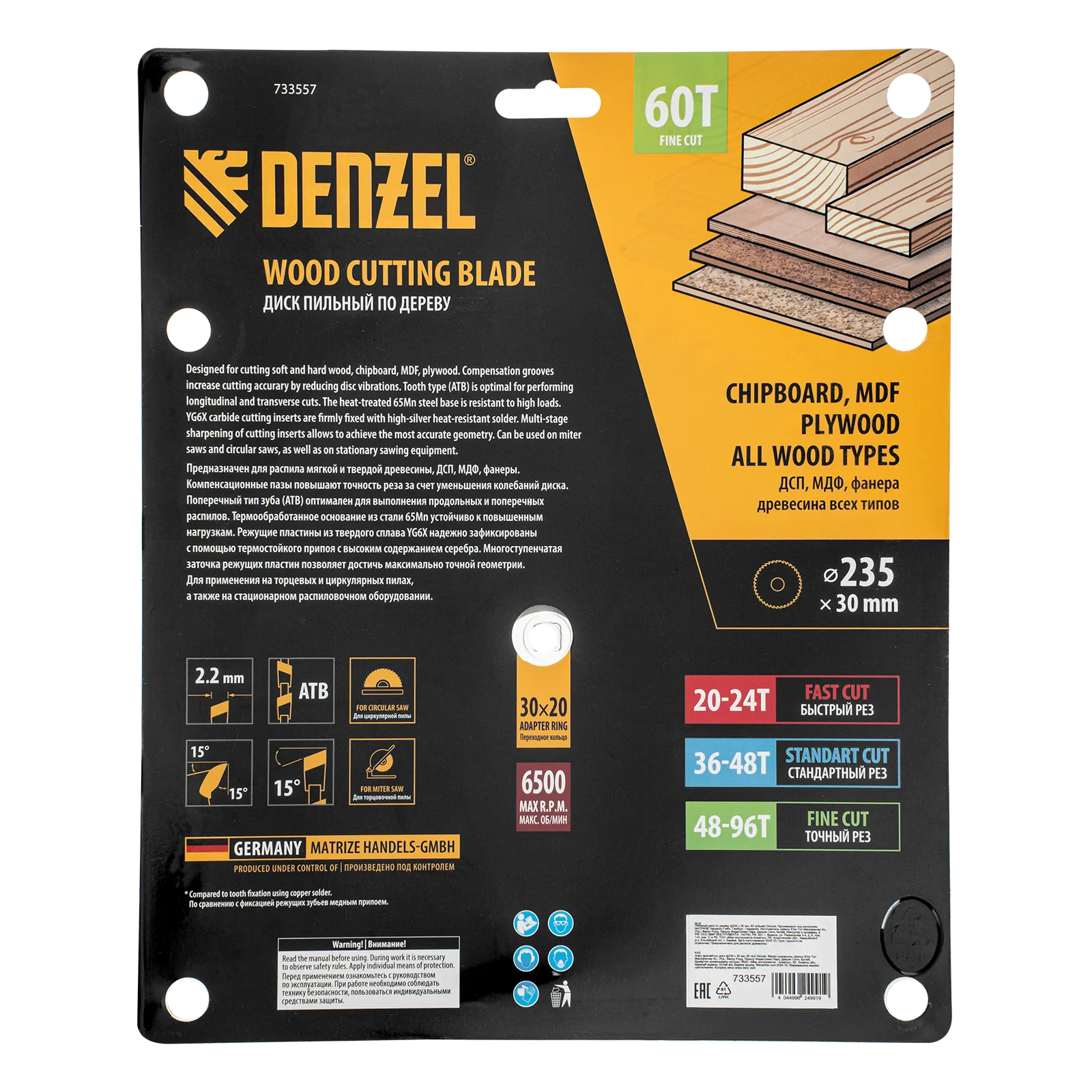 Пильный диск Denzel 733557 диаметром 235 x 30 мм, с 60 зубьями, предназначен для точного продольного и поперечного распила твердой и мягкой древесины, фанеры, МДФ, ДСП. 60 зубьев типа ATB с режущими пластинами оптимальной геометрии обеспечивают чистый рез. Режущие пластины из твердого сплава YG6X сохраняют рабочие свойства при интенсивном использовании. Диск устанавливается на циркулярную, торцовочную пилу или на распиловочный станок. В комплект поставки входит переходное кольцо с 30 на 20 мм, что позволяет изменить посадочный размер и расширяет возможности использования диска.