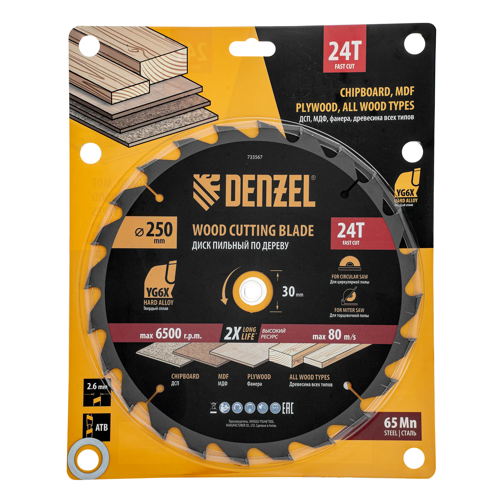Пильный диск Denzel 733567 диаметром 250 x 30 мм, с 24 зубьями, предназначен для продольного и поперечного распила твердой и мягкой древесины, фанеры, МДФ, ДСП. 24 зуба типа ATB с режущими пластинами оптимальной геометрии обеспечивают быстрый рез. Режущие пластины из твердого сплава YG6X сохраняют рабочие свойства при интенсивном использовании. Диск устанавливается на циркулярную, торцовочную пилу или на распиловочный станок. В комплект поставки входит переходное кольцо с 30 на 20 мм, что позволяет изменить посадочный размер и расширяет возможности использования диска.