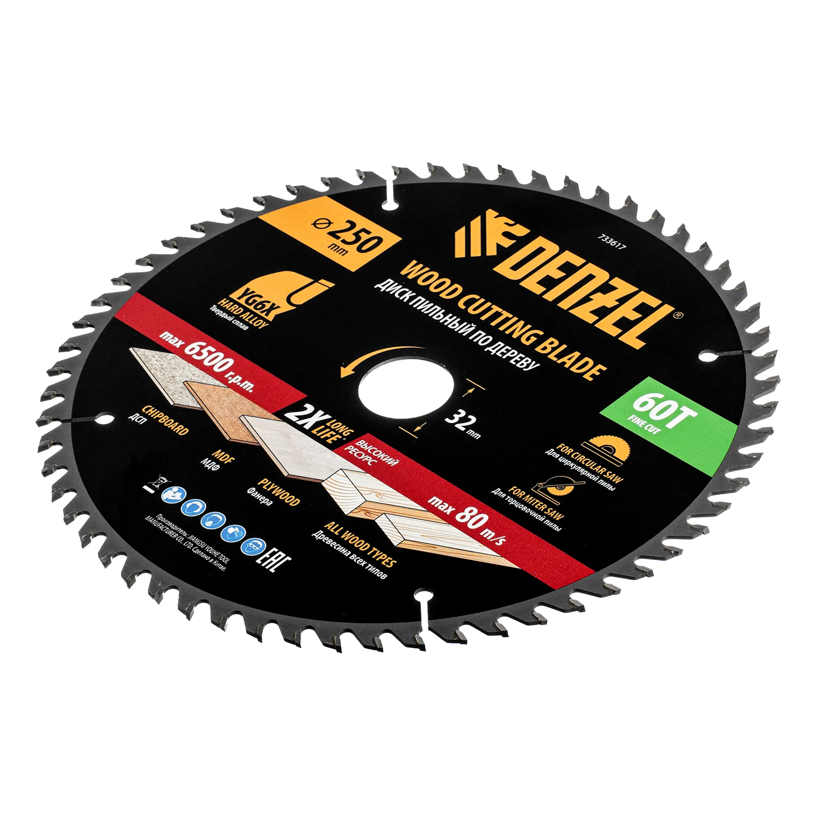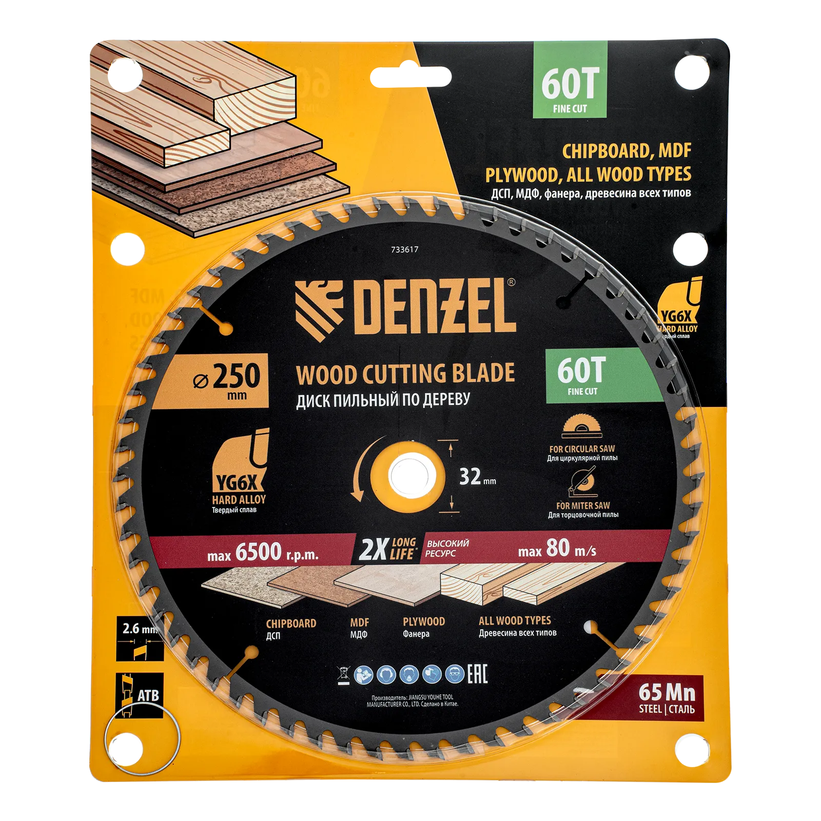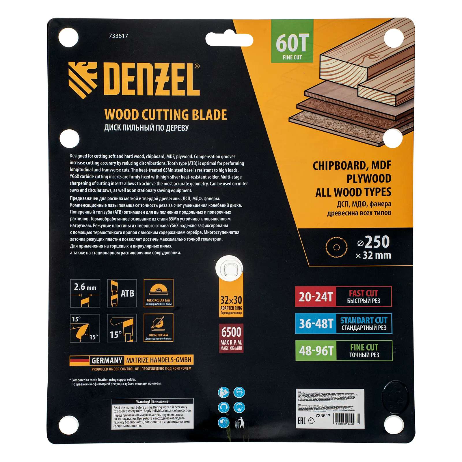 Пильный диск Denzel 733617 диаметром 250 x 32 мм, с 60 зубьями, предназначен для точного продольного и поперечного распила твердой и мягкой древесины, фанеры, МДФ, ДСП. 60 зубьев типа ATB с режущими пластинами оптимальной геометрии обеспечивают чистый рез. Режущие пластины из твердого сплава YG6X сохраняют рабочие свойства при интенсивном использовании. Диск устанавливается на циркулярную, торцовочную пилу или на распиловочный станок. В комплект поставки входит переходное кольцо с 32 на 30 мм, что позволяет изменить посадочный размер и расширяет возможности использования диска.