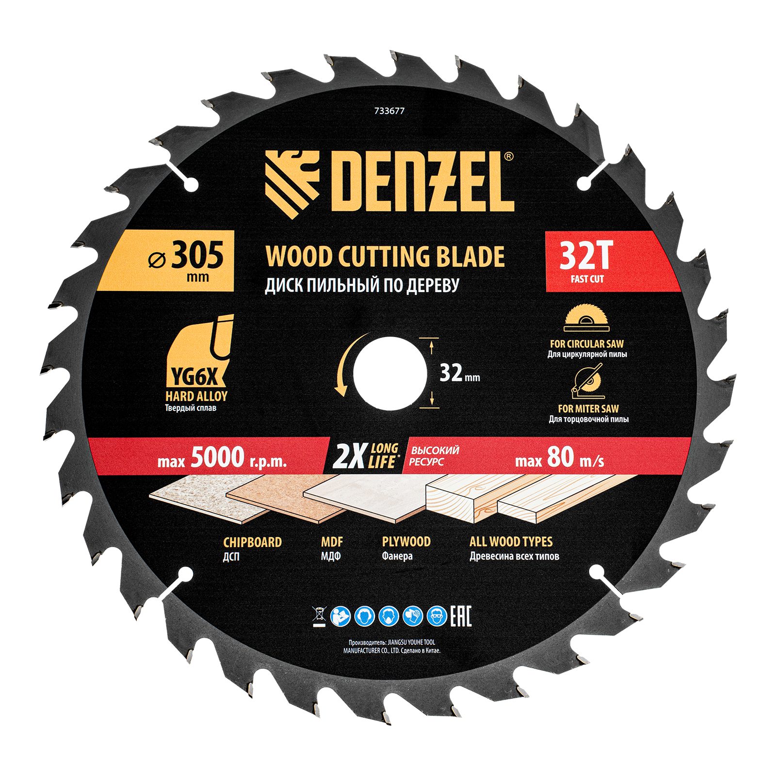 Пильный диск Denzel 733677 диаметром 305 x 32 мм, с 32 зубьями, предназначен для быстрого продольного и поперечного распила твердой и мягкой древесины, фанеры, МДФ, ДСП. 32 зуба типа ATB с режущими пластинами оптимальной геометрии обеспечивают качественный рез. Режущие пластины из твердого сплава YG6X сохраняют рабочие свойства при интенсивном использовании. Диск устанавливается на циркулярную, торцовочную пилу или на распиловочный станок. В комплект поставки входит переходное кольцо с 32 на 30 мм, что позволяет изменить посадочный размер и расширяет возможности использования диска.