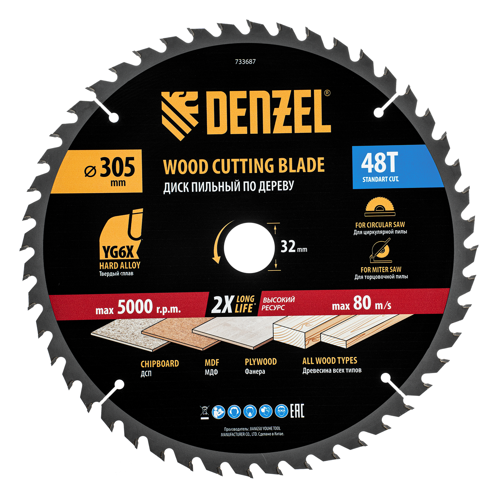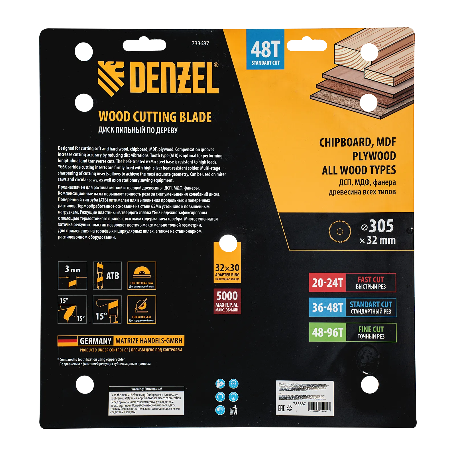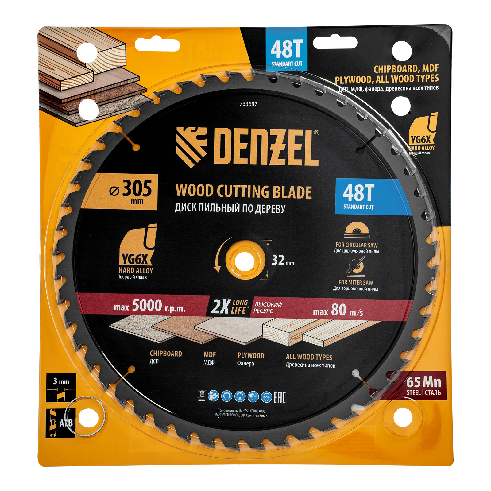 Пильный диск Denzel 733687 диаметром 305 x 32 мм, с 48 зубьями, предназначен для продольного и поперечного распила твердой и мягкой древесины, фанеры, МДФ, ДСП. 48 зубьев типа ATB с режущими пластинами оптимальной геометрии обеспечивают качественный рез. Тип реза — стандартный. Режущие пластины из твердого сплава YG6X сохраняют рабочие свойства при интенсивном использовании. Диск устанавливается на циркулярную, торцовочную пилу или на распиловочный станок. В комплект поставки входит переходное кольцо с 32 на 30 мм, что позволяет изменить посадочный размер и расширяет возможности использования диска.