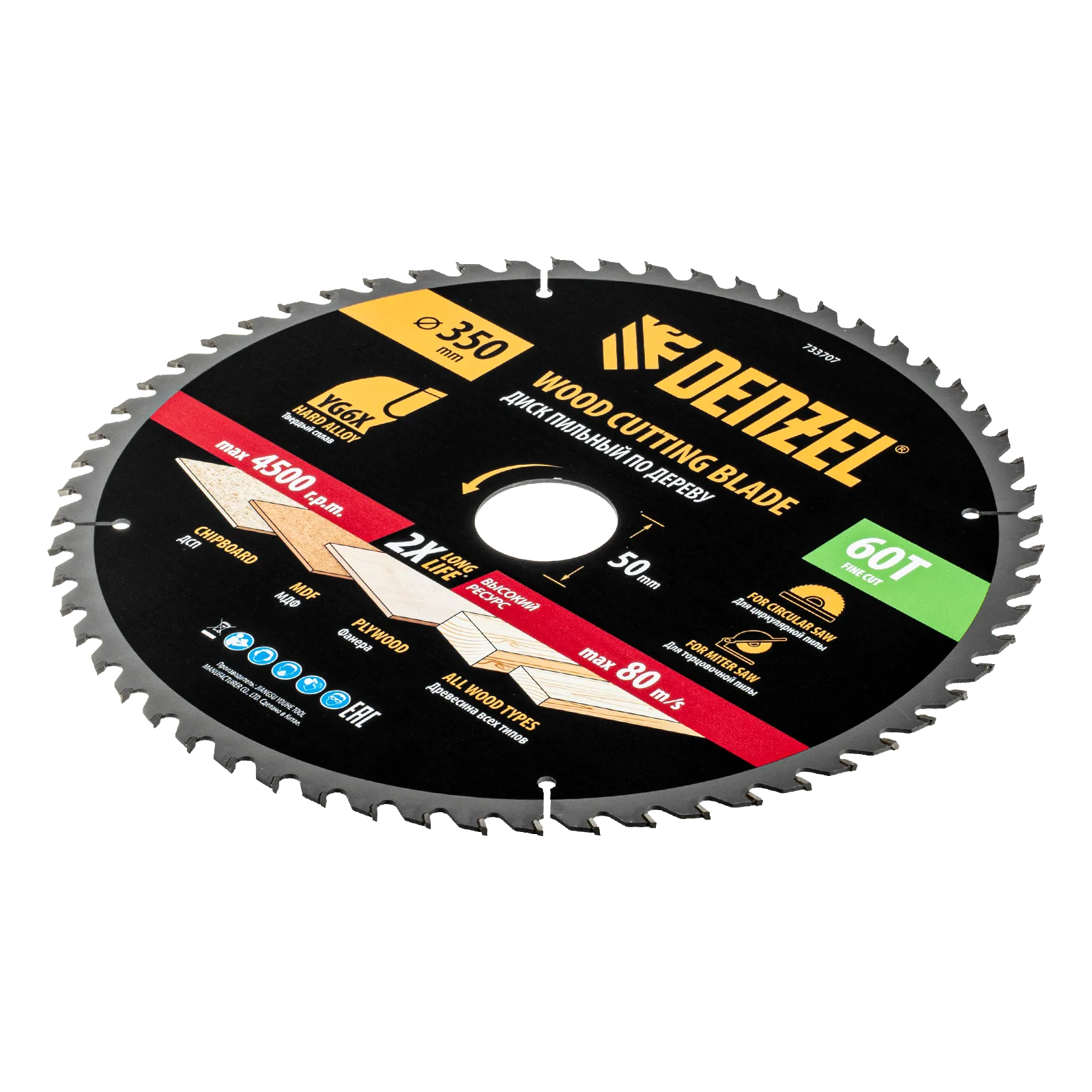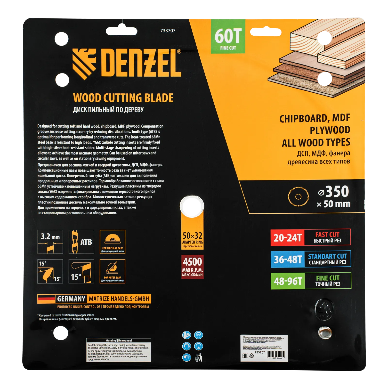 Пильный диск Denzel 733707 диаметром 350 x 50 мм, с 60 зубьями, предназначен для точного продольного и поперечного распила твердой и мягкой древесины, фанеры, МДФ, ДСП. 60 зубьев типа ATB с режущими пластинами оптимальной геометрии обеспечивают чистый рез. Режущие пластины из твердого сплава YG6X сохраняют рабочие свойства при интенсивном использовании. Диск устанавливается на циркулярную, торцовочную пилу или на распиловочный станок. В комплект поставки входит переходное кольцо с 50 на 32 мм, что позволяет изменить посадочный размер и расширяет возможности использования диска.