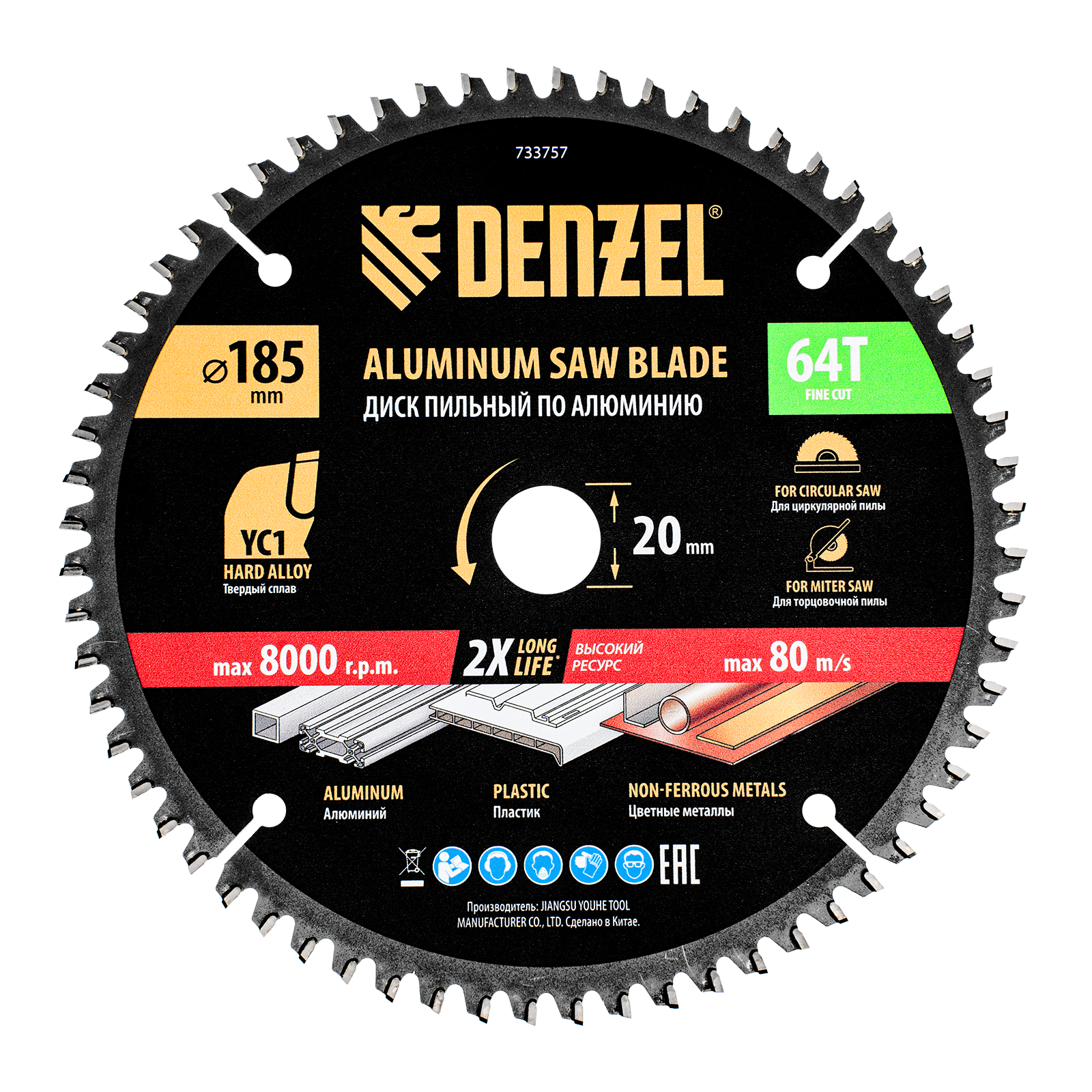 Пильный диск Denzel 733757 диаметром 185 x 20 мм, с 64 зубьями, предназначен для точного распиливания заготовок из алюминия, пластика, цветных металлов. Устанавливается на циркулярную или торцовочную пилу, также возможно использование с распиловочным станком. Зубья трапециевидно-плоского типа (TCG) с отрицательным углом заточки обеспечивают ровный рез без сколов. В комплект поставки входит переходное кольцо 20/16 мм, позволяющее изменить посадочный диаметр при необходимости.