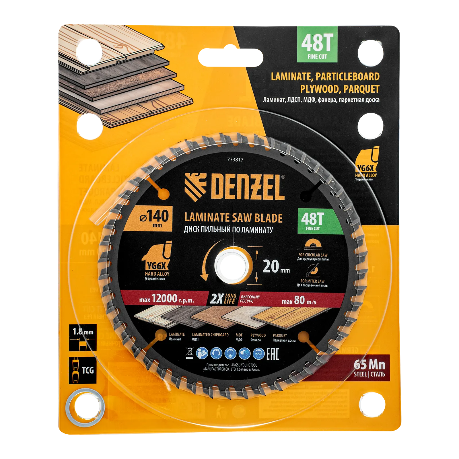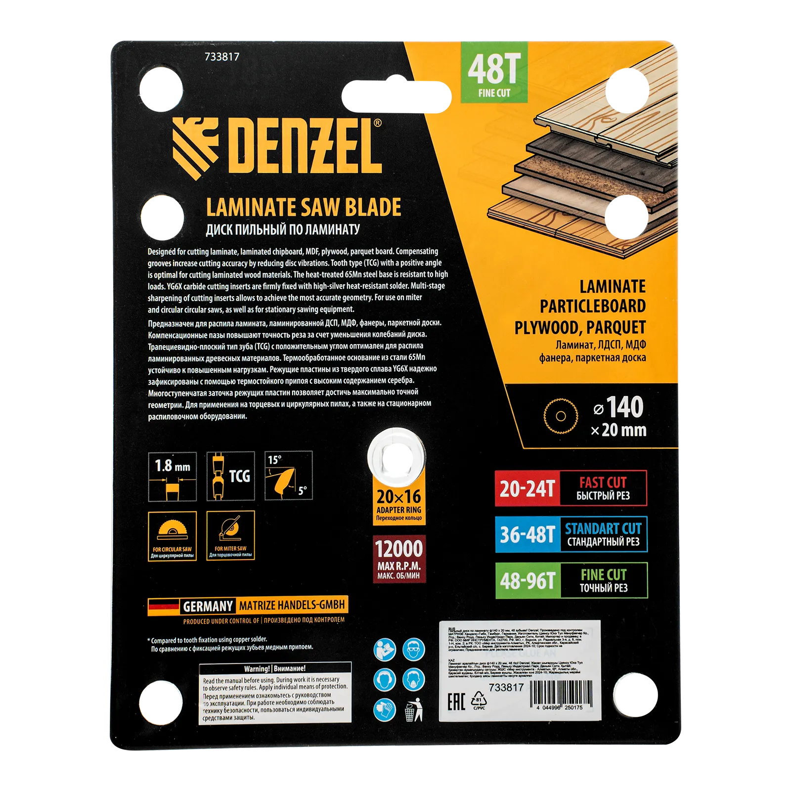 Пильный диск Denzel 733817 диаметром 140 x 20 мм, с 48 зубьями, используется для распиливания ламината, ЛДСП, МДФ, фанеры, паркетной доски. 48 трапециевидно-плоских зубьев с положительным углом заточки позволяют эффективно решать поставленные задачи, обеспечивая чистый рез. Тип реза — стандартный. Диск устанавливается на циркулярную или торцовочную пилу, а также на распиловочный станок. Можно установить оснастку на инструмент с другим посадочным диаметром — для этого предусмотрено переходное кольцо 20/16 мм.