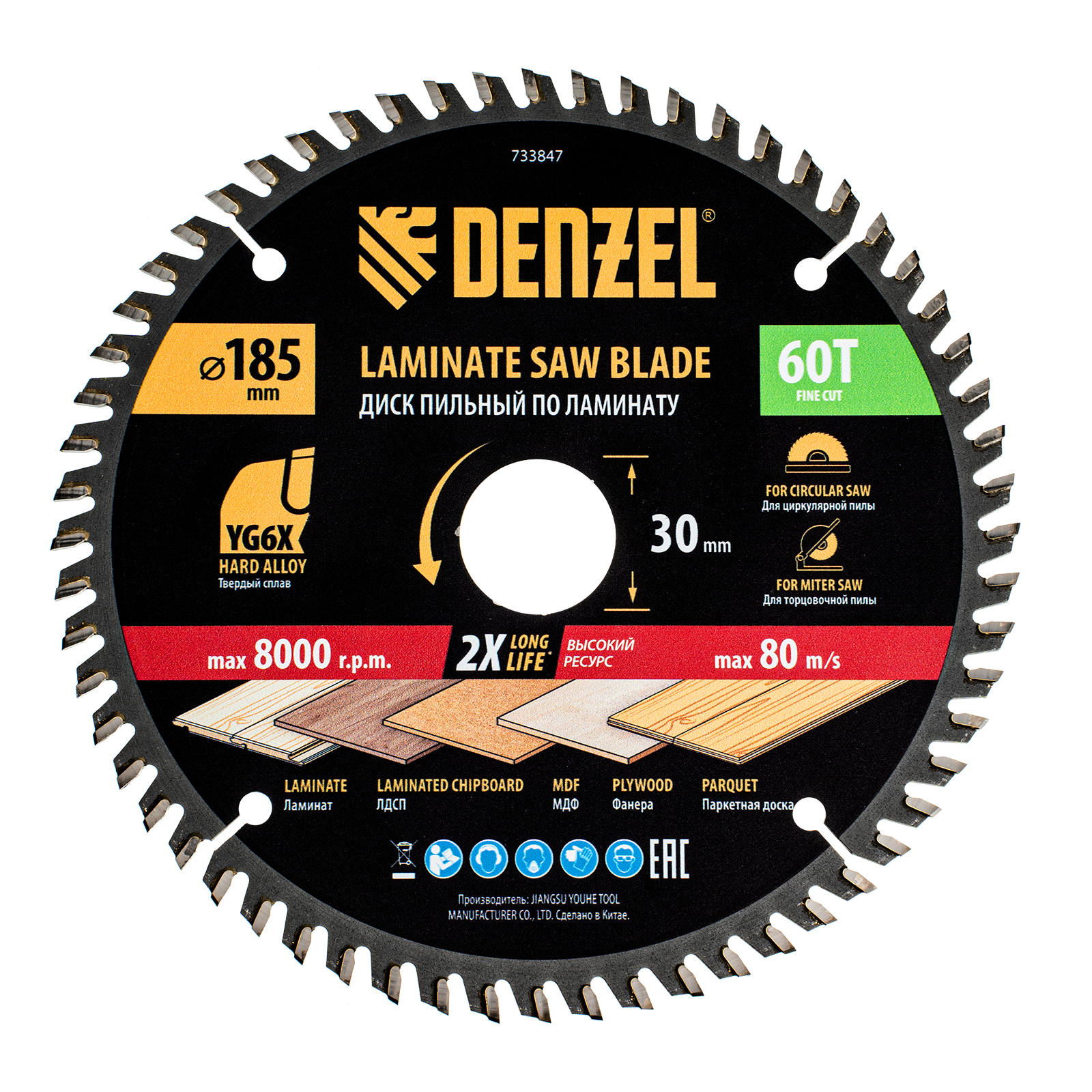 Пильный диск Denzel 733847 диаметром 185 x 30 мм, с 60 зубьями, используется для точного распиливания ламината, ЛДСП, МДФ, фанеры, паркетной доски. 60 мелких трапециевидно-плоских зубьев с положительным углом заточки позволяют эффективно решать поставленные задачи, обеспечивая чистый рез. Диск устанавливается на циркулярную или торцовочную пилу, а также на распиловочный станок. Можно установить оснастку на инструмент с другим посадочным диаметром — для этого предусмотрено переходное кольцо 30/20 мм.