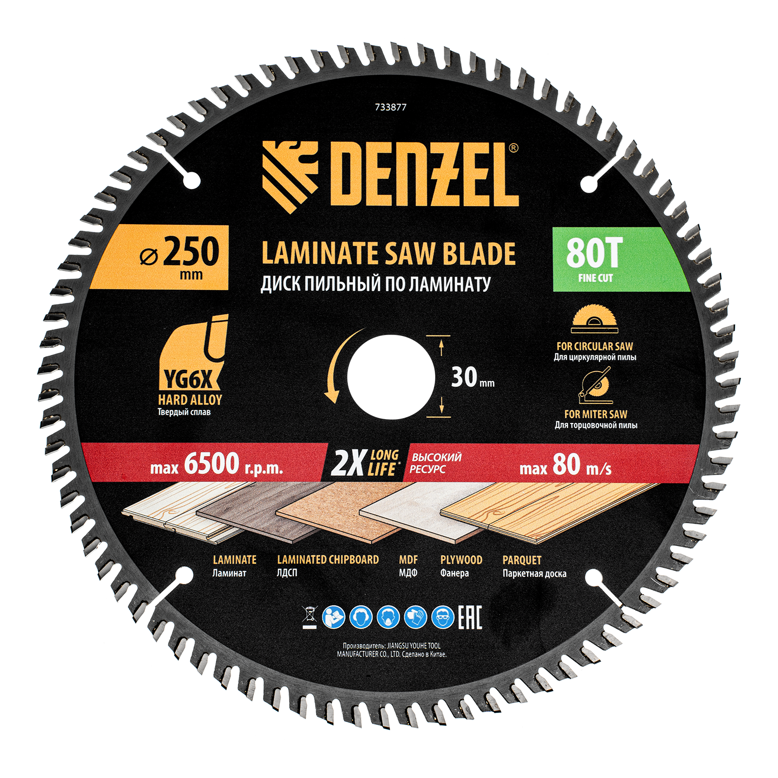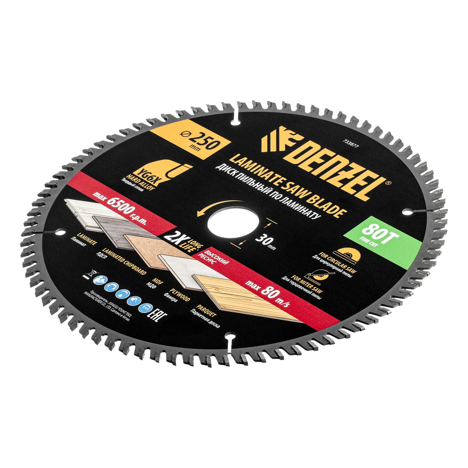 Пильный диск Denzel 733877 диаметром 250 x 30 мм, с 80 зубьями, используется для точного распиливания ламината, ЛДСП, МДФ, фанеры, паркетной доски. 80 мелких трапециевидно-плоских зубьев с положительным углом заточки позволяют эффективно решать поставленные задачи, обеспечивая максимально чистый рез. Диск устанавливается на циркулярную или торцовочную пилу, а также на распиловочный станок. Можно установить оснастку на инструмент с другим посадочным диаметром — для этого предусмотрено переходное кольцо 30/20 мм.