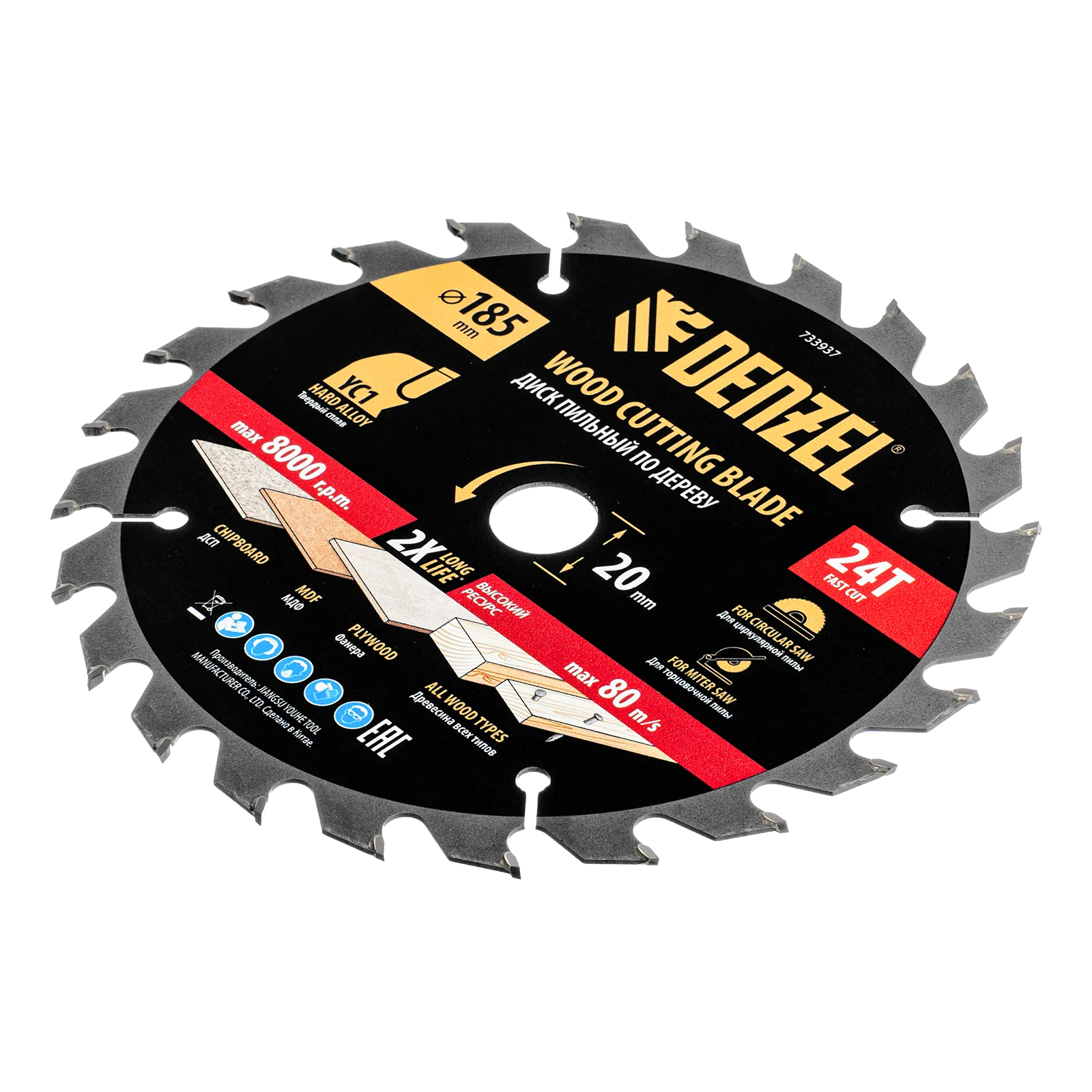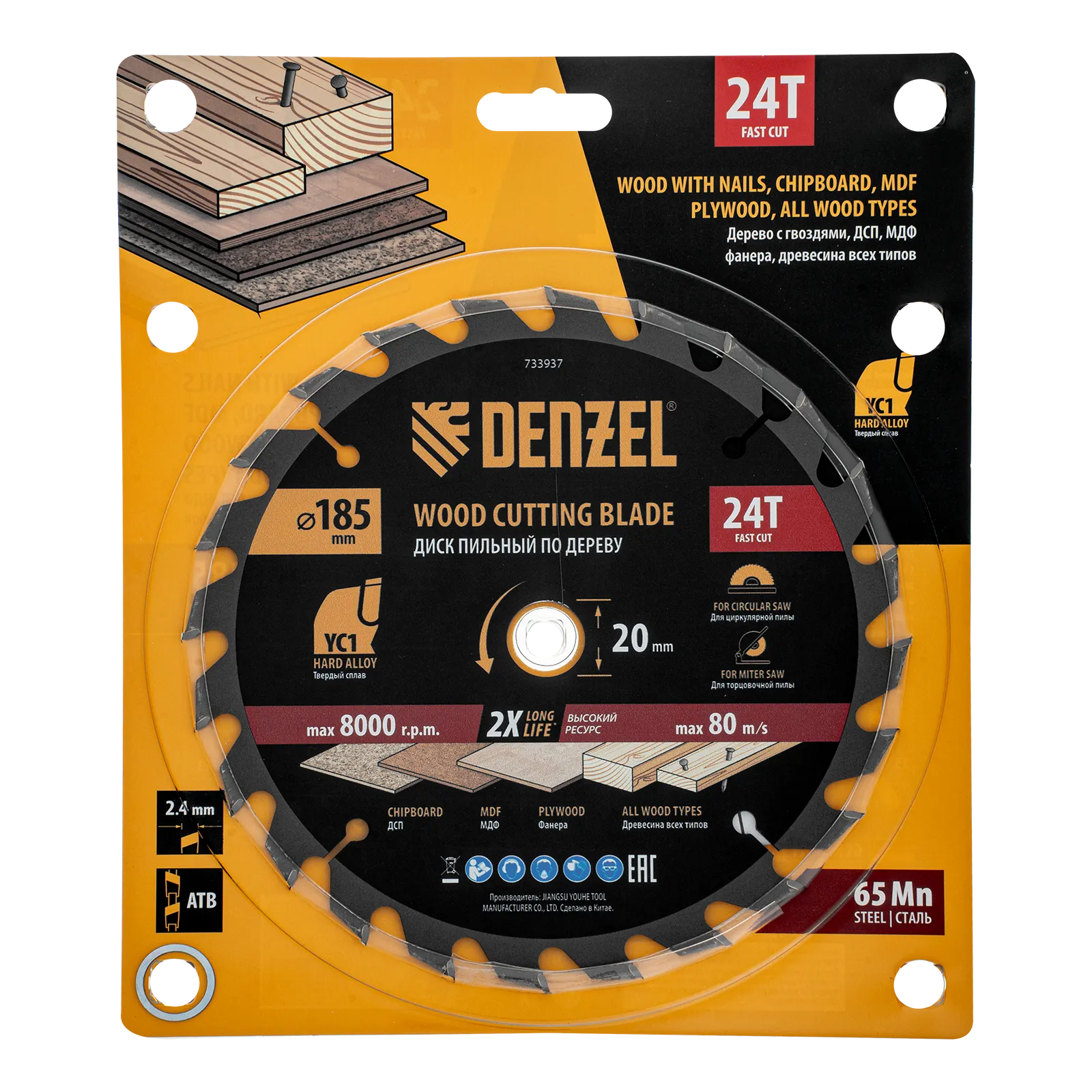 Пильный диск Denzel 733937 диаметром 185 x 20 мм, с 24 зубьями типа ATB, предназначен для быстрого продольного и поперечного распиливания древесины всех типов, в том числе с гвоздями и остатками бетона, а также ДСП, МДФ, фанеры. Режущие пластины из твердого сплава YC1, прошедшие многоступенчатую заточку, позволяют успешно справляться с прочными материалами. Диск устанавливается на циркулярную, торцовочную пилу или на распиловочный станок. В комплект поставки входит переходное кольцо 20/16 мм, позволяющее изменить посадочный диаметр при необходимости.