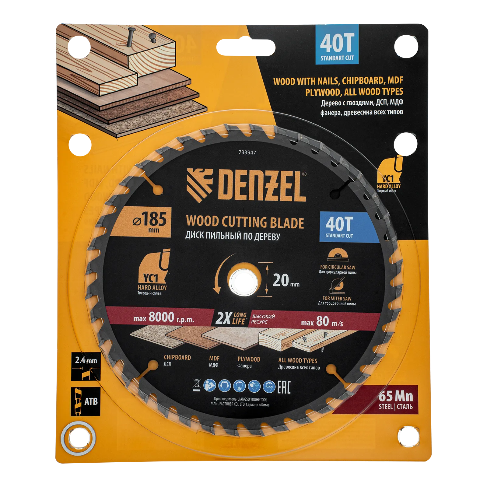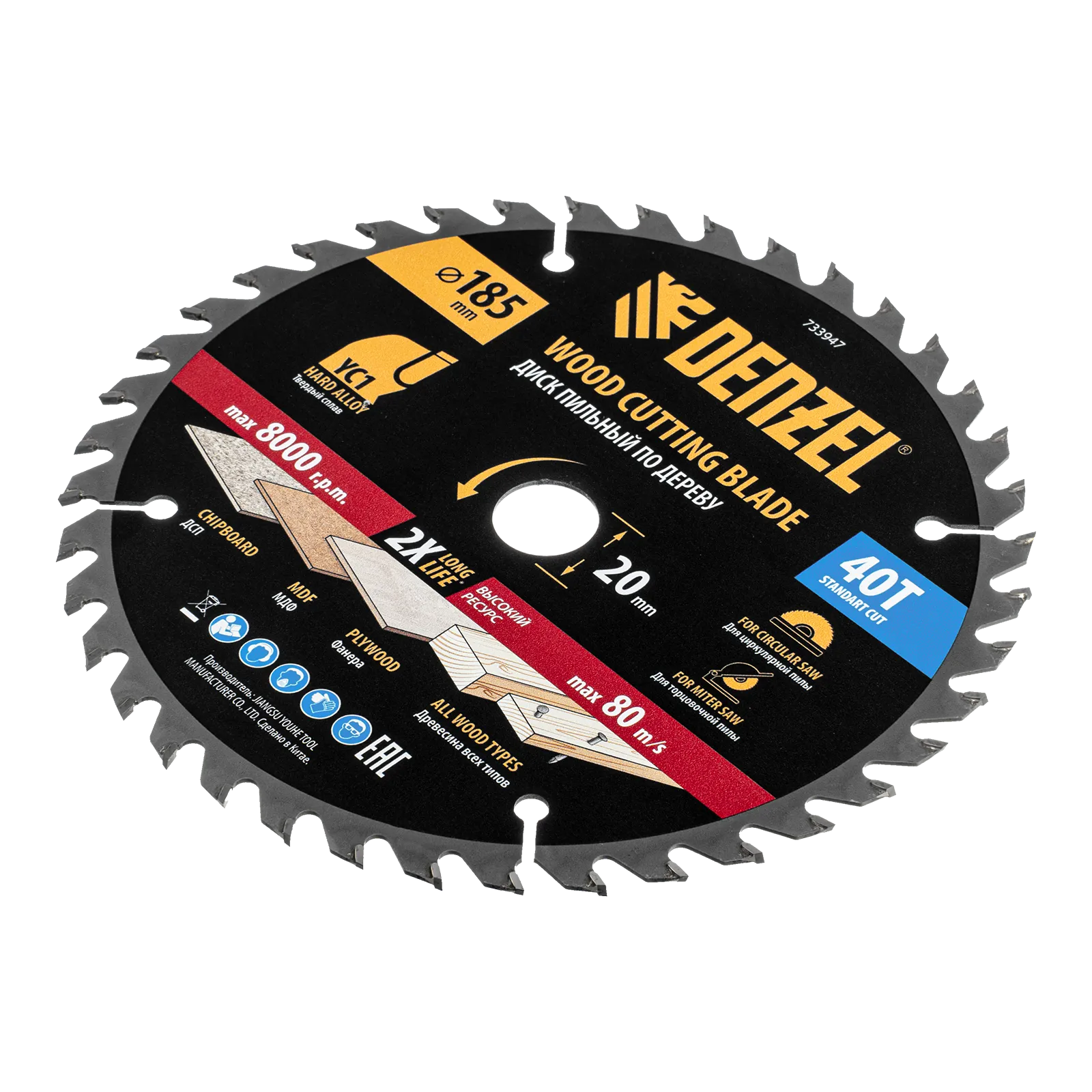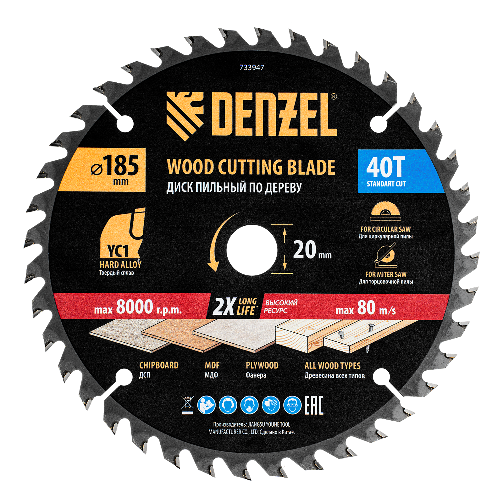 Пильный диск Denzel 733947 диаметром 185 x 20 мм, с 40 зубьями типа ATB, предназначен для продольного и поперечного распиливания древесины всех типов, в том числе с гвоздями и остатками бетона, а также ДСП, МДФ, фанеры. Тип реза — стандартный. Режущие пластины из твердого сплава YC1, прошедшие многоступенчатую заточку, позволяют успешно справляться с прочными материалами. Диск устанавливается на циркулярную, торцовочную пилу или на распиловочный станок. В комплект поставки входит переходное кольцо 20/16 мм, позволяющее изменить посадочный диаметр при необходимости.