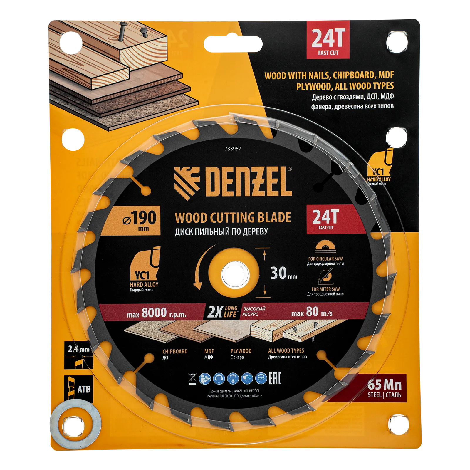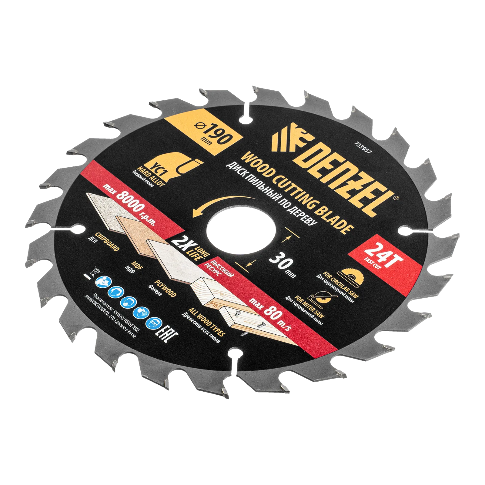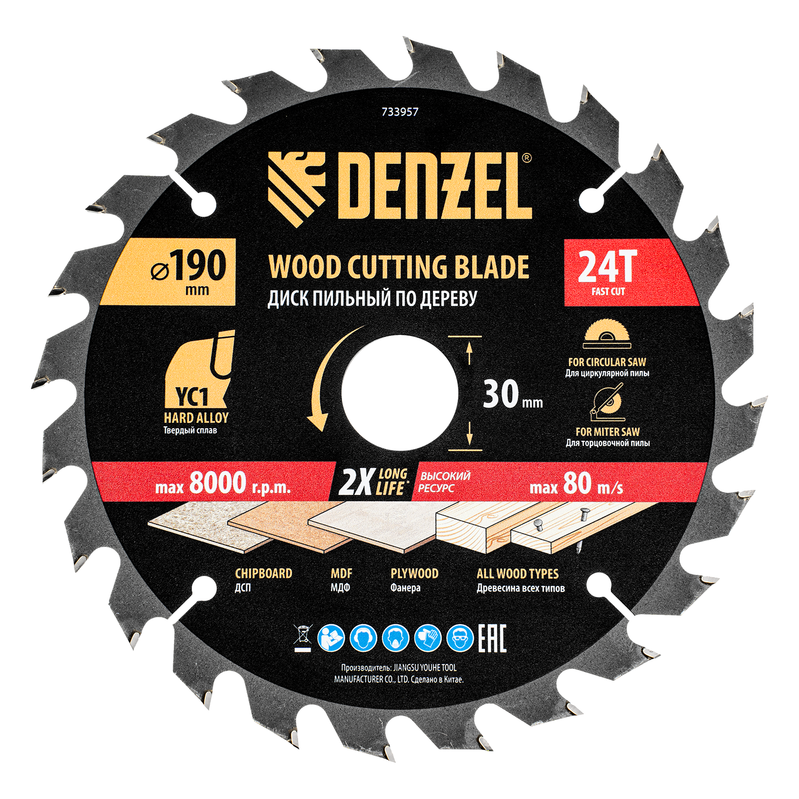 Пильный диск Denzel 733957 диаметром 190 x 30 мм, с 24 зубьями типа ATB, предназначен для быстрого продольного и поперечного распиливания древесины всех типов, в том числе с гвоздями и остатками бетона, а также ДСП, МДФ, фанеры. Режущие пластины из твердого сплава YC1, прошедшие многоступенчатую заточку, позволяют успешно справляться с прочными материалами. Диск устанавливается на циркулярную, торцовочную пилу или на распиловочный станок. В комплект поставки входит переходное кольцо 30/20 мм, позволяющее изменить посадочный диаметр при необходимости.