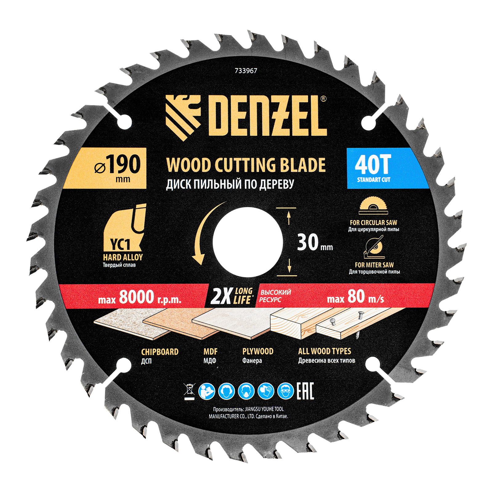 Пильный диск Denzel 733967 диаметром 190 x 30 мм, с 40 зубьями типа ATB, предназначен для продольного и поперечного распиливания древесины всех типов, в том числе с гвоздями и остатками бетона, а также ДСП, МДФ, фанеры. Тип реза — стандартный. Режущие пластины из твердого сплава YC1, прошедшие многоступенчатую заточку, позволяют успешно справляться с прочными материалами. Диск устанавливается на циркулярную, торцовочную пилу или на распиловочный станок. В комплект поставки входит переходное кольцо 30/20 мм, позволяющее изменить посадочный диаметр при необходимости.