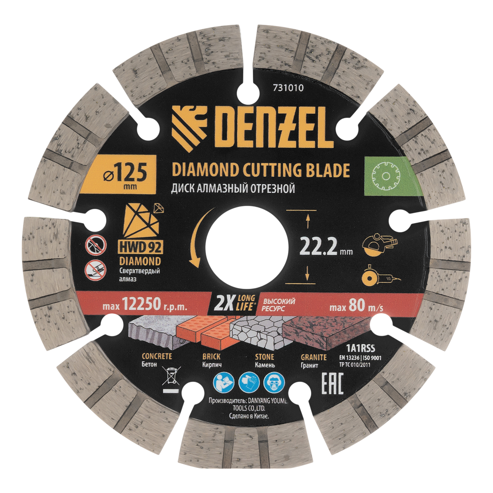 Алмазный отрезной диск Denzel 731010 диаметром 125 x 22,2 мм, с сегментной рабочей частью и слоем сверхтвердых алмазов HWD92, предназначен для сухого резания бетона, камня, кирпича, гранита. Используется с углошлифовальной машиной (УШМ) или штроборезом, поддерживающими частоту вращения 12250 об/мин.
