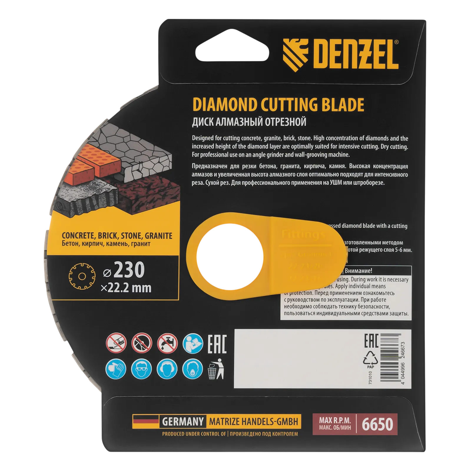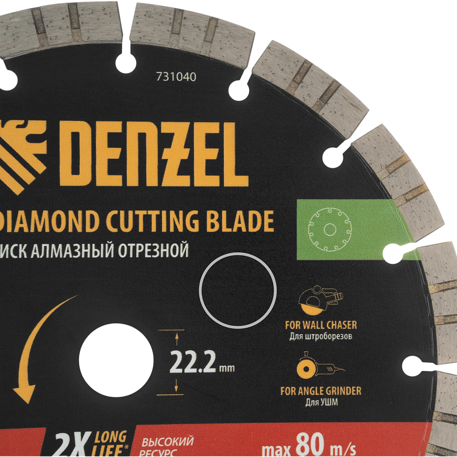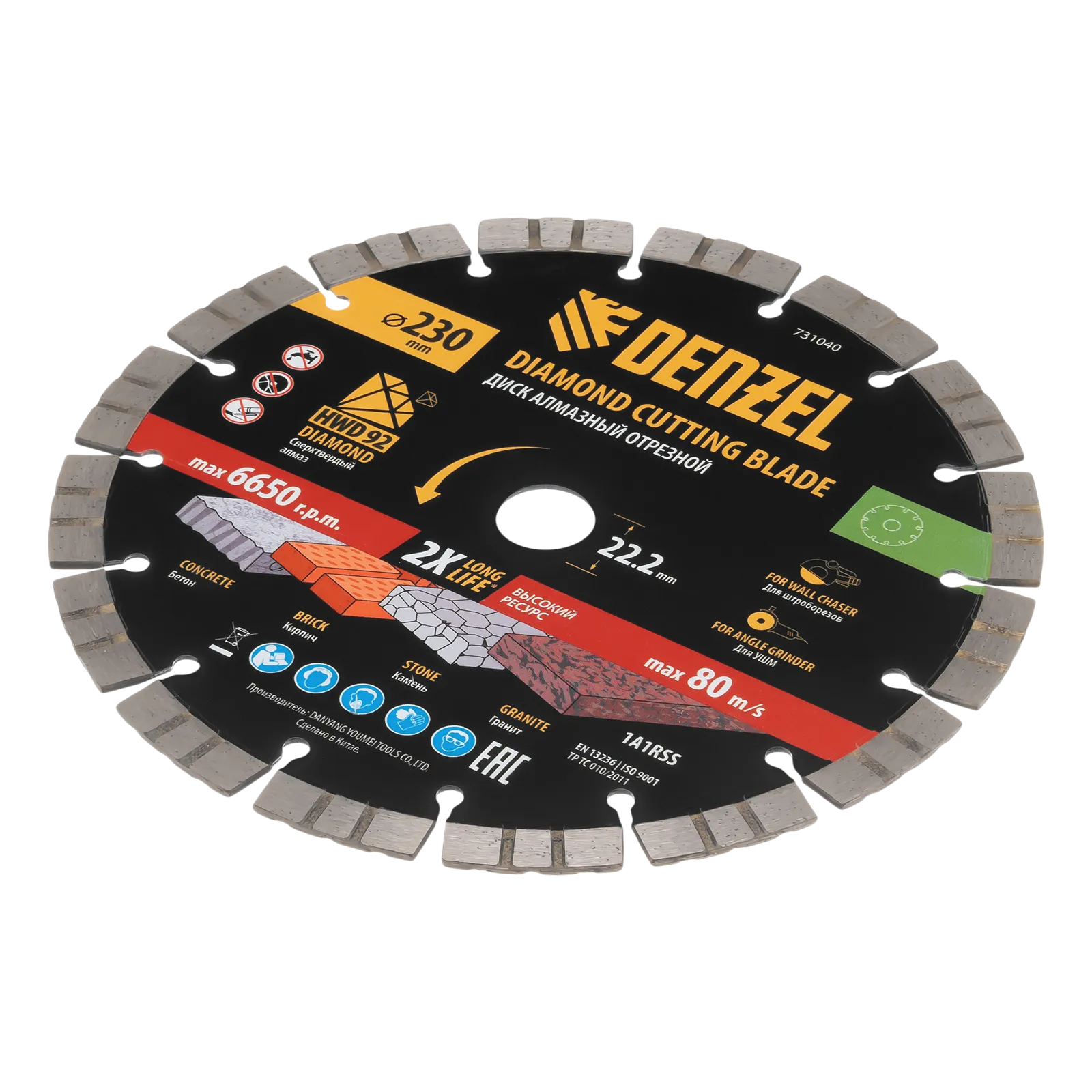 Алмазный отрезной диск Denzel 731040 диаметром 230 x 22,2 мм, с сегментной рабочей частью и слоем сверхтвердых алмазов HWD92, предназначен для сухого резания бетона, камня, кирпича, гранита. Используется с углошлифовальной машиной (УШМ) или штроборезом, поддерживающими частоту вращения 6650 об/мин.