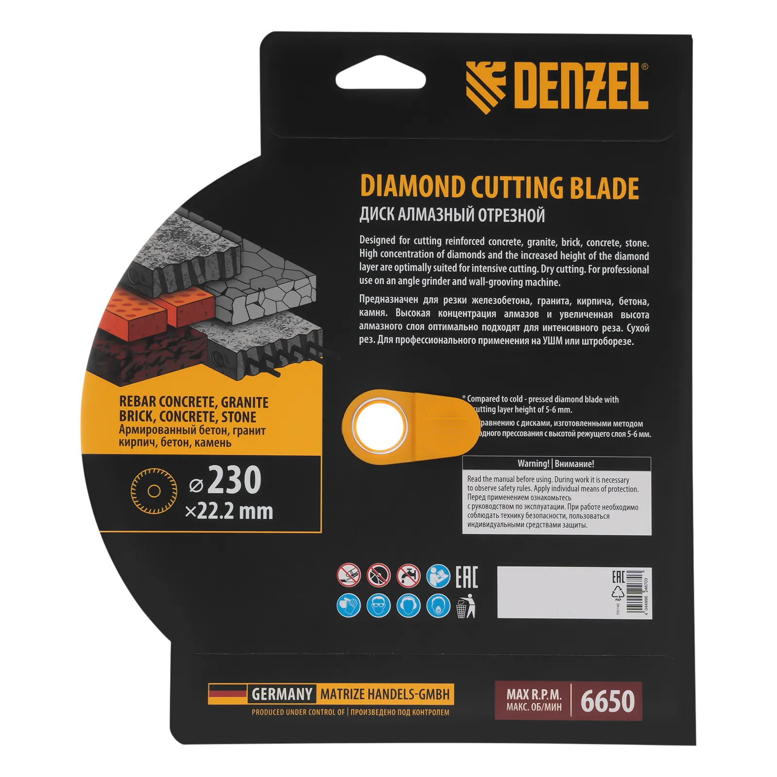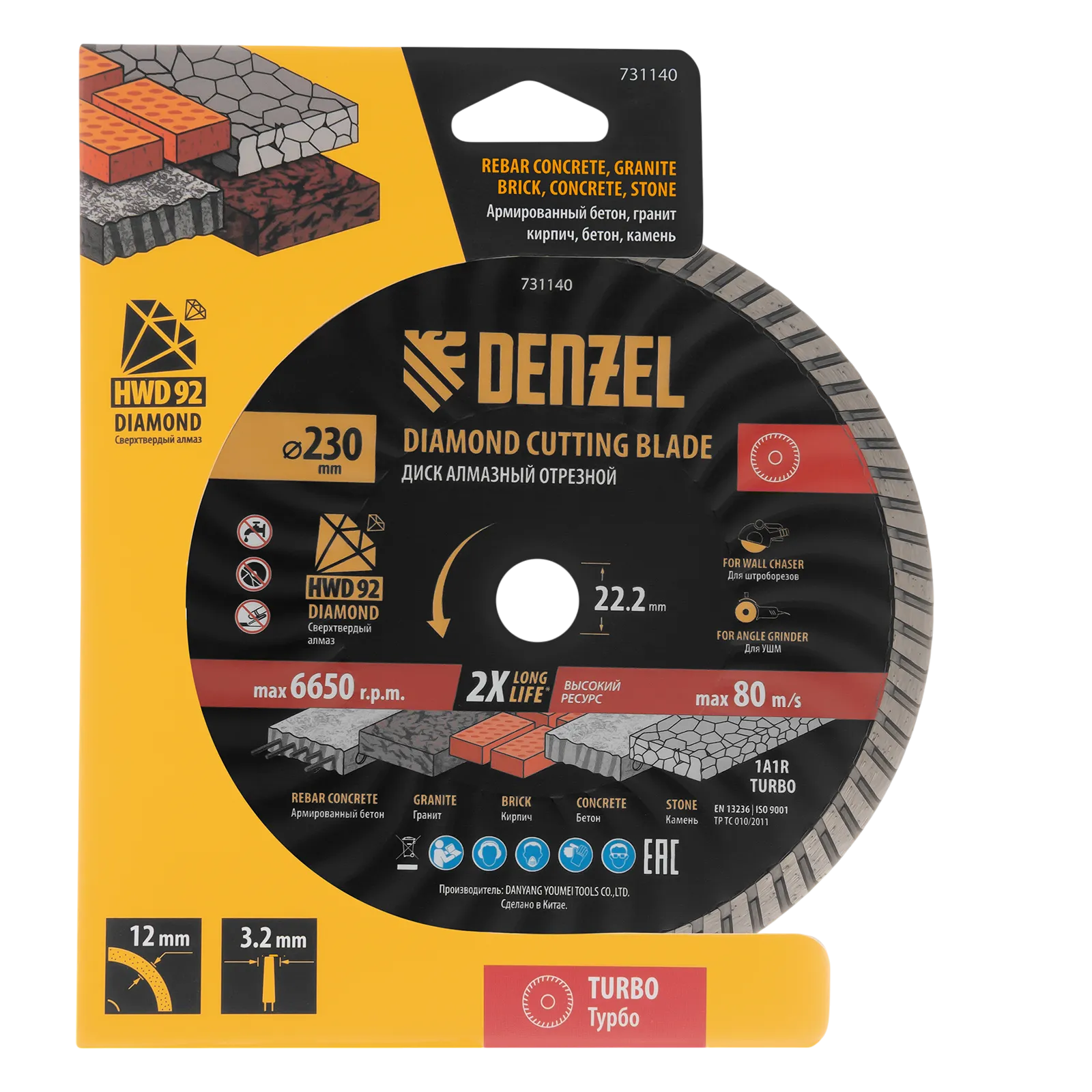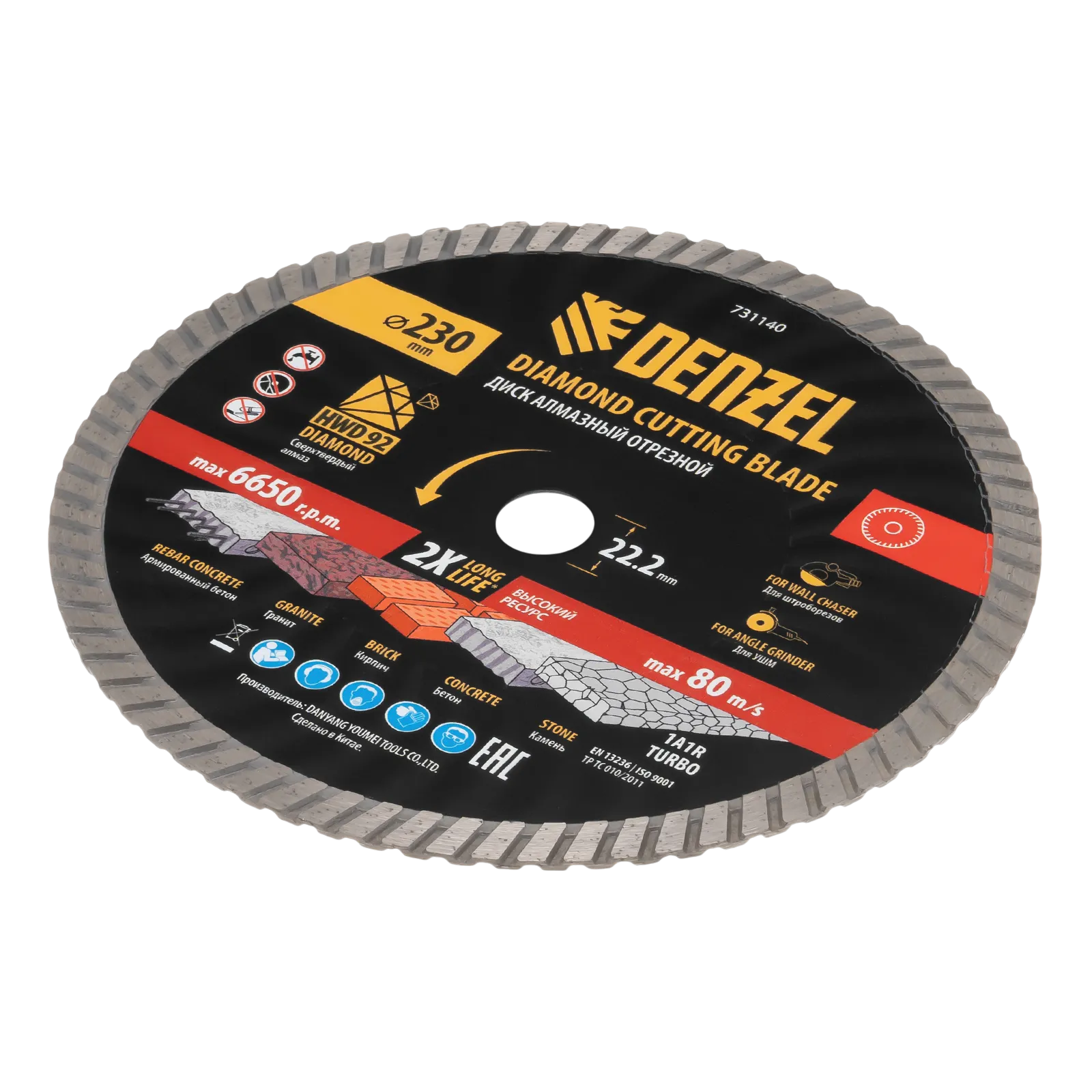 Алмазный отрезной диск Турбо Denzel HWD92 731140 диаметром 230 мм, с посадочным размером 22,2 мм и слоем сверхтвердых алмазов HWD92, устанавливается на углошлифовальную машину (УШМ) или штроборез. Используется для сухого резания камня, бетона (в том числе армированного), гранита, кирпича. Рекомендуемая частота вращения — 6650 об/мин.